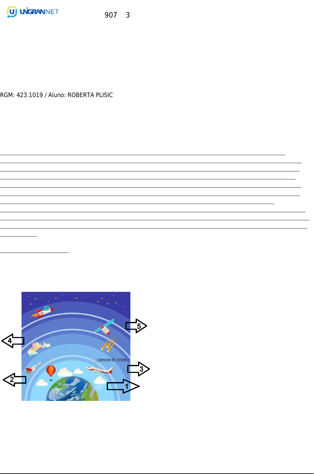 <p>GABARITO</p><p>Protocolo: 907193</p><p>Página 1 - 08/10/2024 às 11:52</p><p>Prova</p><p>Data de aplicação: 05/09/2024</p><p>Curso: Engenharia Ambiental e Sanitária</p><p>Disciplina: Qualidade do Ar</p><p>Ano: 20242 / Semestre: 8</p><p>RGM: 423.1019 / Aluno: ROBERTA PLISIC</p><p>PROVA 01</p><p>Questão 1</p><p>Explique com suas palavras o que é o inventário de emissões gasosas, e por que é importante realizá-lo?</p><p>Resposta do aluno: Os inventários de emissões de poluentes atmosféricos são instrumentos de gestão</p><p>ambiental utilizados por instituições públicas e privadas para identificar, quantificar e gerenciar as emissões</p><p>numa dada área geográfica e num dado período de tempo. Ou seja, o inventário de emissões gasosas é um</p><p>levantamento detalhado que indica e quantifica as emissões de gases poluentes ou de efeito estufa (GEE)</p><p>liberados por uma fonte, como indústrias, transportes, ou até uma cidade inteira. A imoportância de realizar</p><p>esse inventário está na sua função como uma ferramenta fundamental para o monitoramento e controle da</p><p>poluição. Ele permite que governos e empresas compreendam a origem e o volume das emissões,</p><p>possibilitando a criação de estratégias de mitigação e adaptação, como a implementação de energias limpas,</p><p>políticas ambientais, e adoção de práticas sustentáveis. Nessa perspectiva, um inventário possibilita identificar</p><p>as principais tipologias de fontes emissoras, onde, como, quando e quanto os diversos poluentes atmosféricos</p><p>são emitidos.</p><p>Parecer do professor: Ok</p><p>Questão 2</p><p>Segundo a classificação térmica da atmosfera, relacione o nome das camadas.</p><p>GABARITO</p><p>Protocolo: 907193</p><p>Página 2 - 08/10/2024 às 11:52</p><p>Resposta do aluno: 1) Troposfera 2) Estratosfera 3) Mesosfera 4) Termosfera 5) Exosfera</p><p>Parecer do professor: OK</p><p>Questão 3</p><p>Leia o anunciado e assinale a alternativa correta.</p><p>“É considerada a camada mais fria da atmosfera, podendo chegar até -133°C a cerca de 90 km de altitude;</p><p>outra característica desta camada é o fenômeno da combustão dos meteoritos, de suma importância para</p><p>impedir que estes caiam sobre a Terra”</p><p>a) Estratosfera</p><p>b) Troposfera</p><p>c) Exosfera</p><p>d) Termosfera</p><p>e) Mesosfera (correta)</p><p>Questão 4</p><p>Leia as seguintes afirmações e assinale a alternativa correta.</p><p>1. As fontes de contaminação estacionárias geralmente são mais difíceis de serem identificadas, avaliadas e</p><p>controladas;</p><p>2. Dentro das fontes de poluição atmosférica podemos mencionar as fontes de poluição química e a poluição</p><p>sonora;</p><p>3. As fontes estacionárias de poluição sonora são marcadas por atividades fixas que emitem ruídos como os</p><p>processos e operações industriais;</p><p>4. A poluição química estacionária é marcada pelas indústrias (liberação de gases tóxicos oriundos da queima</p><p>de combustível fóssil ou matéria orgânica, do processo de fermentação e decomposição).</p><p>a) Está correto o que se afirmar nas alternativas 1, 2 e 4.</p><p>b) Está correto o que se afirmar nas alternativas 1, 2 e 3.</p><p>c) Está correto o que se afirmar nas alternativas 2, 3 e 4. (correta)</p><p>d) Está correto o que se afirmar nas alternativas 1, 3 e 4.</p><p>e) Todas as alternativas estão corretas.</p><p>Questão 5</p><p>Assinale a alternativa que não condiz como uma característica do PRONAR.</p><p>a) Visa a uma melhoria na qualidade do ar.</p><p>b) Cumpre com o atendimento aos padrões estabelecidos.</p><p>c) O não comprometimento da qualidade do ar em áreas consideradas não degradadas.</p><p>d) Visa impedir o desenvolvimento de atividades potencialmente poluidoras. (correta)</p><p>e) Compete ao Instituto Brasileiro do Meio Ambiente e dos Recursos Naturais Renováveis – IBAMA o</p><p>gerenciamento do PRONAR.</p><p>Questão 6</p><p>Os poluentes atmosféricos tem a capacidade de alterar as condições físicas e químicas do meio</p><p>ambiente e trazer consigo vários danos ao meio ambiente. Assim podemos mencionar que:</p><p>“Os ____________________ são precursores para a formação do ozônio troposférico e apresentam potencial</p><p>causador de efeito estufa (metano). Já os _________________ são gases e vapores emitidos pelos veículos, pelas</p><p>indústrias, pelos processos de estocagem e transferência de combustível e o ______________ é um gás incolor e</p><p>inodoro liberado pela queima incompleta de combustíveis de origem orgânica (combustíveis fósseis, biomassa</p><p>etc.)”.</p><p>Escolha a alternativa que completa a frase.</p><p>GABARITO</p><p>Protocolo: 907193</p><p>Página 3 - 08/10/2024 às 11:52</p><p>a) Hidrocarbonetos, Monóxido de Carbono (CO) e Compostos Orgânicos Voláteis (COVs).</p><p>b) Hidrocarbonetos, Compostos Orgânicos Voláteis e Monóxido de Carbono (CO). (correta)</p><p>c) Monóxido de Carbono (CO), Compostos Orgânicos Voláteis (COVs) e Óxidos de Nitrogênio (NOx).</p><p>d) Óxidos de Nitrogênio (NOx), Monóxido de Carbono (CO) e Hidrocarbonetos (HC).</p><p>e) Monóxido de Carbono (CO), Óxidos de Nitrogênio (NOx) e Hidrocarbonetos (HC).</p><p>Questão 7</p><p>Leia o enunciado e assinale a alternativa correta.</p><p>1 – Na termosfera as temperaturas sofrem amplas variações diurnas e sazonais, sendo mais altas durante o dia</p><p>e durante a máximas de luz solar;</p><p>2 – A estratosfera é a terceira camada da atmosfera, considerada o protetor solar da Terra, pois é nela que se</p><p>abriga a maior concentração de ozônio;</p><p>3 – A fronteira da mesosfera com a termosfera é considerada a parte mais quente de toda atmosfera;</p><p>4 – A proporção da exosfera vai de 700 km até 1000 km de altitude desde a superfície;</p><p>5 – A homosfera atinge os primeiros 100 km de altitude e seus principais gases são 
