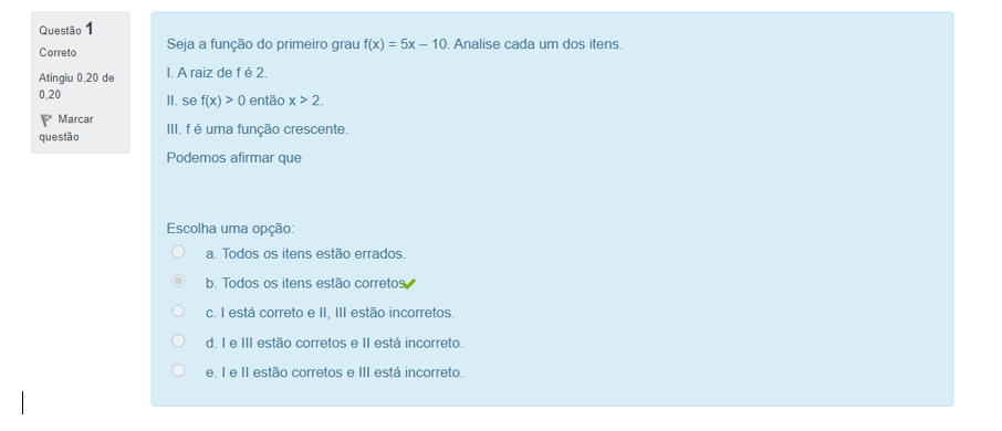Questão 1 Correto Seja a função do primeiro grau f(x) = 5x - 10. Analise cada um dos Atingiu de I. A raiz de f é 2. II. se f(x) > 0 então X > 2. Marcar questão III. f é uma função Podemos afirmar que Escolha uma opção: a Todos os itens estão b. Todos os itens estão corretos C. I está correto e II, III estão incorretos. I e III estão corretos e II está I e II estão corretos e III está incorreto.