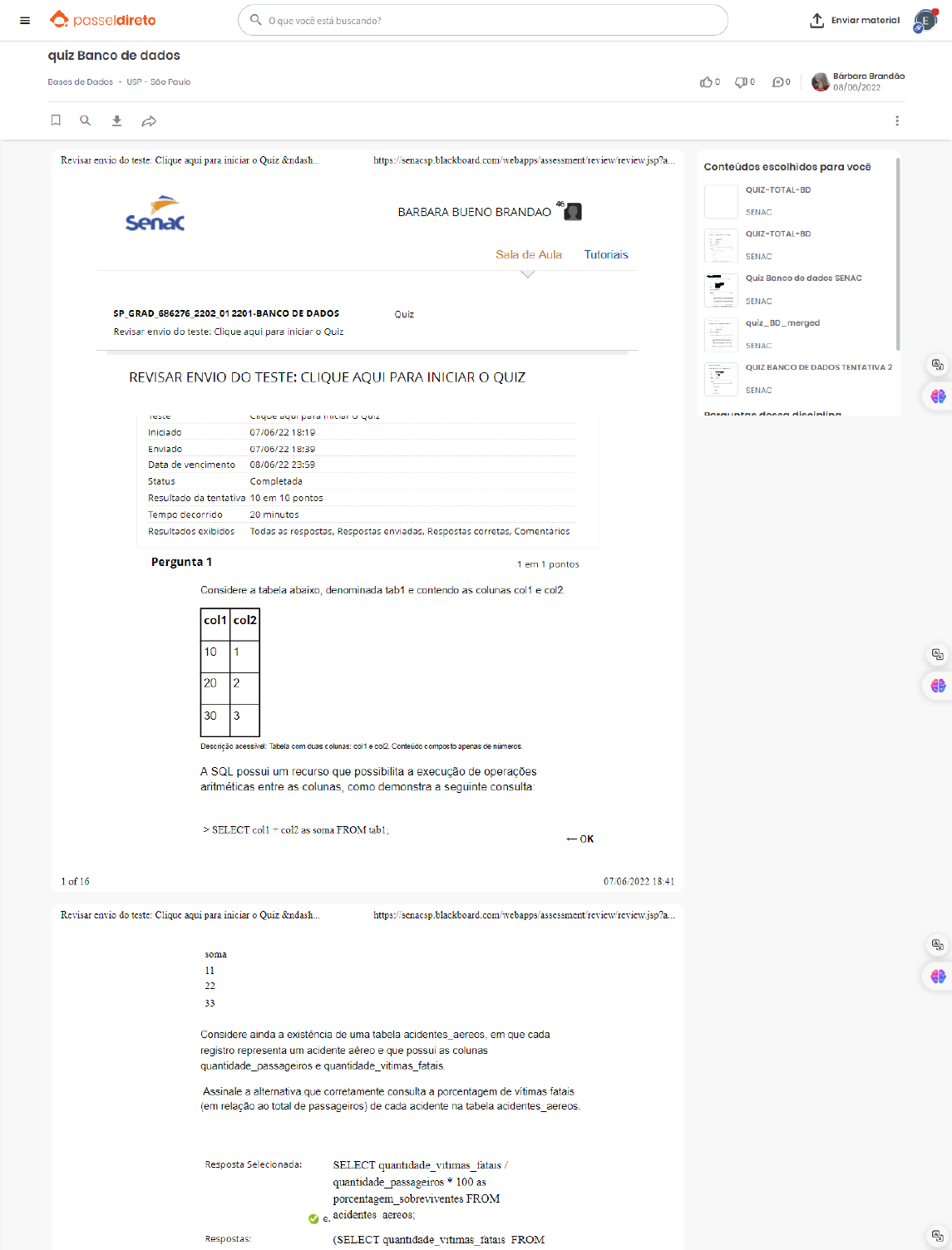 passeidireto o que você está buscando? Enviar material quiz Banco de dados Brandão Bases de Dados USP - São Paulo 0 0 08/06/2022 : Revisar envio do teste: Clique aqui para iniciar o Quiz &ndash... Conteúdos escolhidos para você QUIZ-TOTAL-BD 46 BARBARA BUENO BRANDAO SENAC Senac QUIZ-TOTAL-BD Sala de Aula Tutoriais SENAC Quiz Banco de dados SENAC SENAC DADOS Quiz quiz_BD_merged Revisar envio do teste: Clique aqui para iniciar Quiz SENAC QUIZ BANCO DE DADOS TENTATIVA 2 REVISAR ENVIO DO TESTE: CLIQUE AQUI PARA INICIAR O QUIZ SENAC reste Iniciado 07/06/22 18:19 Enviado 18:39 Data de vencimento 08/06/22 23:59 Status Completada Resultado da tentativa 10 em 10 pontos Tempo decorrido 20 minutos Resultados exibidos Todas as respostas, Respostas enviadas, Respostas corretas, Comentários Pergunta 1 1 em pontos Considere a tabela abaixo, denominada tab1 e contendo as colunas col1 e col2. col1 col2 10 1 20 2 30 3 Descrição Tabela com duas col1 e col2. Conteúdo composto apenas de A SQL possui um recurso que possibilita a execução de operações aritméticas entre as colunas, como demonstra a seguinte consulta: > SELECT coll + col2 as soma FROM 1 of 16 07/06/2022 18:41 Revisar envio do teste: Clique aqui para iniciar o Quiz soma 11 22 33 Considere ainda a existência de uma tabela em que cada registro representa um acidente aéreo e que possui as colunas quantidade_passageiros e Assinale a alternativa que corretamente consulta a porcentagem de vítimas fatais (em relação ao total de passageiros) de cada acidente na tabela Resposta Selecionada: SELECT quantidade vitimas fatais / quantidade passageiros * 100 as porcentagem sobreviventes FROM e. acidentes Respostas: (SELECT quantidade vitimas FROMacidentes aereos) / (SELECT quantidade passageiros FROM acidentes aereos) a. * 100; SELECT FROM b. acidentes aereos; SELECT IN acidentes aereos VALUE quantidade vitimas fatais / quantidade passageiros * 100 as porcentagem sobreviventes; SELECT quantidade_vitimas_fatais FROM quantidade_passageiros * 100 IN d. acidentes aereos; SELECT quantidade vitimas fatais / quantidade passageiros * 100 as porcentagem sobreviventes FROM acidentes aereos; Comentário da e. Para obter a porcentagem de vítimas é preciso dividir, em cada multiplicar essa proporção por 100. 2 of 16 07/06/2022 18:41 Revisar envio do teste: Clique aqui para iniciar o Quiz Pergunta 2 1 em pontos Considere uma tabela que registre as doações recebidas pelos partidos políticos para as eleições de 2014 no estado de São Paulo (Fonte: http://dados.gov.br/data Considere que a tabela doacoes possui um schema conforme o seguinte CREATE TABLE doacoes ( UF, SiglaPartido, DataReceita, Valor REAL, TipoReceita, FonteRecurso, EspecieRecurso, DescricaoReceita, DocumentoDoador, NomeDoador Considere agora a seguinte consulta SQL: SELECT SiglaPartido, sum(Valor) as total_recebido FROM doacoes GROUP BY SiglaPartido ORDER BY total recebido DESC LIMIT 5: Assinale a alternativa que indica qual saída o comando acima pode produzir. Resposta Selecionada: SiglaPartido total_recebido PSDB 57058765.03 PT 37767199.76 SD 18960025.0 PSD 17706828.38 PMDB 8748201.0 e. Respostas: a. You have an error in your SQL syntax 3 16 07/06/2022 18:41Revisar envio do teste: Clique aqui para iniciar Quiz SiglaPartido total_recebido PCO 91.66 PCB 6950.0 PRTB 7327.9 PDT 10000.0 PSC 18620.0 b. SiglaPartido Valor PSDB 50000.0 PSB 50000.0 PT 700000.0 PT 1615000.0 C. PT 500000.0 SiglaPartido total_recebido PSDB 57058765.03 d. SiglaPartido total_recebido PSDB 57058765.03 PT 37767199.76 SD 18960025.0 PSD 17706828.38 PMDB 8748201.0 e. Comentário e. "GROUP BY SiglaPartido" indica que cada partido deve aparecer da resposta: somente uma vez na saída. o LIMIT 5 indica que a saída deve ter que a Pergunta 3 1 em pontos 6.1.2.1 Orientações do usuário final para a segurança de senha Use a opção -password = password ou -ppassword na linha de Por exemplo: shell> mysql -u francis -pfrank db_name 4 of 16 07/06/2022 18:41 Revisar envio do teste: Clique aqui para iniciar Quiz Aviso Isso é conveniente, mas inseguro. Em alguns sistemas, sua senha fica visível para programas de status do sistema, como ps, que podem ser invocados por outros usuários para exibir linhas de comando. Os clientes MySQL geralmente substituem o argumento da senha da linha de comandos com zeros durante sua sequência de No entanto, ainda há um breve intervalo durante o qual o valor é Além disso, em alguns sistemas, essa estratégia de substituição é ineficaz e a senha permanece visível para o ps. (Os sistemas SystemV Unix e talvez outros estejam sujeitos a esse problema.) Se seu ambiente operacional estiver configurado para exibir seu comando atual na barra de título da janela do terminal, a senha permanecerá visível enquanto o comando estiver em execução, mesmo se comando já estiver fora de vista. MySQL 8.0 Reference Manual 2020.trecho acima do manual do MySQL explica que um determinado método de login possui um certo risco de segurança. Indique qual seria uma alternativa segura ao método discutido. Resposta a. Selecionada: Logar com a opção -p sem passar o parâmetro (senha) no comando, que fará com que a senha seja lida a partir de um prompt seguro Respostas: a. Logar com a opção -p sem passar parâmetro (senha) no comando, o que fará com que a senha seja lida a partir de um prompt seguro do terminal. b. Logar com a opção -p sem passar o parâmetro (senha) no comando, que fará com que usuário anônimo seja utilizado. C. 5 of 16 07/06/2022 18:41 Revisar envio do teste: Clique aqui para iniciar o Quiz Logar como o discutido, passando a senha na linha de comando, mas especificando o uso de uma conexão SSL segura entre cliente e banco de d. Logar como o discutido, passando a senha na linha de comando, mas usando um contêiner Docker. e. o manual do MySQL está defasado. Na última versão disponível do MySQL, o método discutido é inteiramente seguro. Comentário da Com a senha sendo d