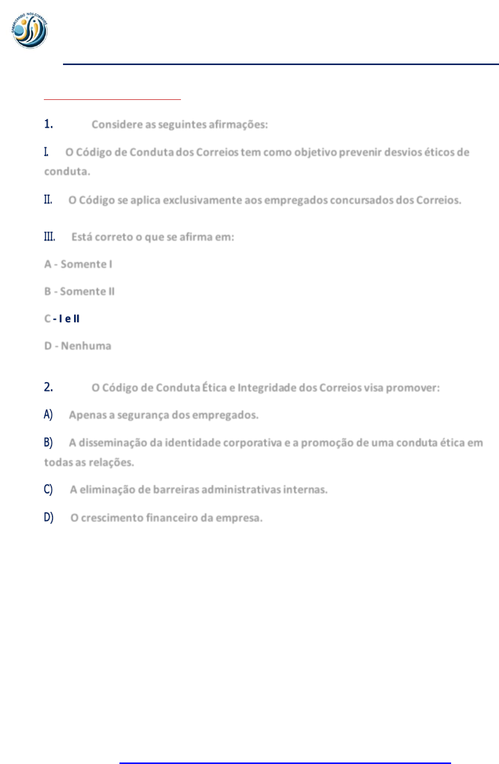 Simuladão Completo sobre o Código de Conduta Ética e Integridade dos Correios https://www.youtube.com/@GabaritandonosCorreios Módulo 1 – Capítulos I e II Considere as seguintes afirmações: O Código de Conduta dos Correios tem como objetivo prevenir desvios éticos de conduta. O Código se aplica exclusivamente aos empregados concursados dos Correios. Está correto o que se afirma em: A - Somente I B - Somente II C D - Nenhuma O Código de Conduta Ética e Integridade dos Correios visa promover: Apenas a segurança dos empregados. A disseminação da identidade corporativa e a promoção de uma conduta ética em todas as relações. A eliminação de barreiras administrativas internas. O crescimento financeiro da empresa. https://www.youtube.com/@GabaritandonosCorreios Simuladão Completo sobre o Código de Conduta Ética e Integridade dos Correios https://www.youtube.com/@GabaritandonosCorreios Considere as seguintes afirmações: O Código de Conduta Ética e Integridade também abrange sanções em caso de descumprimento. O Código de Conduta Ética e Integridade é aplicável apenas às relações comerciais entre a empresa e seus fornecedores. Está correto o que se afirma em: A - Somente I B - Somente II C D – Nenhuma " é o conjunto de normas que visa à prevenção de desvios éticos de conduta e promove a disseminação da identidade corporativa dos Correios." Complete a frase acima com as seguintes palavras: O Conselho de Administração A Lei de Licitações A Ouvidoria O Código de Conduta Ética e Integridade Considere as seguintes afirmações: Caio, funcionário dos Correios, deve sempre agir conforme os princípios éticos estabelecidos pelo Código de Conduta. Joana, uma prestadora de serviços temporária, também é obrigada a seguir as normas do Código. https://www.youtube.com/@GabaritandonosCorreios Simuladão Completo sobre o Código de Conduta Ética e Integridade dos Correios https://www.youtube.com/@GabaritandonosCorreios Está correto o que se afirma em: A - Somente I B - Somente II C D - Nenhuma O Código de Conduta dos Correios aplica-se a quais categorias? Apenas aos empregados contratados diretamente. Somente aos membros da Diretoria Executiva. A todos os empregados, terceirizados, estagiários, servidores cedidos e prestadores de serviços. Exclusivamente aos membros dos Conselhos de Administração. Considere as seguintes afirmações: O compromisso com o Código de Conduta é prestado no momento da assinatura de contrato ou posse. A observância ao Código de Conduta é obrigatória apenas para os funcionários diretos dos Correios. Está correto o que se afirma em: A - Somente I B - Somente II C D - Nenhuma https://www.youtube.com/@GabaritandonosCorreios Simuladão Completo sobre o Código de Conduta Ética e Integridade dos Correios https://www.youtube.com/@GabaritandonosCorreios Ǫual é a responsabilidade dos prestadores de serviços em relação ao Código de Conduta Ética e Integridade? Nenhuma, pois não são funcionários efetivos dos Correios. Atuar de acordo com o contrato, sem precisar seguir o Código de Conduta Ética e Integridade. Somente seguir normas internas de segurança. Observar o disposto no Código de Conduta Ética e Integridade ao executar suas atividades para os Correios. Com relação à observância do Código de Conduta pelos terceirizados e prestadores de serviços, marque a alternativa correta: Os prestadores de serviços não precisam seguir o Código, pois não são funcionários diretos. É exigido que os prestadores assumam a obrigação de observar o Código no momento da assinatura dos contratos. Está correto o que se afirma em: Nenhuma das afirmativas está correta. Somente a afirmativa I está correta. Somente a afirmativa II está correta. Ambas as afirmativas estão corretas. " devem prestar compromisso de acatamento ao Código de Conduta Ética e Integridade dos Correios no ato da posse ou assinatura de contrato." Complete a frase acima: Apenas os Diretores Executivos. Todos os funcionários, estagiários e prestadores de serviços. Somente os Conselheiros. https://www.youtube.com/@GabaritandonosCorreios Simuladão Completo sobre o Código de Conduta Ética e Integridade dos Correios https://www.youtube.com/@GabaritandonosCorreios Apenas os empregados concursados. Ǫuais são as obrigações dos Correios em relação ao Código de Conduta Ética e Integridade para terceiros? Estender o Código apenas a funcionários temporários. Incluir o Código de Conduta nos contratos. Garantir que o compromisso com o Código esteja incluído em editais de licitação e contratos administrativos. Não há obrigação específica quanto aos prestadores de serviços. Assinale V (verdadeiro) ou F (falso) para as afirmações a seguir: ( ) O Código de Conduta é obrigatório para prestadores de serviços e estagiários. ( ) No ato de posse ou assinatura de contrato, os envolvidos devem se comprometer a seguir o Código. ( ) Apenas os funcionários diretos dos Correios estão sujeitos às normas do Código. A sequência correta é: V, V, F V, F, F F, F, V F, V, V Em relação às responsabilidades de orientação aos prestadores de serviços, qual é o papel dos profissionais dos Correios? Não têm responsabilidades formais sobre os prestadores. Devem orientar os prestadores de serviços para que observem as normas do Código. Somente orientar em casos de denúncias. Apenas orientar os empregados diretos, sem incluir prestadores de serviços. https://www.youtube.com/@GabaritandonosCorreios Simuladão Completo sobre o Código de Conduta Ética e Integridade dos Correios https://www.youtube.com/@GabaritandonosCorreios Considere as seguintes afirmações: Mário, prestador de serviços terceirizado, foi orientado a seguir o Código de Conduta dos Correios. Graco, servidor cedido, não está sujeito às normas do Código, pois não faz parte do quadro efetivo. Está correto o que se afirma em: Somente I Somente II Nenhu