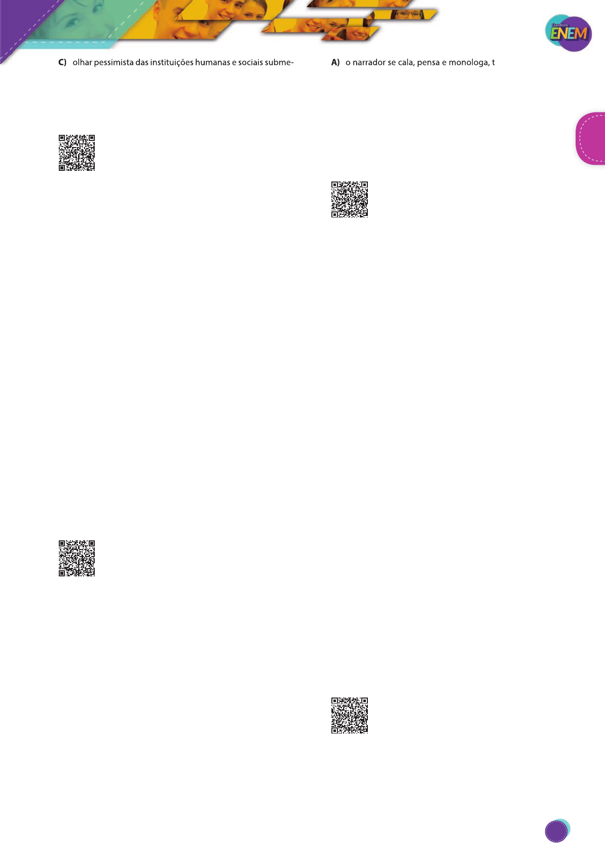 C) olhar pessimista das instituições humanas e sociais subme- tidas ao conflito armado. D) exortação à solidariedade para a reconstrução dos espaços urbanos bombardeados. E) espírito de contestação capaz de subverter a condição de vítima dos povos afetados. 29. (Enem-2015) Cântico VI Tu tens um medo de Acabar. Não vês que acabas todo o dia. Que morres no amor. Na tristeza. Na dúvida. No desejo. Que te renovas todo dia. No amor. Na tristeza. Na dúvida. No desejo. Que és sempre outro. Que és sempre o mesmo. Que morrerás por idades imensas. Até não teres medo de morrer. E então serás eterno. (MEIRELES, C. Antologia poética. Rio de Janeiro: Record, 1963.) A poesia de Cecília Meireles revela concepções sobre o homem em seu aspecto existencial. Em “Cântico VI”, o eu lírico exorta seu interlocutor a perceber, como inerente à condição humana, A) a sublimação espiritual graças ao poder de se emocionar. B) o desalento irremediável em face do cotidiano repetitivo. C) o questionamento cético sobre o rumo das atitudes humanas. D) a vontade inconsciente de perpetuar-se em estado adolescente. E) um receio ancestral de confrontar a imprevisibilidade das coisas. 30. (Enem-2015) Famigerado Com arranco, [o sertanejo] calou-se. Como arre- pendido de ter começado assim, de evidente. Contra que aí estava com o fígado em más margens; pensava, pensava. Cabismeditado. Do que, se resolveu. Levantou as feições. Se é que se riu: aquela crueldade de dentes. Encarar, não me encarava só se fito à meia esguelha. Latejava-lhe um orgulho indeciso. Redigiu seu monologar. O que frouxo falava: de outras, diversas pessoas e coisas, da Serra, do São Ão, travados assuntos, insequentes, como dificultação. A conversa era para teias de aranha. Eu tinha de entender-lhe as mínimas entonações, seguir seus propósitos e silêncios. Assim no fechar-se com o jogo, sonso, no me iludir, ele enigmava. E, pá: — Vosmecê agora me faça a boa obra de querer me ensinar o que é mesmo que é: fasmisgerado... faz-me-gerado... falmis- geraldo... familhas-gerado...? (ROSA, J. G. Primeiras estórias. Rio de Janeiro: Nova Fronteira, 1988.) A linguagem peculiar é um dos aspectos que confere a Guimarães Rosa um lugar de destaque na literatura brasileira. No fragmento lido, a tensão entre a personagem e o narrador se estabelece porque A) o narrador se cala, pensa e monologa, tentando assim evi- tar a perigosa pergunta de seu interlocutor. B) o sertanejo emprega um discurso cifrado, com enigmas, como se vê em “a conversa era para teias de aranha. C) entre os dois homens cria-se uma comunicação impossível, decorrente de suas diferenças socioculturais. D) a fala do sertanejo é interrompida pelo gesto de impaciên- cia do narrador, decidido a mudar o assunto da conversa. E) a palavra desconhecida adquire o poder de gerar incomunicáveis. 31. (Enem-2015) Texto I Versos de amor A um poeta erótico Oposto ideal ao meu ideal conservas. Diverso é, pois, o ponto outro de vista Consoante o qual, observo o amor, do egoísta Modo de ver, consoante o qual, o observas. Porque o amor, tal como eu o estou amando, É espírito, é éter, é substância fluida, É assim como o ar que a gente pega e cuida, Cuida, entretanto, não o estar pegando! É a transubstanciação de instintos rudes, Imponderabilíssima, e impalpável, Que anda acima da carne miserável Como anda a garça acima dos açudes! (ANJOS, A. Obra completa. Rio de Janeiro: Nova Aguilar, 1996. Fragmento.) Texto II Arte de amar Se queres sentir a felicidade de amar, esquece a tua alma. A alma é que estraga o amor. Só em Deus ela pode encontrar satisfação. Não noutra alma. Só em Deus – ou fora do mundo. As almas são incomunicáveis. Deixa o teu corpo entender-se com outro corpo. Porque os corpos se entendem, mas as almas não. (BANDEIRA, M. Estrela da vida inteira. Rio de Janeiro: Nova Fronteira, 1993.) Os textos I e II apresentam diferentes pontos de vista sobre o tema amor. Apesar disso, ambos definem esse sentimento a partir da oposição entre A) satisfação e insatisfação. B) egoísmo e generosidade. C) felicidade e sofrimento. D) corpo e espírito. E) ideal e real. 32. (Enem-2015) Vei, a Sol Ora o pássaro careceu de fazer necessidade, fez e o herói ficou escorrendo sujeira de urubu. Já era de madrugadinha e o tempo estava inteiramente frio. Macunaíma acordou tremendo, todo lambuzado. Assim mesmo examinou bem a pedra mirim da ilhota para vê si não havia alguma cova com dinheiro enterrado. Não havia não. Nem a correntinha en- cantada de prata que indica pro escolhido, tesouro de holandês. Havia só as formigas jaquinitas ruivinhas. C) olhar pessimista das instituições humanas e sociais subme- A) o narrador se cala, pensa e monologa, tentando assim evi- LiteraturaLiteratura LiteraturaLiteratura 91 PG18EA445SD00_QE_2018_MIOLO.indb 91 26/02/2018 16:42:09