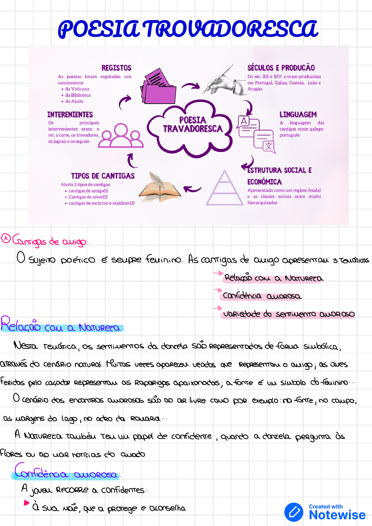 POESIA REGISTOS SÉCULOS E As poesias foram nos Do séc. XII a XIV. e eram produzidas cancioneiros: em Portugal, Galiza, Castela, Leão e da Vaticana Aragão da Biblioteca da Ajuda INTERENIENTES LINGUAGEM Os principais POESIA A A linguagem das intervenientes eram: o TRAVADORESCA cantigas eram galego- rei, a corte, os português os jograis e os segrais ESTRUTURA SOCIAL E TIPOS DE CANTIGAS ECONÓMICA Havia 3 tipos de cantigas cantigas de amigo(1) Apresentada como um regime feudal Cantigas de amor(2) e as classes sociais eram muito cantigas de escárnio e maldizer(3) hierarquizadas Cantigas de 0 e seupre As de auigo 3 a Natureza confidencia variedade do a da doncela sao de & que 0 as aves Feridas pelo as a e do feuinino 0 dos livRe POR exemplo : no no as do no & A Natureza papel do confidente a a noticias & anado Confidencia A a confidentes a sua que Q e aconselha Created with Notewiseas que suas complices e até Mesuo a que houve seus e Variedade do é pela Quando seu esta, na a OUTROS ela sente-se saudasa, e ansiosa que Q doncela esta felic a are e de RECURSOS expressivos: de foruas de Teu Regularidade e 2 de é As de 2 elogio CORTêS a de Elogio 0 sujeito aua a e e e UN sujeito vassalageu a que colocada sujeito a dava Q mais qualidades, bondade, e 00 a sua de Created with Notewise E DA AMADA.de 0 Sujeito esta ou pela indifeRenca da Essa paixao iRa a a angustia a a MORTE e estilo: : COMO a antitese, de E USA- VERSOS LONGOS a de RegulaRidade e silabas METRICOS 3 de e usadas COMO uva forua de a sociedade e aos Ofrcio da OS dos do vida dos da nobreza cantigas 2 parodia do de do - CRiTica a da auada - a do QUOR CORTêS de - dos fidalgos abuso das Regalias do Created with do na politica NotewiseCantigos de CRiTica as figuras e Nestas usa-se violenta e de Nestas a e feita de forua as figuras e seu e. Usa-se vua linguagen e onde usados TRocadilhos, ou Created with Notewise