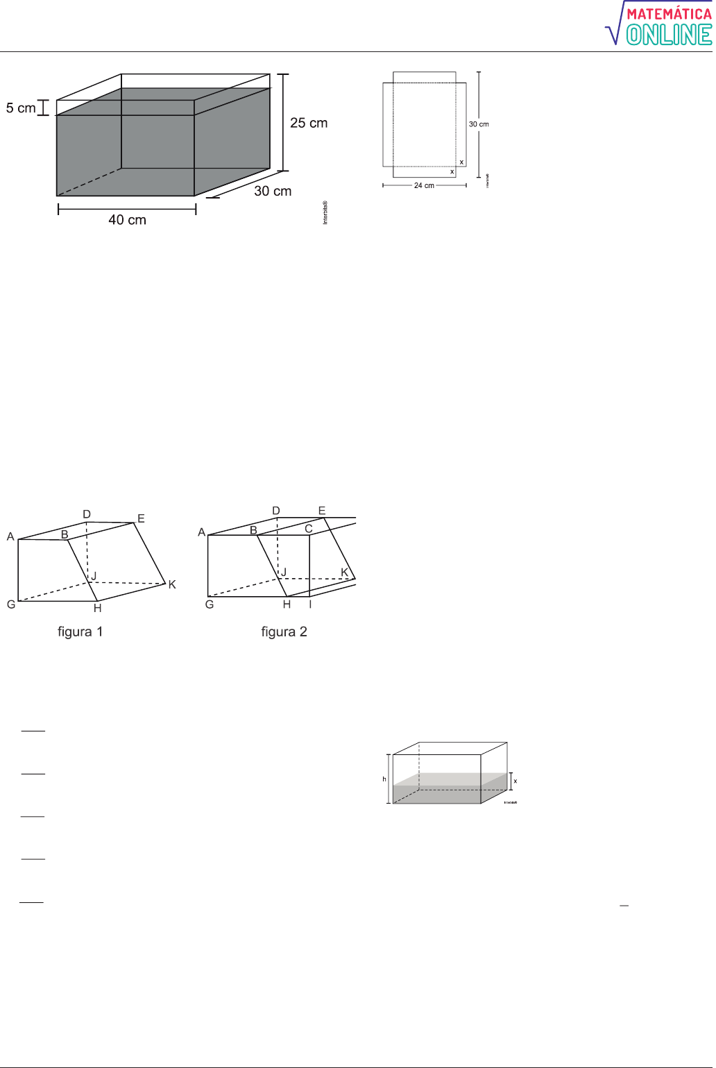 Alisson Marques - online 3 O que aconteceria com o nível da água se colocássemos no tanque um objeto cujo volume fosse de 2 400 cm3? a) O nível subiria 0,2 cm, fazendo a água ficar com 20,2 cm de altura. b) O nível subiria 1 cm, fazendo a água ficar com 21 cm de altura. c) O nível subiria 2 cm, fazendo a água ficar com 22 cm de altura. d) O nível subiria 8 cm, fazendo a água transbordar. e) O nível subiria 20 cm, fazendo a água transbordar. 10. (Uftm 2012) A figura 1 representa um prisma obtido após a secção do paralelepípedo reto- retângulo ADFCGJLI representado na figura 2. Sendo que AB = BC = DE = EF e 4HI = 4KL = JL = 2JG = 2AG = x, o volume do prisma representado na figura 1 é a) 35x . 32 b) 33x . 16 c) 33x . 5 d) 35x . 8 e) 33x . 4 11. (Ucs 2012) Uma caixa aberta é confeccionada a partir de um pedaço de cartolina em forma de um retângulo, do qual se retiraram pequenos quadrados nos vértices, conforme a figura abaixo. Conhecido o valor de x, a expressão que permite calcular o volume da caixa, levando em consideração os dados da figura, é a) 24x – 108x 720 x. b) 24x 720 x. c) 24x 720 x. d) 2x – 54x 720 x. e) 2x 54x 720 x. 12. (G1 - ifsp 2012) Fernando pretende abrir um aquário para visitação pública. Para tanto, pretende construí-lo com a forma de um bloco retangular com 3 m de comprimento, 1,5 m de largura e 2 m de altura. Assim sendo, o volume desse aquário será de a) 6,5 3m . b) 7,0 3m . c) 8,5 3m . d) 9,0 3m . e) 10 3m . 13. (Uern 2012) Uma livraria recebeu caixas cúbicas contendo duas pilhas de livros cada, que preenchem totalmente o espaço no seu interior. Se o total de caixas é igual a 45 e cada livro possui 12 cm de largura e 3 cm de espessura, então o total de livros recebidos é a) 540. b) 450. c) 810. d) 720. 14. (Uftm 2012) A altura, em centímetros, do nível da água armazenada em um reservatório com a forma de um prisma reto de base retangular é igual a x, conforme mostra a figura. Usando todo esse volume de água armazenado, pode-se encher completamente uma quantidade exata de recipientes com capacidade de 20 litros cada, ou uma quantidade exata de recipientes com capacidade de 50 litros cada. Se hx , 3 onde h é a altura do reservatório, então a menor capacidade, em litros, desse reservatório cheio é a) 200. b) 300. c) 400. d) 500. e) 600. 15. (Mackenzie 2012)
