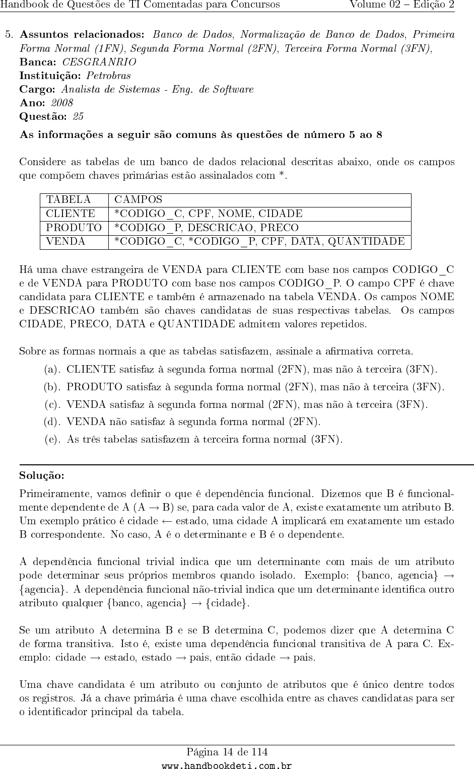 (a). CLIENTE satisfaz à segunda forma normal (2FN), mas não à terceira (3FN).