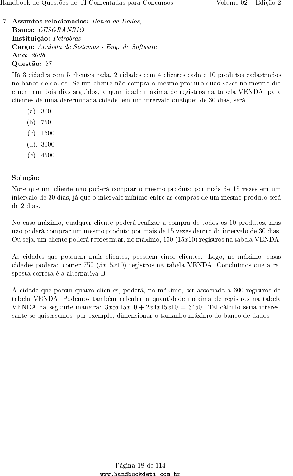 Handbook de Questões de TI Comentadas para Concursos Volume 02 � Edição 2 7. Assuntos relacionados: Banco de Dados, Banca: CESGRANRIO Instituição: Petrobras Cargo: Analista de Sistemas - Eng. de Software Ano: 2008 Questão: 27 Há 3 cidades com 5 clientes cada, 2 cidades com 4 clientes cada e 10 produtos cadastrados no banco de dados. Se um cliente não compra o mesmo produto duas vezes no mesmo dia e nem em dois dias seguidos, a quantidade máxima de registros na tabela VENDA, para clientes de uma determinada cidade, em um intervalo qualquer de 30 dias, será (a). 300 (b). 750 (c). 1500 (d). 3000 (e). 4500 Solução: Note que um cliente não poderá comprar o mesmo produto por mais de 15 vezes em um intervalo de 30 dias, já que o intervalo mínimo entre as compras de um mesmo produto será de 2 dias. No caso máximo, qualquer cliente poderá realizar a compra de todos os 10 produtos, mas não poderá comprar um mesmo produto por mais de 15 vezes dentro do intervalo de 30 dias. Ou seja, um cliente poderá representar, no máximo, 150 (15x10) registros na tabela VENDA. As cidades que possuem mais clientes, possuem cinco clientes. Logo, no máximo, essas cidades poderão conter 750 (5x15x10) registros na tabela VENDA. Concluímos que a re- sposta correta é a alternativa B. A cidade que possui quatro clientes, poderá, no máximo, ser associada a 600 registros da tabela VENDA. Podemos também calcular a quantidade máxima de registros na tabela VENDA da seguinte maneira: 3x5x15x10 + 2x4x15x10 = 3450. Tal cálculo seria interes- sante se quiséssemos, por exemplo, dimensionar o tamanho máximo do banco de dados. Página 18 de 114 www.handbookdeti.com.br www.handbookdeti.com.br