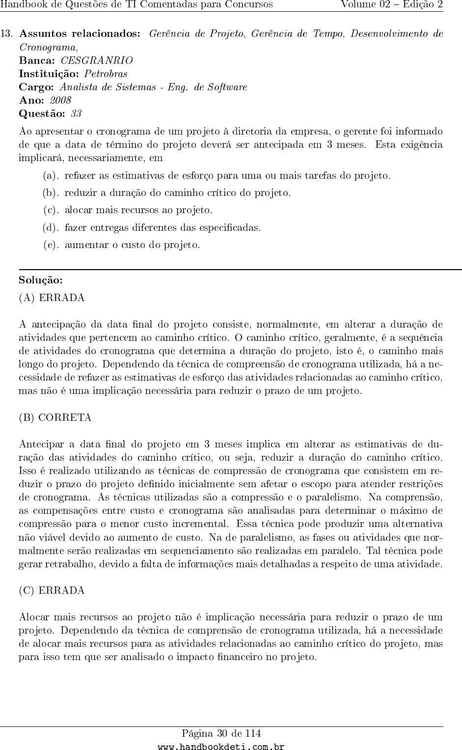 Handbook de Questões de TI Comentadas para Concursos Volume 02 � Edição 2 13. Assuntos relacionados: Gerência de Projeto, Gerência de Tempo, Desenvolvimento de Cronograma, Banca: CESGRANRIO Instituição: Petrobras Cargo: Analista de Sistemas - Eng. de Software Ano: 2008 Questão: 33 Ao apresentar o cronograma de um projeto à diretoria da empresa, o gerente foi informado de que a data de término do projeto deverá ser antecipada em 3 meses. Esta exigência implicará, necessariamente, em (a). refazer as estimativas de esforço para uma ou mais tarefas do projeto. (b). reduzir a duração do caminho crítico do projeto. (c). alocar mais recursos ao projeto. (d). fazer entregas diferentes das especi�cadas. (e). aumentar o custo do projeto. Solução: (A) ERRADA A antecipação da data �nal do projeto consiste, normalmente, em alterar a duração de atividades que pertencem ao caminho crítico. O caminho crítico, geralmente, é a sequência de atividades do cronograma que determina a duração do projeto, isto é, o caminho mais longo do projeto. Dependendo da técnica de compreensão de cronograma utilizada, há a ne- cessidade de refazer as estimativas de esforço das atividades relacionadas ao caminho crítico, mas não é uma implicação necessária para reduzir o prazo de um projeto. (B) CORRETA Antecipar a data �nal do projeto em 3 meses implica em alterar as estimativas de du- ração das atividades do caminho crítico, ou seja, reduzir a duração do caminho crítico. Isso é realizado utilizando as técnicas de compressão de cronograma que consistem em re- duzir o prazo do projeto de�nido inicialmente sem afetar o escopo para atender restrições de cronograma. As técnicas utilizadas são a compressão e o paralelismo. Na comprensão, as compensações entre custo e cronograma são analisadas para determinar o máximo de compressão para o menor custo incremental. Essa técnica pode produzir uma alternativa não viável devido ao aumento de custo. Na de paralelismo, as fases ou atividades que nor- malmente serão realizadas em sequenciamento são realizadas em paralelo. Tal técnica pode gerar retrabalho, devido a falta de informações mais detalhadas a respeito de uma atividade. (C) ERRADA Alocar mais recursos ao projeto não é implicação necessária para reduzir o prazo de um projeto. Dependendo da técnica de comprensão de cronograma utilizada, há a necessidade de alocar mais recursos para as atividades relacionadas ao caminho crítico do projeto, mas para isso tem que ser analisado o impacto �nanceiro no projeto. Página 30 de 114 www.handbookdeti.com.br www.handbookdeti.com.br