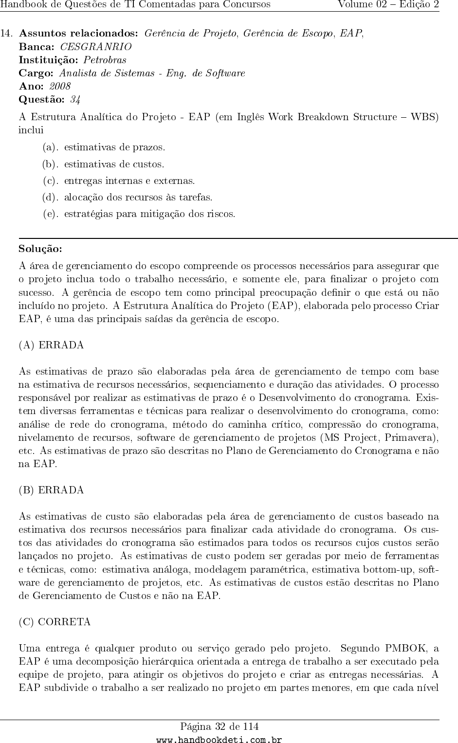 Handbook de Questões de TI Comentadas para Concursos Volume 02 � Edição 2 14. Assuntos relacionados: Gerência de Projeto, Gerência de Escopo, EAP, Banca: CESGRANRIO Instituição: Petrobras Cargo: Analista de Sistemas - Eng. de Software Ano: 2008 Questão: 34 A Estrutura Analítica do Projeto - EAP (em Inglês Work Breakdown Structure � WBS) inclui (a). estimativas de prazos. (b). estimativas de custos. (c). entregas internas e externas. (d). alocação dos recursos às tarefas. (e). estratégias para mitigação dos riscos. Solução: A área de gerenciamento do escopo compreende os processos necessários para assegurar que o projeto inclua todo o trabalho necessário, e somente ele, para �nalizar o projeto com sucesso. A gerência de escopo tem como principal preocupação de�nir o que está ou não incluído no projeto. A Estrutura Analítica do Projeto (EAP), elaborada pelo processo Criar EAP, é uma das principais saídas da gerência de escopo. (A) ERRADA As estimativas de prazo são elaboradas pela área de gerenciamento de tempo com base na estimativa de recursos necessários, sequenciamento e duração das atividades. O processo responsável por realizar as estimativas de prazo é o Desenvolvimento do cronograma. Exis- tem diversas ferramentas e técnicas para realizar o desenvolvimento do cronograma, como: análise de rede do cronograma, método do caminha crítico, compressão do cronograma, nivelamento de recursos, software de gerenciamento de projetos (MS Project, Primavera), etc. As estimativas de prazo são descritas no Plano de Gerenciamento do Cronograma e não na EAP. (B) ERRADA As estimativas de custo são elaboradas pela área de gerenciamento de custos baseado na estimativa dos recursos necessários para �nalizar cada atividade do cronograma. Os cus- tos das atividades do cronograma são estimados para todos os recursos cujos custos serão lançados no projeto. As estimativas de custo podem ser geradas por meio de ferramentas e técnicas, como: estimativa análoga, modelagem paramétrica, estimativa bottom-up, soft- ware de gerenciamento de projetos, etc. As estimativas de custos estão descritas no Plano de Gerenciamento de Custos e não na EAP. (C) CORRETA Uma entrega é qualquer produto ou serviço gerado pelo projeto. Segundo PMBOK, a EAP é uma decomposição hierárquica orientada a entrega de trabalho a ser executado pela equipe de projeto, para atingir os objetivos do projeto e criar as entregas necessárias. A EAP subdivide o trabalho a ser realizado no projeto em partes menores, em que cada nível Página 32 de 114 www.handbookdeti.com.br www.handbookdeti.com.br