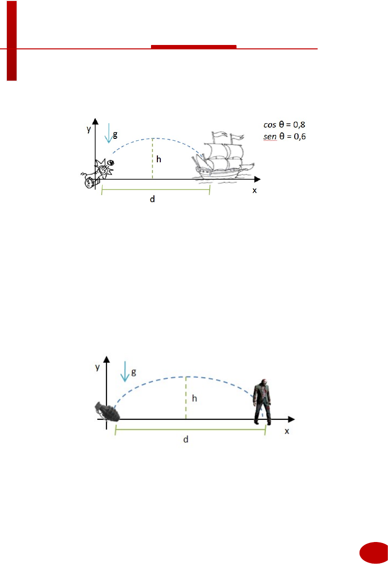 20 BANCO DE QUESTO ES Farlei Roberto Mazzarioli www.farlei.net Questão. Um canhão lança um projétil a 100 m/s contra um navio e o acerta. Para tal efeito o lançamento foi feito a um ângulo θ com a horizontal. Conforme figura. Qual a distância horizontal “d” atingida pelo projétil? a) 12 m b) 80 m c) 120 m d) 540 m e) 960 m Questão. Para sobreviver a um ataque de zumbis, um ex-aluno (não há mais escolas....) precisa lançar uma granada que chegue a uma distância “d” de 30 metros para atingir um zumbi. E ele acertou!! A altura “h” da granada chegou a 5 m e seu tempo de voo foi de 2 segundos. Determine os respectivos componentes da velocidade inicial nos eixos y e x. a) 15 m/s e 10 m/s b) 10 m/s e 15 m/s c) 10 m/s e 10 m/s d) 15 m/s e 15 m/s e) 20 m/s e 15 m/s