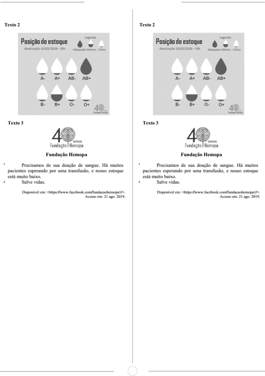 CADERNO DE QUESTÕES 4 11- IADES - 2019 - HEMOPA - Assistente Social Considerando o que preconiza a norma-padrão quanto às regras de pontuação, a respeito do texto 3, assinale a al- ternativa correta. A) Na oração “Precisamos de sua doação de sangue.”, substitui-se corretamente o ponto final por reticências, já que a ideia repassada não se completa com o término da frase. B) Na oração “Há muitos pacientes esperando por uma transfusão”, o termo “muitos pacientes” deve ser isolado por vírgulas no intuito de realçar esse elemento na oração. C) Em “Salve vidas.”, é correto substituir o ponto final pelo ponto de exclamação, porque, além de reforçar o pedi- do, normalmente se emprega essa pontuação depois de um imperativo. D) No período “esperando por uma transfusão, e nosso estoque está muito baixo”, é correto inserir dois-pontos no lugar da vírgula, pois se inicia aí uma explicação. E) O trecho “e nosso estoque está muito baixo” deve ser colocado entre parênteses, visto que essa informação repre- senta uma reflexão acerca do que é afirmado na oração an- terior. 12-IADES - 2019 - HEMOPA - Assistente Social Considerando a leitura compreensiva dos textos, assinale a alternativa correta. A) O conteúdo do texto 2 destoa completamente da mensagem expressa pelo texto 3. B) O texto 2 pretende comunicar que os voluntários dos tipos sanguíneos que se encontram no nível crítico são os mais resistentes à doação; portanto, nada solidários. C) A expressão “sua doação” (texto 3) refere-se apenas aos doadores de sangue dos tipos cujo estoque se encontra no nível considerado crítico. D) A redação Há muitos pacientes dos tipos AB+ e B+ es- perando por uma transfusão sintetiza a mensagem original do texto 3 e esclarece o sentido do texto 2. E) Ambos os textos contêm informações que justificam o apelo “Salve vidas.” (texto 3).