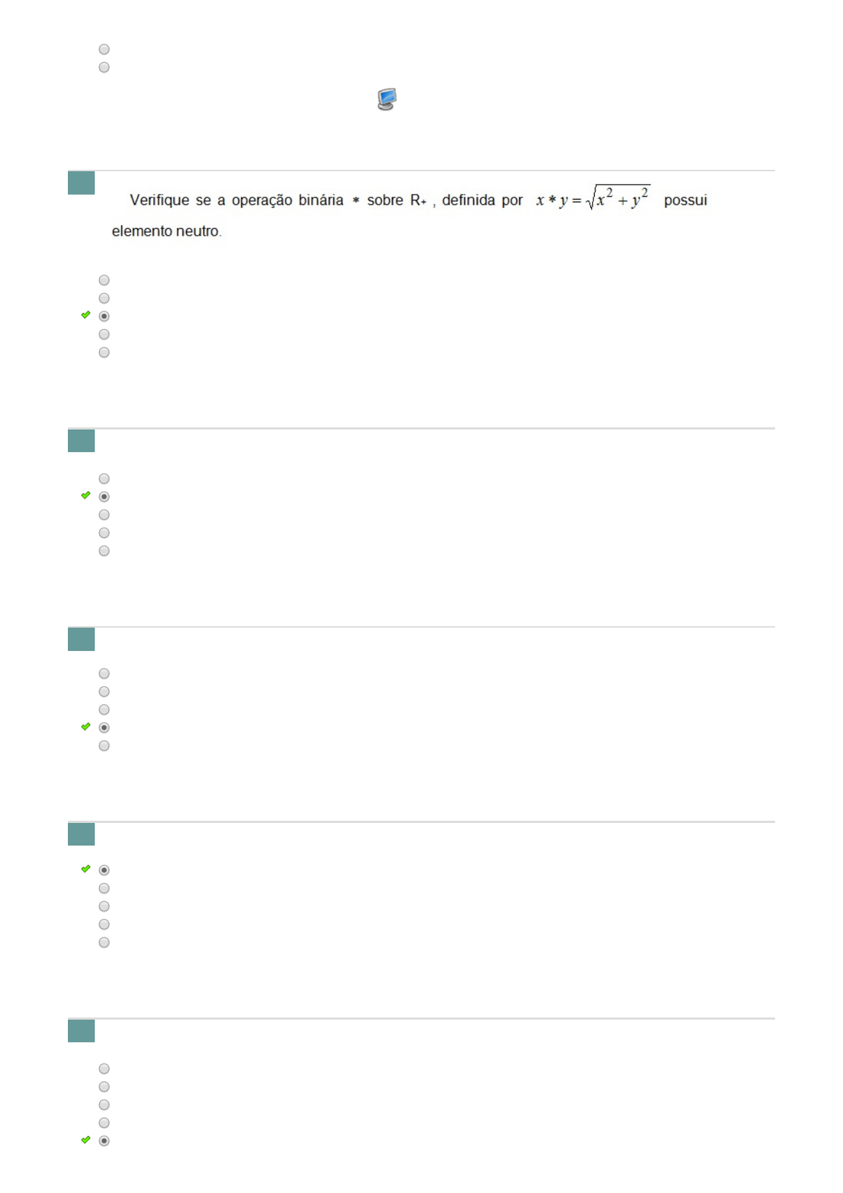 25/08/2019 EPS estacio.webaula.com.br/Classroom/index.html?id=2506988&courseId=865&classId=1185032&topicId=774119&p0=03c7c0ace395d80182db07ae… 2/3 O conjunto R dotado da operação * tal que x ⋆ y=x+y2 é um grupo ? Considere a operação binária * sobre R, definida por x*y = mx + ny + kxy, onde m, n e k são números reais dados. Estabeleça as condições sobre m, n e k de modo que essa operação seja comutativa. O conjunto R dotado da operação * tal que x * y = x + y - 3 é um grupo. Determine o elemento simétrico. Seja operação binária * definida por: a * b = resto da divisão de a + b por 4. A partir dela podemos dizer que 16 * 4 é: e = -2 e = 6 Gabarito Coment. 4. Existe elemento neutro e = -1 Não existe elemento neutro Existe elemento neutro e = 0 Existe elemento neutro e = 2 Existe elemento neutro e = 1 5. Sim, pois a propriedade associativa foi verificada e isso é uma condição suficiente para Z com a operação dada ser um grupo. Não, pois a propriedade associativa não foi verificada. Sim, pois a propriedade associativa foi verificada, existe elemento neutro e existe elemento simétrico. Sim, pois existe elemento neutro e = 1 Sim, pois existe elemento simétrico 6. m = k n = k m > n m = n m
