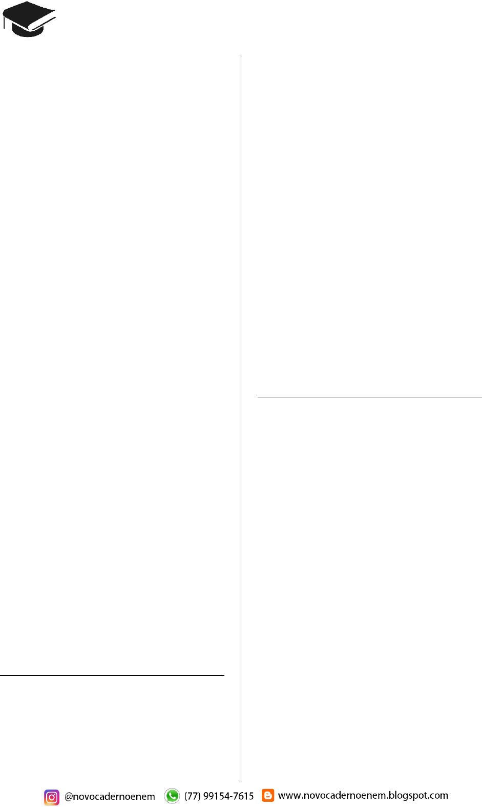 CADERNO BIOLOGIA ENEM 2009 a 2018 21 Questão 62 (2009.3) Começam a ser descritas as primeiras modifica- ções duradouras na estrutura molecular dos genes, causadas por influências sociais e estí- mulos do ambiente. Algumas delas estão relaci- onadas ao eixo hipotálamo-hipófise-adrenal, eixo fisiológico hormonal responsável pelo con- trole do estresse, que está preservado em toda escala evolutiva nos vertebrados. Durante o estresse, quando esse eixo é ativado, a glândula adrenal libera glicocorticóides, que são hormônios responsáveis pelos efeitos do estresse no organismo. Há diversas comprova- ções científicas de ratas que lambem, estimu- lam e amamentam a ninhada durante o período neonatal e, com esse comportamento, propici- am que os filhotes, na fase adulta, respondam com menos sinais de ansiedade a situações de estresse, e que repitam, com suas crias, cuida- dos semelhantes aos recebidos na fase neona- tal. Isso é possível graças a comportamentos maternais que induzem alterações moleculares em genes que são responsáveis pela expressão de receptores cerebrais para glicocorticóides dos filhotes, podendo diminuir a sensibilidade ou o número desses receptores. (Genética e Comportamento Social. Folha de São Paulo, São Paulo, 3 jan. 2009) De acordo com essas informações, é correto concluir que filhotes expostos à atenção mater- nal na fase neonatal apresentam: A) menor ansiedade, pois aprenderam com as mães, durante o período neonatal, a enfrentar situações de estresse. B) maior sensibilidade da adrenal em situações de estresse, o que acarreta maior liberação de glicocorticóides. C) menor número de receptores cerebrais para glicocorticóides na fase adulta, o que permite uma resposta com menos sinais de ansiedade a uma situação de estresse. D) receptores de glicocorticóides mais eficientes ao interagirem com os hormônios do estresse, promovendo uma resposta mais pronunciada frente ao estímulo estressor. E) maior resposta do eixo hipotálamo-hipófise- adrenal em situações de estresse, liberando maior quantidade de glicocorticóides, o que faz aumentar a ansiedade. Questão 63 (2009.3) O mercúrio é um metal muito utilizado, em in- dústrias e garimpos, para extração de ouro. As perdas decorrentes da má utilização desse me- tal atingem os ecossistemas aquáticos e che- gam ao homem quando este come peixes pes- cados em ecossistemas contaminados. O pro- cesso que torna o peixe prejudicial à saúde humana é chamado bioacumulação, na qual a concentração do mercúrio aumenta em cada organismo ao longo da cadeia alimentar trófica, de modo que o homem consome alimento com alta concentração de mercúrio e, portanto, com alta toxicidade. A utilização de métodos de rea- proveitamento do mercúrio nas atividades indus- triais e mineradoras constitui importante medida de controle da poluição causada por esse metal e capaz de reduzir as consequências nefastas para a biota aquática e para a saúde humana. Suponha que um curso d’ água esteja contami- nado por mercúrio proveniente de local onde se desenvolvam atividades de garimpo. Nesse caso, ao se examinarem os seres que vivem nesse ambiente aquático, é possível encontrar: A) maior concentração de mercúrio nos consu- midores primários da cadeia alimentar. B) baixíssima concentração de mercúrio no pescado consumido pelos seres humanos. C) maior concentração de mercúrio nos animais que estão no topo da cadeia alimentar. D) alta concentração de mercúrio nos seres que compõem o zooplancton e o fitoplancton. E) ausência de mercúrio nas plantas aquáticas, pois eles são seres que estão fora da cadeia trófica. Questão 64 (2009.3) A China comprometeu-se a indenizar a Rússia pelo derramamento de benzeno de uma indús- tria petroquímica chinesa no rio Songhua, um afluente do rio Amur, que faz parte da fronteira entre os dois países. O presidente da Agência Federal de Recursos de Água da Rússia garan- tiu que o benzeno não chegará aos dutos de água potável, mas pediu à população que fer- vesse a água corrente e evitasse a pesca no rio Amur e seus afluentes. As autoridades locais estão armazenando centenas de toneladas de carvão, já que o mineral é considerado eficaz adsorvente de benzeno. (Disponível em: http://www.jbonline.terra.com.br. Acesso em: 25 jun. 2008 - adaptado) Levando-se em conta as medidas adotadas para a minimização dos danos ao ambiente e à população, é correto afirmar que: A) o carvão mineral, ao ser colocado na água, reage com o benzeno, eliminando-o. B) o benzeno é mais volátil que a água e, por isso, é necessário que esta seja fervida. C) a orientação para se evitar a pesca deve-se à necessidade de preservação dos peixes. D) o benzeno não contaminaria os dutos de água potável, porque seria decantado natural- mente no fundo do rio. E) a poluição causada pelo derramamento de benzeno da indústria chinesa ficará restrita ao rio Songhua.