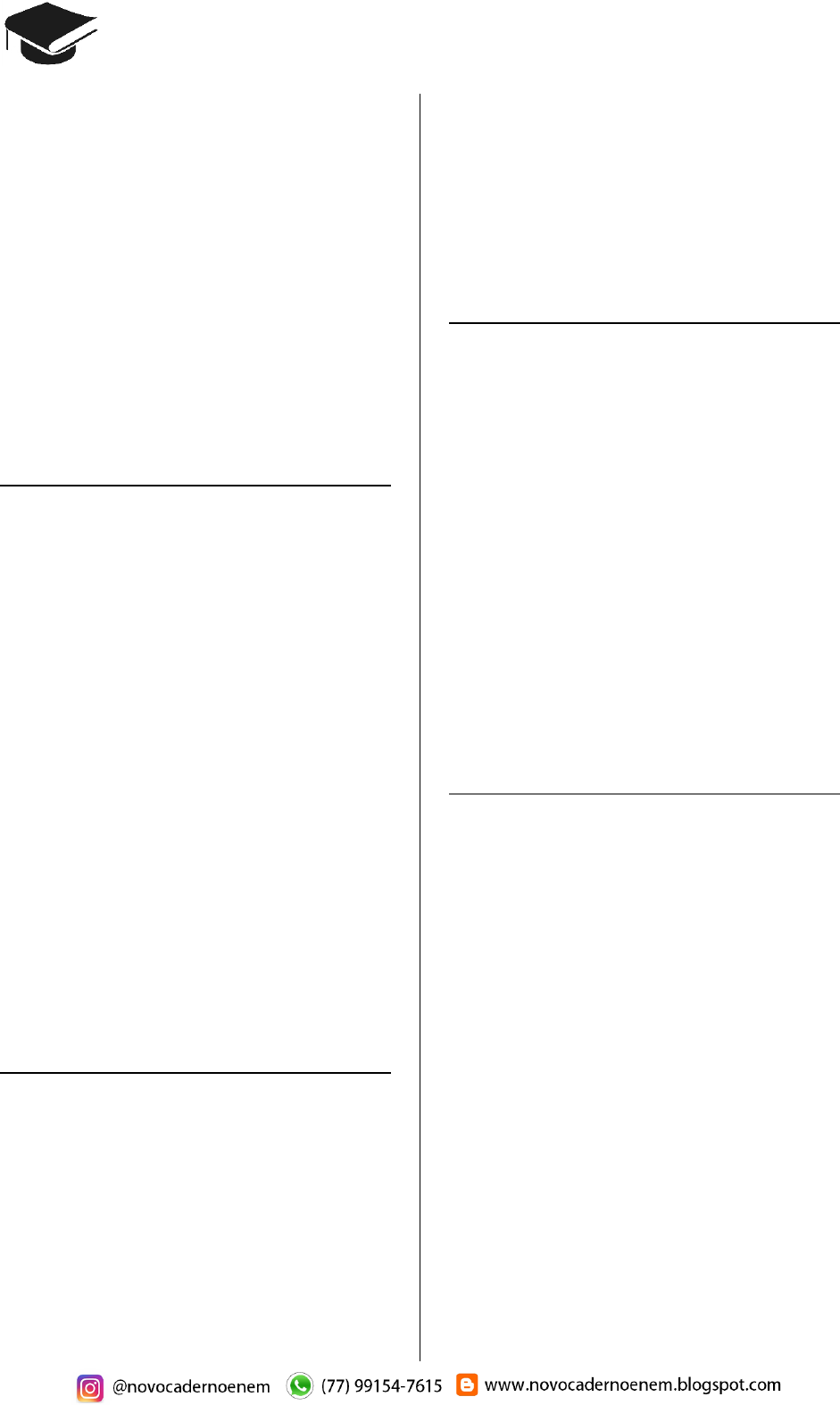 CADERNO BIOLOGIA ENEM 2009 a 2018 114 Qual foi a orientação dada à jovem pelo médi- co? A) Usar repelentes e telas em janelas, já que a doença é transmitida por mosquito. B) Evitar nadar em rios, lagos e lagoas da regi- ão, já que a doença é transmitida pela água contaminada. C) Evitar contato com animais de zoológicos, uma vez que se trata de uma zoonose veiculada por grandes mamíferos. D) Realizar exames médicos periódicos para detectar precocemente a doença, já que se trata de uma enfermidade hereditária. E) Manter uma dieta balanceada e prática regu- lar de atividades físicas, uma vez que a doença está associada ao sedentarismo. Questão 403 (2018.2) Em pacientes portadores de astrocitoma pilocíti- co, um tipo de tumor cerebral, o gene BRAF se quebra e parte dele se funde a outro gene, o KIAA1549. Para detectar essa alteração cro- mossômica, foi desenvolvida uma sonda que é um fragmento de DNA que contém partículas fluorescentes capazes de reagir com o genes BRAF e KIAA1549 fazendo cada um deles emi- tir uma cor diferente. Em uma célula normal, como os dois genes estão em regiões distintas do genoma, as duas cores aparecem separa- damente. Já quando há a fusão dos dois genes, as cores aparecem sobrepostas. (Disponível em: http://agencia.fapesp.br. Acesso em: 3 out. 2015) A alteração cromossômica presente nos pacien- tes com astrocitoma pilocítico é classificada como: A) estrutural do tipo deleção. B) numérica do tipo euploidia. C) estrutural do tipo duplicação. D) numérica do tipo aneuploidia. E) estrutural do tipo translocação. Questão 404 (2018.2) Do ponto de vista genético, o número de cro- mossomos é uma característica marcante de cada espécie. A goiabeira (Psidium guajava L.), por exemplo, apresenta como padrão específico 22 cromossomos. A organização celular do ga- metófito feminino (saco embrionário) das flores de Angiospermas é complexa, sendo formado por um conjunto de oito células que, após a fecundação, originarão células com diferentes números cromossômicos. Nesse grupo, as célu- las somáticas são diploides, as gaméticas são haploides e o tecido de reserva da semente é triploide. Durante o ciclo de vida de uma goiabeira, quan- tos cromossomos podem ser encontrados, res- pectivamente, A) 22, 22, 33 B) 11, 22, 33 C) 22, 44, 33 D) 11, 22, 44 E) 11, 22, 22 Questão 405 (2018.2) O monóxido de carbono (CO) é um gás extre- mamente tóxico. Ele interfere no processo respi- ratório dos vertebrados, pois se o CO estiver presente no ar, haverá no sangue uma "compe- tição" entre o CO e O2. Infelizmente, grande parte da população convive diariamente com a presença desse gás, uma vez que ele é produzido em grandes quantida- des: A) nas queimadas em matas e florestas. B) na decomposição da matéria orgânica nos "lixões" urbanos. C) no abdômen de animais ruminantes criados em sistemas de confinamento. D) no processo de combustão incompleta de combustíveis fósseis. E) nas chaminés das indústrias que utilizam madeira de reflorestamento como combustível. Questão 406 (2018.2) Gregor Mendel, no século XIX, investigou os mecanismos da herança genética observando algumas características de plantas de ervilha, como a produção de sementes lisas (dominan- te) ou rugosas (recessiva), característica deter- minada por um par de alelos com dominância completa. Ele acreditava que a herança era transmitida por fatores que, mesmo não perce- bidos nas características visíveis (fenótipo) de plantas híbridas (resultantes de cruzamentos de linhagens puras), estariam presentes e se mani- festariam em gerações futuras. A autofecundação que fornece dados para cor- roborar a ideia da transmissão dos fatores idea- lizada por Mendel ocorre entre plantas: A) híbridas, de fenótipo dominante, que produ- zem apenas sementes lisas. B) híbridas, de fenótipo dominante, que produ- zem sementes lisas e rugosas. C) de linhagem pura, de fenótipo dominante, que produzem apenas sementes lisas. D) de linhagem pura, de fenótipo recessivo, que produzem sementes lisas e rugosas. E) de linhagem pura, de fenótipo recessivo, que produzem apenas sementes rugosas.