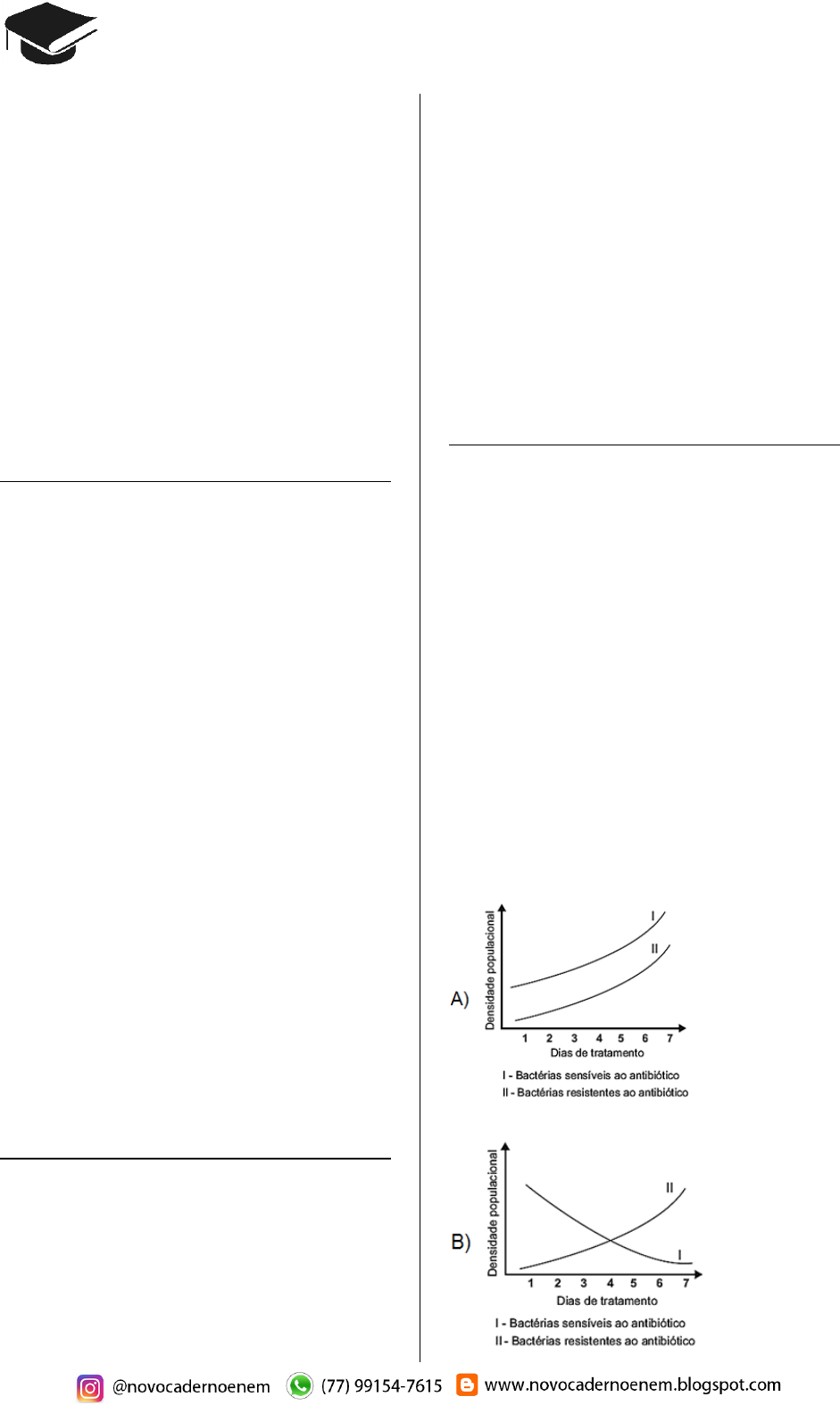 CADERNO BIOLOGIA ENEM 2009 a 2018 81 Questão 281 (2015.2) Dentre outras características, uma determinada vegetação apresenta folhas durante três a qua- tro meses ao ano, com limbo reduzido, meca- nismo rápido de abertura e fechamento dos estômatos e caule suculento. Essas são algu- mas características adaptativas das plantas ao bioma onde se encontram. Que fator ambiental é o responsável pela ocor- rência dessas características adaptativas? A) Escassez de nutrientes no solo. B) Estratificação da vegetação. C) Elevada insolação. D) Baixo pH do solo. E) Escassez de água. Questão 282 (2015.2) A remoção de petróleo derramado em ecossis- temas marinhos é complexa e muitas vezes envolve a adição de mais sustâncias ao ambien- te. Para facilitar o processo de recuperação dessas áreas, pesquisadores têm estudado a bioquímica de bactérias encontradas em locais sujeitos a esse tipo de impacto. Eles verificaram que algumas dessas espécies utilizam as molé- culas de hidrocarbonetos como fonte energéti- ca, atuando como biorremediadores, removendo o óleo do ambiente. (KREPSKY, N.; SILVA SOBRINHO, F.; CRAPEZ, M. A. C. Ciência Hoje, n. 223, jan.-fev. 2006 - adaptado) Para serem eficientes no processo de biorreme- diação citado, as espécies escolhidas devem possuir: A) células flageladas, que capturem as partícu- las de óleo presentes na água. B) altas taxas de mutação, para se adaptarem ao ambiente impactado pelo óleo. C) enzimas, que catalisem reações de quebra das moléculas constituintes do óleo. D) parede celular espessa, que impossibilite que as bactérias se contaminem com o óleo. E) capacidade de fotossíntese, que possibilite a liberação de oxigênio para a renovação do am- biente poluído. Questão 283 (2015.2) Uma enzima foi retirada de um dos órgãos do sistema digestório de um cachorro e, após ser purificada, foi diluída em solução fisiológica e distribuída em três tubos de ensaio com os se- guintes conteúdos: Tubo 1: carne Tubo 2: macarrão Tubo 3: banha Em todos os tubos foi adicionado ácido clorídri- co (HCl), e o pH da solução baixou para um valor próximo a 2. Além disso, os tubos foram mantidos por duas horas a uma temperatura de 37°C. A digestão do alimento ocorreu somente no tubo 1. De qual órgão do cachorro a enzima foi retira- da? A) Fígado. B) Pâncreas. C) Estômago. D) Vesícula biliar. E) Intestino delgado. Questão 284 (2015.2) As superbactérias respondem por um número crescente de infecções e mortes em todo o mundo. O termo superbactérias é atribuído às bactérias que apresentam resistência a pratica- mente todos os antibióticos. Dessa forma, no organismo de um paciente, a população de uma espécie bacteriana patogênica pode ser consti- tuída principalmente por bactérias sensíveis a antibióticos usuais e por um número reduzido de superbactérias que, por mutação ou intercâmbio de material genético, tornaram-se resistentes aos antibióticos existentes. (FERREIRA, F. A.; CRUZ, R. S.; FIGUEIREDO, A. M. S. Superbactérias: o problema mundial da resistência a antibióticos. Ciência Hoje, n. 287, nov. 2011) Qual figura representa o comportamento popu- lacional das bactérias ao longo de uma semana de tratamento com um antibiótico comum?