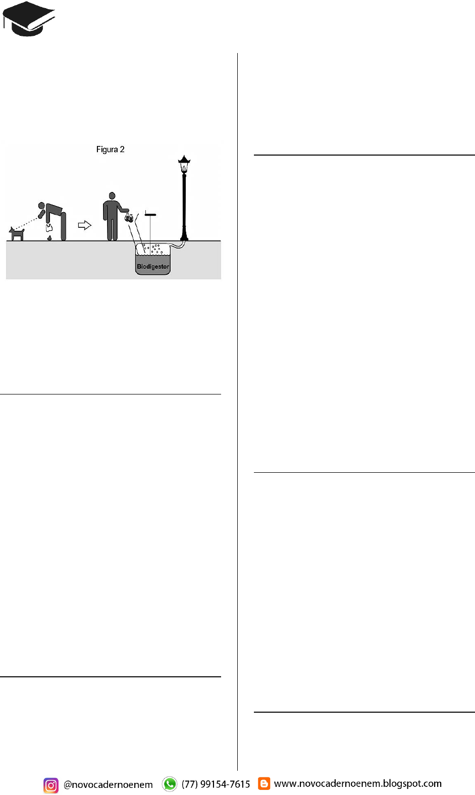 CADERNO BIOLOGIA ENEM 2009 a 2018 86 A Figura 2 ilustra o Projeto Park Spark, desen- volvido em Cambridge, MA (EUA), em que as fezes dos animais domésticos são recolhidas em sacolas biodegradáveis e jogadas em um biodigestor instalado em parques públicos; e os produtos são utilizados em equipamentos no próprio parque. Uma inovação desse projeto é possibilitar o(a): A) queima de gás metano. B) armazenamento de gás carbônico. C) decomposição aeróbica das fezes. D) usa mais eficiente de combustíveis fósseis. E) fixação de carbono em moléculas orgânicas. Questão 302 (2016.1) Portadores de diabetes insipidus reclamam da confusão feita pelos profissionais da saúde quanto aos dois tipos de diabetes: mellitus e insipidus. Enquanto o primeiro tipo está associ- ado aos níveis ou à ação da insulina, o segundo não está ligado à deficiência desse hormônio. O diabetes insipidus é caracterizado por um dis- túrbio na produção ou no funcionamento do hormônio antidiurético (na sigla em inglês, ADH), secretado pela neuro-hipófise para con- trolar a reabsorção de água pelos túbulos re- nais. Tendo em vista o papel funcional do ADH, qual é um sintoma clássico de um paciente acometi- do por diabetes insipidus? A) Alta taxa de glicose no sangue. B) Aumento da pressão arterial. C) Ganho de massa corporal. D) Anemia crônica. E) Desidratação. Questão 303 (2016.1) Apesar da grande diversidade biológica, a hipó- tese de que a vida na Terra tenha tido uma úni- ca origem comum é aceita pela comunidade científica. Uma evidência que apoia essa hipó- tese é a observação de processos biológicos comuns a todos os seres vivos atualmente exis- tentes. Um exemplo de tal processo é o(a): A) desenvolvimento embrionário. B) reprodução sexuada. C) respiração aeróbica. D) excreção urinária. E) síntese proteica. Questão 304 (2016.1) O Brasil possui um grande número de espécies distintas entre animais, vegetais e microrganis- mos envoltos em uma imensa complexidade e distribuídas em uma grande variedade de ecos- sistemas. (SANDES. A. R. R.; BLASI. G. Biodiversidade e diversidade química e genética. Disponível em: http://novastecnologias.com.br. Acesso em: 22 set. 2015 - adaptado) O incremento da variabilidade ocorre em razão da permuta genética, a qual propicia a troca de segmentos entre cromátides não irmãs na mei- ose. Essa troca de segmentos é determinante na: A) produção de indivíduos mais férteis. B) transmissão de novas características adquiri- das. C) recombinação genética na formação dos gametas. D) ocorrência de mutações somáticas nos des- cendentes. E) variação do número de cromossomos carac- terístico da espécie. Questão 305 (2016.1) A formação de coágulos sanguíneos em veias e artérias é um dos fatores responsáveis pela ocorrência de doenças cardiovasculares, como varizes, infarto e acidentes vasculares cere- brais. A prevenção e o tratamento dessas doen- ças podem ser feitos com drogas anticoagulan- tes. A indústria farmacêutica estimula a pesqui- sa de toxinas animais com essa propriedade. Considerando as adaptações relacionadas aos hábitos alimentares, os animais adequados ao propósito dessas pesquisas são os(as): A) moluscos fitófagos. B) moscas saprófagas. C) pássaros carnívoros. D) morcegos frugívoros. E) mosquitos hematófagos. Questão 306 (2016.1) Vários métodos são empregados para preven- ção de infecções por microrganismos. Dois des- ses métodos utilizam microrganismos vivos e são eles: as vacinas atenuadas, constituídas por