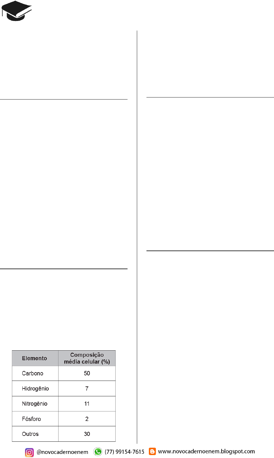 CADERNO BIOLOGIA ENEM 2009 a 2018 89 Para combater a doença, os veterinários devem administrar, nos bovinos contaminados, A) vacinas. B) antivirais. C) fungicidas. D) vermífugos. E) antibióticos. Questão 315 (2016.2) As sacolas plásticas são utilizadas em grande quantidade no Brasil por serem práticas, leves e de baixo custo. Porém, o tempo necessário para que sofram degradação nas condições do meio é de, no mínimo, 100 anos. Com o intuito de reduzir o impacto ambiental desses produtos, as sacolas biodegradáveis foram introduzidas no mercado. Essas sacolas são confeccionadas de um material polimérico que confere a elas uma característica que as torna biodegradáveis. A qual característica das sacolas biodegradá- veis o texto faz referência? A) Elevada massa molecular do polímero. B) Espessura fina do material que as constitui. C) Baixa resistência aos líquidos nas condições de uso. D) Baixa resistência ao ataque por microrga- nismos em condições adequadas. E) Ausência de anéis aromáticos na estrutura do polímero usado na confecção das sacolas. Questão 316 (2016.2) O petróleo é um tipo de combustível fóssil, de origem animal e vegetal, constituído principal- mente por hidrocarbonetos. Em desastres de derramamento de petróleo, vários métodos são usados para a limpeza das áreas afetadas. Um deles é a biodegradação por populações natu- rais de microrganismos que utilizam o petróleo como fonte de nutrientes. O quadro mostra a composição química média das células desses microrganismos. Para uma efetiva biodegradação, a região afe- tada deve ser suplementada com: A) nitrogênio e fósforo. B) hidrogênio e fósforo. C) carbono e nitrogênio. D) carbono e hidrogênio. E) nitrogênio e hidrogênio. Questão 317 (2016.2) Em um hospital, acidentalmente, uma funcioná- ria ficou exposta a alta quantidade de radiação liberada por um aparelho de raios X em funcio- namento. Posteriormente ela engravidou e seu filho nasceu com grave anemia. Foi verificado que a criança apresentava a doença devido à exposição anterior da mãe à radiação. O que justifica, nesse caso, o aparecimento da anemia na criança? A) A célula-ovo sofreu uma alteração genética. B) As células somáticas da mãe sofreram uma mutação. C) A célula gamética materna que foi fecundada sofreu uma mutação. D) As hemácias da mãe que foram transmitidas à criança não eram normais. E) As células hematopoiéticas sofreram altera- ção do número de cromossomos. Questão 318 (2016.2) Chamamos de lixo a grande diversidade de resíduos sólidos de diferentes procedências, como os gerados em residências. O aumento na produção de resíduos sólidos leva à necessida- de de se pensar em maneiras adequadas de tratamento. No Brasil, 76% do lixo é disposto em lixões e somente 24% tem como destino um tratamento adequado, considerando os aterros sanitários, as usinas de compostagem ou a incineração. (FADINI, P S.; FADINI, A A. A, Lixo: desafiosecom- promissos. Química Nova na Escola, maio 2001) Comparando os tratamentos descritos, as usi- nas de compostagem apresentam como vanta- gem serem o destino: A) que gera um produto passível de utilização na agricultura. B) onde ocorre a eliminação da matéria orgâni- ca presente no lixo. C) mais barato, pois não implica custos de tra- tamento nem controle. D) que possibilita o acesso de catadores, pela disposição do lixo a céu aberto. E) em que se podem utilizar áreas contamina- das com resíduos de atividades de mineração.