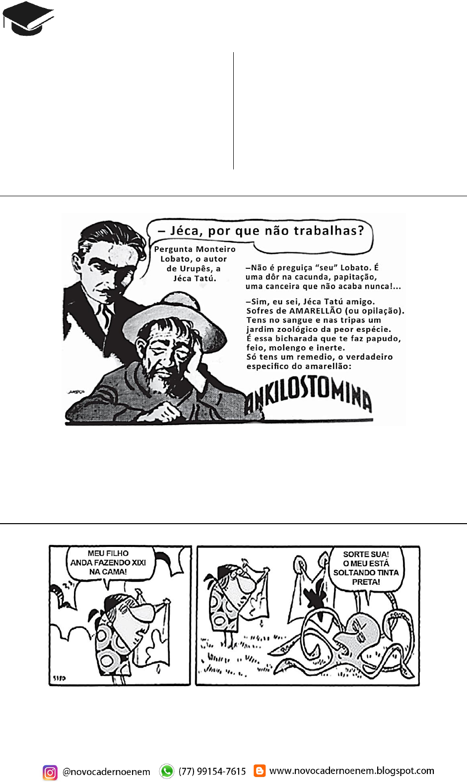 CADERNO BIOLOGIA ENEM 2009 a 2018 93 O novo gene antissentido bloqueou a síntese da proteína amolecedora. (SIZER, F.; WHITNEY, E. Nutrição: conceitos e controvérsias. Barueri: Manole, 2002 - adaptado) Um benefício ao se obter o tomate transgênico foi o fato de o processo biotecnológico ter: A) aumentado a coleção de proteínas que o protegem do apodrecimento, pela produção da proteína antissentido. B) diminuído a necessidade do controle das pragas, pela maior resistência conferida pela nova proteína. C) facilitado a germinação das sementes, pela falta da proteína que o leva a amolecer. D) substituído a proteína amolecedora por uma invertida, que endurece o tomate. E) prolongado o tempo de vida do tomate, pela falta da proteína que o amolece. Questão 333 (2016.3) O rótulo descreve características de uma doença que pode ser prevenida com o(a): A) uso de calçados. D) eliminação de água parada. B) aplicação de inseticida. E) substituição de casas de barro por de alvenaria. C) utilização de mosqueteiros. Questão 334 (2016.3) (Disponível em: http://angelobranco.blogspot.com.br. Acesso em: 4 maio 2013) Na tirinha, o processo mencionado pelo molusco está relacionado a um mecanismo de: A) defesa. B) excreção. C) circulação. D) locomoção. E) reprodução.