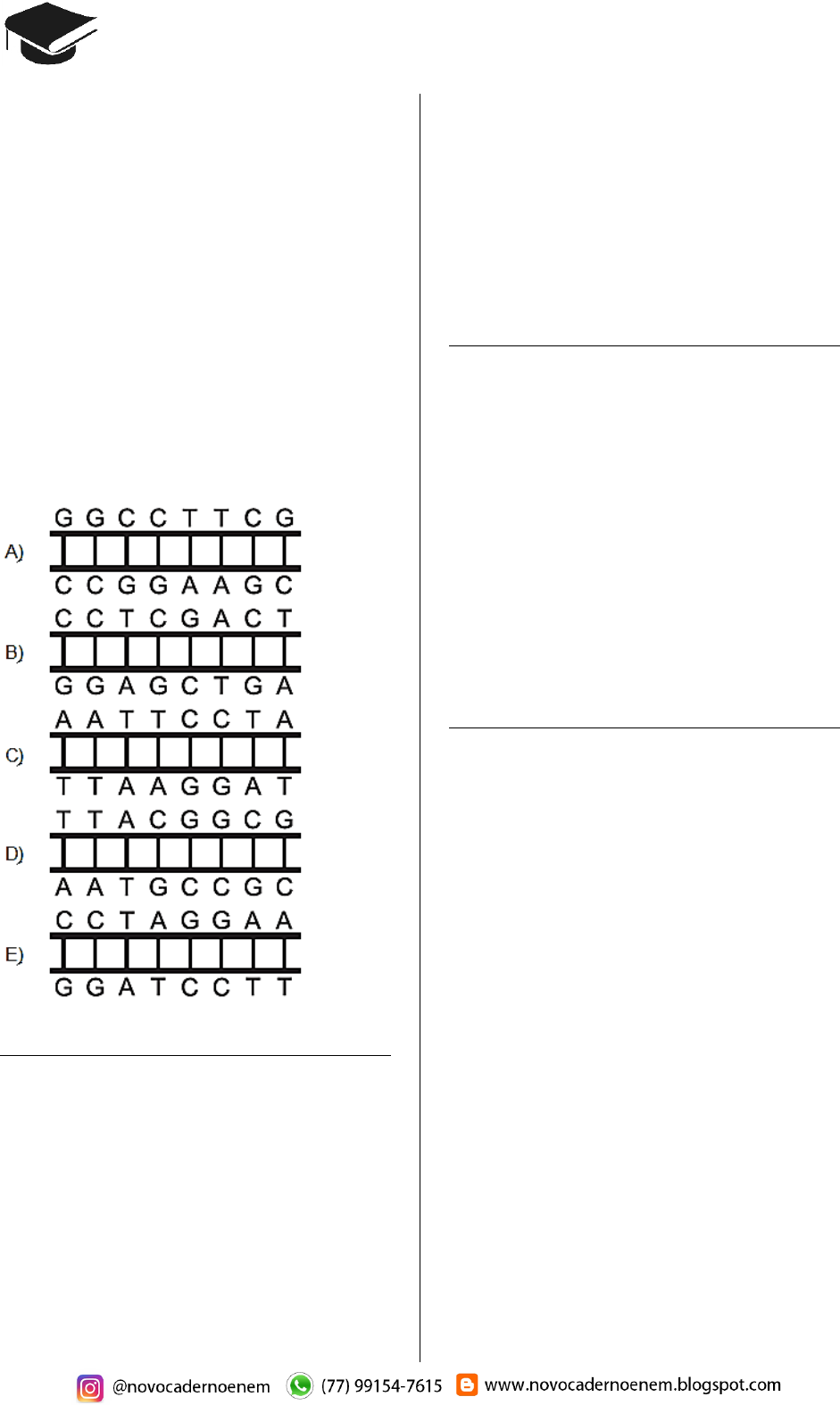 CADERNO BIOLOGIA ENEM 2009 a 2018 96 Questão 342 (2017.1) A reação em cadeia da polimerase (PCR, na sigla em inglês) é uma técnica de biologia mole- cular que permite replicação in vitro do DNA de forma rápida. Essa técnica surgiu na década de 1980 e permitiu avanços científicos em todas as áreas de investigação genômica. A dupla hélice é estabilizada por ligações hidrogênio, duas entre as bases adenina (A) e timina (T) e três entre guanina (G) e citosina (C). Inicialmente, para que o DNA possa ser replicado, a dupla hélice precisa ser totalmente desnaturada (de- senrolada) pelo aumento da temperatura, quan- do são desfeitas as ligações hidrogênio entre as diferentes bases nitrogenadas. Qual dos segmentos de DNA será o primeiro a desnaturar totalmente durante o aumento da temperatura na reаção de PCR? Questão 343 (2017.1) A retina é um tecido sensível à luz, localizado na parte posterior do olho, onde ocorre o pro- cesso de formação de imagem. Nesse tecido, encontram-se vários tipos celulares específicos. Um desses tipos celulares são cones, os quais convertem os diferentes comprimentos de onda da luz visível em sinais elétricos, que são transmitidos pelo nervo óptico até o cérebro. (Disponível: www.portaldaretina.com.br. Acesso em: 13 jun. 2012 – adaptado) Em relação à visão, a degeneração desse tipo celular irá: A) comprometer a capacidade de visão em co- res. B) impedir a projeção dos raios luminosos na retina. C) provocar a formação de imagens invertidas na retina. D) dificuldade de visualização de objetos próxi- mos. E) acarretar a perda da capacidade de alterar o diâmetro da pupila. Questão 344 (2017.1) A terapia celular tem sido amplamente divulga- da como revolucionária, por permitir a regenera- ção de tecidos a partir de células novas. Entre- tanto, a técnica de se introduzirem novas célu- las em um tecido, para o tratamento de enfermi- dades em indivíduos, já era aplicada rotineira- mente em hospitais. A que técnica refere-se o texto? A) Vacina. B) Biópsia. C) Hemodiálise. D) Ouimioterapia. E) Transfusão de sangue. Questão 345 (2017.1) A distrofia muscular Duchenne (DMD) é uma doença causada por uma mutação em um gene localizado no cromossomo X. Pesquisadores estudaram uma família na qual gêmeas mono- zigóticas eram portadoras de um alelo mutante recessivo para esse gene (heterozigóticas). O interessante é que uma das gêmeas apresenta- va o fenótipo relacionado ao alelo mutante, isto é, DMD, enquanto a sua irmã apresentava fenó- tipo normal. (RICHARDS, CS, et al. The American Journal of Human Genetics, n. 4, 1990 adaptado) A diferença na manifestação da DMD entre as gêmeas pode ser explicada pela: A) dominância incompleta do alelo mutante em relação ao alelo normal. B) falha na separação dos cromossomos X no momento da separação dos dois embriões. C) recombinação cromossômica em uma divi- são celular embrionária anterior à separação dos dois embriões. D) inativação aleatória de um dos cromossomos X em fase posterior à divisão que resulta nos dois embriões. E) origem paterna do cromossomo portador do alelo mutante em uma das gêmeas e origem materna na outra.