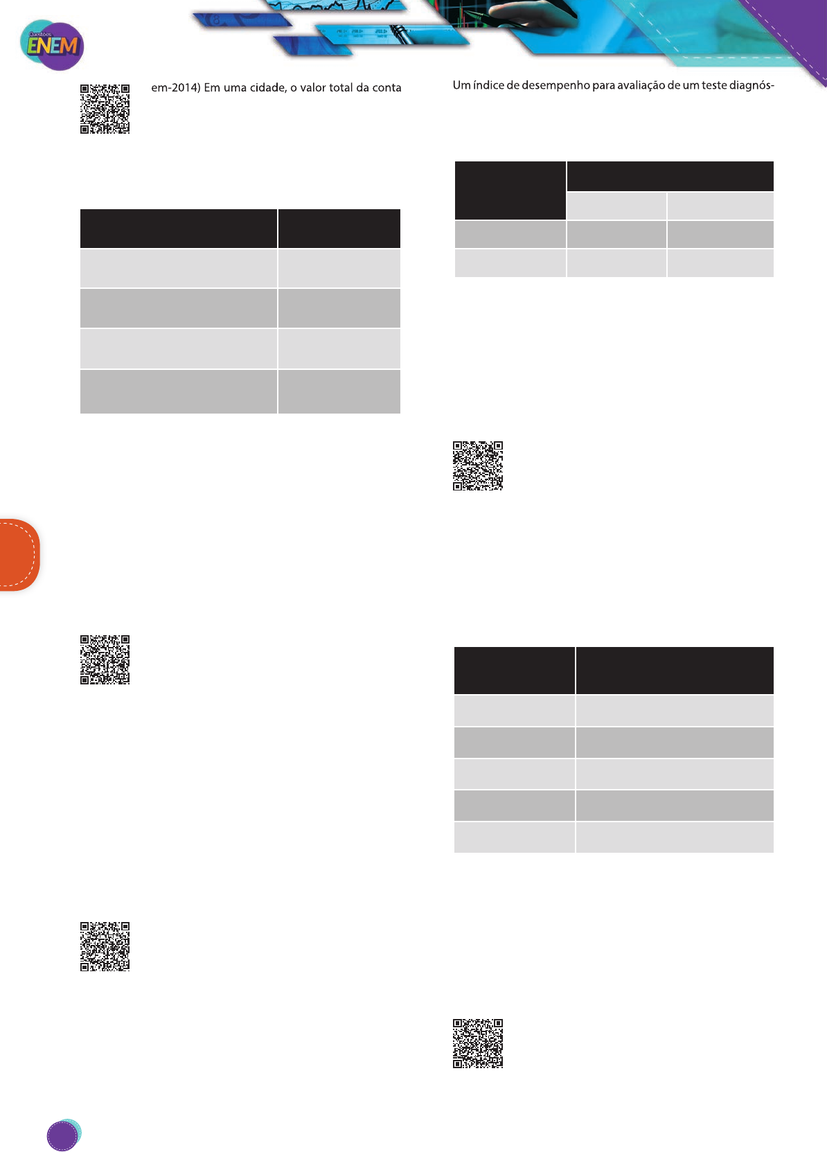 118. (Enem-2014) Em uma cidade, o valor total da conta de energia elétrica é obtido pelo produto entre o consumo (em kWh) e o valor da tarifa do kWh (com tributos), adicionado à Cosip (contribuição para custeio da iluminação pública), conforme a expressão: Valor do kWh (com tributos) x consumo (em kWh) + Cosip O valor da Cosip é fixo em cada faixa de consumo. O quadro mostra o valor cobrado para algumas faixas. Faixa de consumo mensal (kWh) Valor da Cosip (R$) Até 80 0,00 Superior a 80 até 100 2,00 Superior a 100 até 140 3,00 Superior a 140 até 200 4,50 Suponha que, em uma residência, todo mês o consumo seja de 150 kWh, e o valor do kWh (com tributos) seja de R$0,50. O morador dessa residência pretende diminuir seu consumo mensal de energia elétrica com objetivo de reduzir o custo total da conta em pelo menos 10%. Qual deve ser o consumo máximo, em kWh, dessa residência para produzir a redução pretendida pelo morador? A) 134,1. B) 135,0. C) 137,1. D) 138,6. E) 143,1. 119. (Enem-2014) O Brasil é um país com uma vantagem econômica clara no terreno dos recursos naturais, dispondo de uma das maiores áreas com vocação agrícola do mundo. Especialistas calculam que, dos 853 milhões de hectares do país, as cidades, as reservas indíge- nas e as áreas de preservação, incluindo florestas e mananciais, cubram por volta de 470 milhões de hectares. Aproximadamente 280 milhões se destinam à agropecuária, 200 milhões para pastagens e 80 milhões para a agricultura, somadas as lavouras anuais e as perenes, como o café e a fruticultura. (FORTES, G. Recuperação de pastagens é alternativa para ampliar cultivos. Folha de S.Paulo, 30 out. 2011.) De acordo com os dados apresentados, o percentual corres- pondente à área utilizada para agricultura em relação à área do território brasileiro é mais próximo de A) 32,8%. B) 28,6%. C) 10,7%. D) 9,4%. E) 8,0%. 120. (Enem-2014) Para analisar o desempenho de um mé- todo diagnóstico, realizam-se estudos em populações contendo pacientes sadios e doentes. Quatro situações distintas podem acontecer nesse contexto de teste: I. Paciente TEM a doença e o resultado do teste é POSITIVO. II. Paciente TEM a doença e o resultado do teste é NEGATIVO. III. Paciente NÃO TEM a doença e o resultado do teste é POSITIVO. IV. Paciente NÃO TEM a doença e o resultado do teste é NEGATIVO. Um índice de desempenho para avaliação de um teste diagnós- tico é a sensibilidade definida como a probabilidade de o resul- tado do teste ser POSITIVO se o paciente estiver com a doença. O quadro refere-se a um teste diagnóstico para a doença A, aplicado em uma amostra composta por duzentos indivíduos. Resultado do teste Doença A Presente Ausente Positivo 95 15 Negativo 5 85 (BENSEÑOR, I. M, LOFUTO, P.A. Epidemologia: abordagem prática. São Paulo: Sarvier, 2011. Adaptado.) Conforme o quadro do teste proposto, a sensibilidade dele é de A) 47,5%. B) 85,0%. C) 86,3%. D) 94,4%. E) 95,0%. 121. (Enem-2014) De acordo com a ONU, da água utilizada diariamente, • 25% são para tomar banho, lavar as mãos e escovar os dentes. • 33% são utilizados em descarga de banheiro. • 27% são para cozinhar e beber. • 15% são para as demais atividades. No Brasil, o consumo de água por pessoa chega, em média, a 200 litros por dia. O quadro mostra sugestões de consumo moderado de água por pessoa, por dia, em algumas atividades. Atividade Consumo total de água na atividade (em litros) Tomar banho 24,0 Dar descarga 18,0 Lavar as mãos 3,2 Escovar os dentes 2,4 Beber e cozinhar 22,0 Se cada brasileiro adotar o consumo de água indicado no quadro, mantendo o mesmo consumo nas demais atividades, então economizará diariamente, em média, em litros de água, A) 30,0. B) 69,6. C) 100,4. D) 130,4. E) 170,0. 122. (Enem-2014) Os vidros para veículos produzidos por certo fabricante têm transparências entre 70% e 90%, dependendo do lote fabricado. Isso significa que, quando um feixe luminoso incide no vidro, uma parte entre 70% e 90% da luz consegue atravessá-lo. Os veículos equipados com vidros desse fabricante terão instaladas, nos MatemáticaMatemática (Enem-2014) Em uma cidade, o valor total da conta Um índice de desempenho para avaliação de um teste diagnós- MatemáticaMatemática 174 PG18EA445SD00_QE_2018_MIOLO.indb 174 26/02/2018 16:43:25