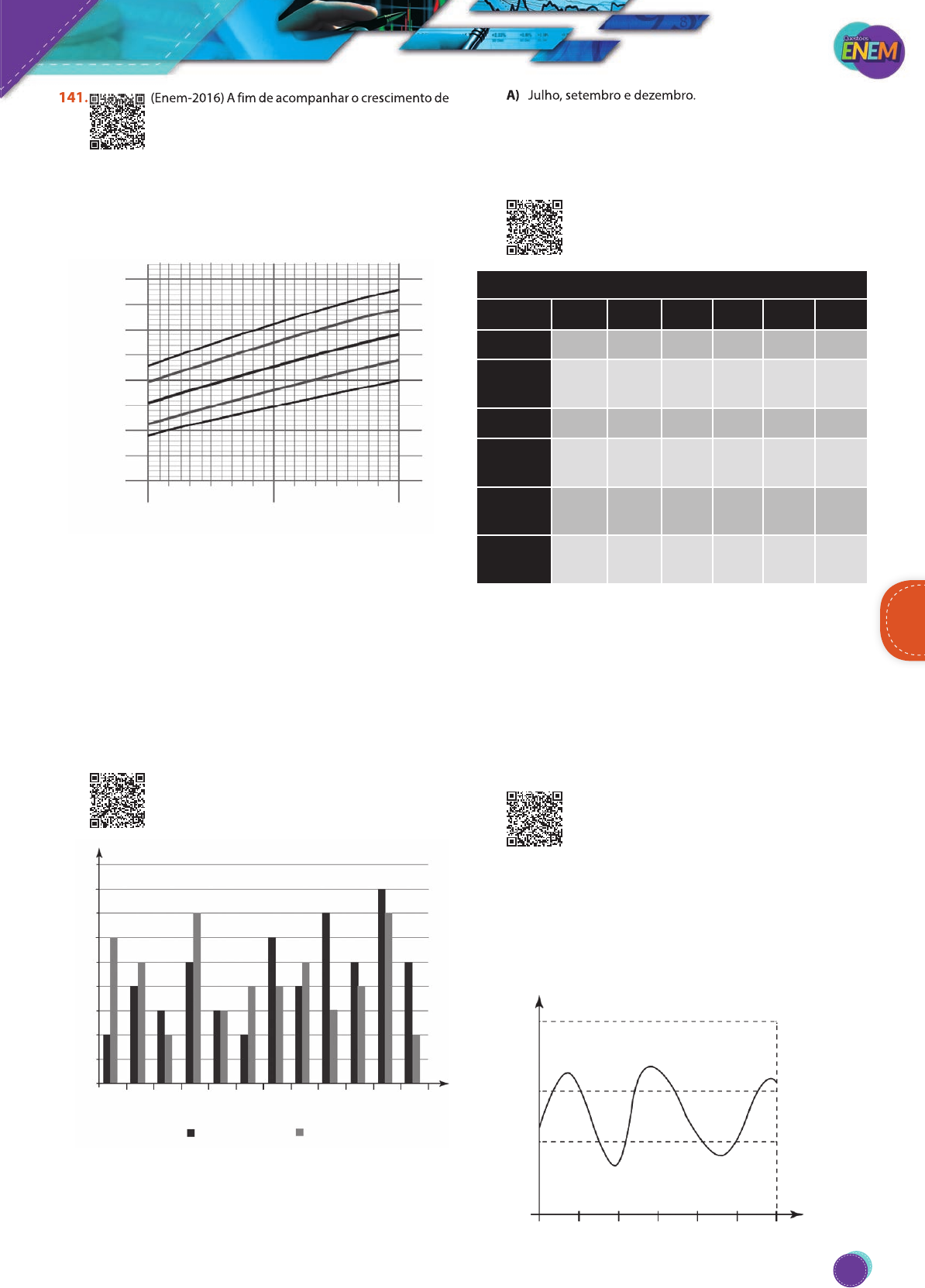141. (Enem-2016) A fim de acompanhar o crescimento de crianças, foram criadas pela Organização Mundial da Saúde (OMS) tabelas de altura, também adotadas pelo Ministério da Saúde do Brasil. Além de informar os dados referentes ao índice de crescimento, a tabela traz gráficos com curvas, apresentando padrões de crescimento estipulados pela OMS. O gráfico apresenta o crescimento de meninas, cuja análise se dá pelo ponto de intersecção entre o comprimento, em centímetro, e a idade, em mês completo e ano, da criança. Co m pr im en to /e st at ur a (c m ) Idade (mês completo e ano) Meses 2 4 6 8 10 2 4 6 8 10 3 anos 80 80 85 85 90 90 95 95 100 100 105 105 110 110 115 115 120 120 4 anos 5 anos p97 p85 p50 p15 p3 (Disponível em: . Acesso em: 22 out. 2015. Adaptado.) Uma menina aos 3 anos de idade tinha altura de 85 centíme- tros e aos 4 anos e 4 meses sua altura chegou a um valor que corresponde a um ponto exatamente sobre a curva p50. Qual foi o aumento percentual da altura dessa menina, descrito com uma casa decimal, no período considerado? A) 23,5%. B) 21,2%. C) 19,0%. D) 11,8%. E) 10,0%. 142. (Enem-2016) Uma empresa registrou seu desempe- nho em determinado ano por meio do gráfico, com dados mensais do total de vendas e despesas. Total vendas Jan 0 1 2 3 4 5 6 7 8 9 Fev Mar Abr Mai Jun Jul Ago Set Out Nov Dez Despesas O lucro mensal é obtido pela subtração entre o total de vendas e despesas, nesta ordem. Quais os três meses do ano em que foram registrados os maiores lucros? A) Julho, setembro e dezembro. B) Julho, setembro e novembro. C) Abril, setembro e novembro. D) Janeiro, setembro e dezembro. E) Janeiro, abril e junho. 143. (Enem-2016) A tabela apresenta parte do resultado de um espermograma (exame que analisa as condi- ções físicas e composição do sêmen humano). Espermograma Características Padrão 30/11/2009 23/03/2010 09/08/2011 23/08/2011 06/03/2012 Volume (mL) 2,0 a 5,0 2,5 2,5 2,0 4,0 2,0 Tempo de liquefação (min) Até 60 35 50 60 59 70 pH 7,2 a 7,8 7,5 7,5 8,0 7,6 8,0 Espermatozoide (unidade/ mL) > 20 000 000 9 400 000 27 000 000 12 800 000 24 200 000 10 200 000 Leucócito (unidade/ mL) Até 1 000 2 800 1 000 1 000 900 1 400 Hemácia (unidade/ mL) Até 1 000 800 1 200 200 800 800 Para analisar o exame, deve-se comparar os resultados obtidos em diferentes datas com o valor padrão de cada característica avaliada. O paciente obteve um resultado dentro dos padrões no exame realizado no dia A) 30/11/2009. B) 23/03/2010. C) 09/08/2011. D) 23/08/2011. E) 06/03/2012. 144. (Enem-2016) Alguns equipamentos eletrônicos podem “queimar” durante o funcionamento quando sua temperatura interna atinge um valor máximo TM. Para maior durabilidade dos seus produtos, a indústria de eletrônicos conecta sensores de temperatura a esses equipamentos, os quais acionam um sistema de resfria- mento interno, ligando-o quando a temperatura do eletrônico ultrapassa um nível crítico TC, e desligando-o somente quando a temperatura cai para valores inferiores a Tm. O gráfico ilustra a oscilação da temperatura interna de um aparelho eletrônico durante as seis primeiras horas de funcionamento, mostrando que seu sistema de resfriamento interno foi acionado algumas vezes. Temperatura (ºC). Tempo (h) TM TC Tm 0 1 2 3 4 5 6 141. (Enem-2016) A fim de acompanhar o crescimento de A) Julho, setembro e dezembro. MatemáticaMatemática MatemáticaMatemática 179 PG18EA445SD00_QE_2018_MIOLO.indb 179 26/02/2018 16:43:31