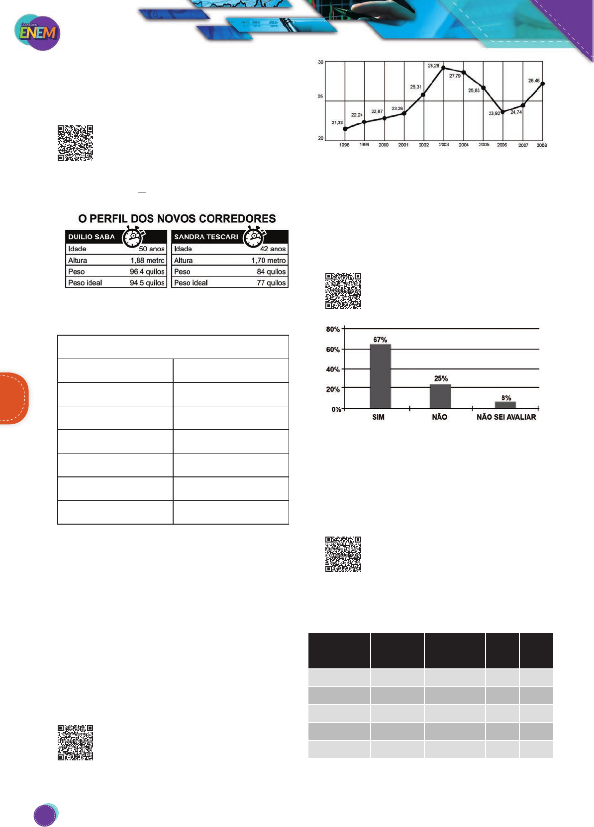MatemáticaMatemática 186 MatemáticaMatemática 186186 Se os atletas partissem do mesmo ponto, dando uma volta com- pleta, em qual das raias o corredor estaria sendo beneficiado? A) 1 B) 4 C) 5 D) 7 E) 8 171. (Enem-2011) A figura apresenta informações biomé- tricas de um homem (Duílio) e de uma mulher (Sandra) que estão buscando alcançar seu peso ideal a partir das atividades físicas (corrida). Para se verificar a escala de obesidade, foi desenvolvida a fórmula que permite verificar o Índice de Massa Corporal (IMC). Essa fórmula é apre- sentada como IMC = m h2 , onde m é a massa em quilogramas e h é altura em metros. (Veja. ed. 2055. Adaptado.) No quadro é apresentada a Escala de Índice de Massa Corporal com as respectivas categorias relacionadas aos pesos. Escala de Índice de Massa Corporal CATEGORIAS IMC (kg/m2) Desnutrição Abaixo de 15,5 Peso abaixo do normal 15,5 a 20 Peso normal 20 a 24,9 Sobrepeso 25 a 29,9 Obesidade 30 a 39,9 Obesidade mórbida Igual ou acima de 40 (Nova Escola. n. 172, maio 2004.) A partir dos dados biométricos de Duílio e Sandra e da Escala de IMC, o valor IMC e a categoria em que cada uma das pessoas se posiciona na Escala são A) Duílio tem o IMC 26,7 e Sandra tem o IMC 26,6, estando ambos na categoria de sobrepeso. B) Duílio tem o IMC 27,3 e Sandra tem o IMC 29,1, estando ambos na categoria de sobrepeso. C) Duílio tem o IMC 27,3 e Sandra tem o IMC 26,6, estando ambos na categoria de sobrepeso. D) Duílio tem o IMC 25,6, estando na categoria de sobrepe- so, e Sandra tem o IMC 24,7, estando na categoria de peso normal. E) Duílio tem o IMC 25,1, estando na categoria de sobrepe- so, e Sandra tem o IMC 22,6, estando na categoria de peso normal. 172. (Enem-2011) O termo agronegócio não se refere apenas à agricultura e à pecuária, pois as atividades ligadas a essa produção incluem fornecedores de equipamentos, serviços para a zona rural, industria- lização e comercialização dos produtos. O gráfico seguinte mostra a participação percentual do agro- negócio no PIB brasileiro: (Centro de Estudos Avançados em Economia Aplicada (Cepea). Almanaque Abril 2010. São Paulo: Abril, ano 36. Adaptado.) Esse gráfico foi usado em uma palestra na qual o orador ressaltou uma queda da participação do agronegócio no PIB brasileiro e a posterior recuperação dessa participação, em termos percentuais. Segundo o gráfico, o período de queda ocorreu entre os anos de A) 1998 e 2001. B) 2001 e 2003. C) 2003 e 2006. D) 2003 e 2007. E) 2003 e 2008. 173. (Enem-2011) Uma enquete, realizada em março de 2010, perguntava aos internautas se eles acreditavam que as atividades humanas provocam o aquecimento global. Eram três as alternativas possíveis e 279 inter- nautas responderam à enquete, como mostra o gráfico. (Época. ed. 619, 29 mar. 2010. Adaptado.) Analisando os dados do gráfico, quantos internautas responde- ram “NÃO” à enquete? A) Menos de 23. B) Mais de 23 e menos de 25. C) Mais de 50 e menos de 75. D) Mais de 100 e menos de 190. E) Mais de 200. 174. (Enem-2011) A cor de uma estrela tem relação com a temperatura em sua superfície. Estrelas não muito quentes (cerca de 3 000K) nos parecem avermelhadas. Já as estrelas amarelas, como o Sol, possuem tempe- ratura em torno dos 6 000K; as mais quentes são brancas ou azuis porque sua temperatura fica acima dos 10 000K. A tabela apresenta uma classificação espectral e outros dados para as estrelas dessas classes. Classe espectral Tempera- tura Luminosi- dade Mas- sa Raio O5 40 000 5 x 105 40 18 B0 28 000 2 x 104 18 7 A0 9 900 80 3 2.5 G2 5 770 1 1 1 M0 3 480 0,06 0,5 0,6 Estrelas da Sequência Principal Temperatura em Kelvin. Luminosidade, massa e raio, tomando o Sol como unidade. (Disponível em: . Acesso em: 1 maio 2010. Adaptado.) PG18EA445SD00_QE_2018_MIOLO.indb 186 26/02/2018 16:43:37