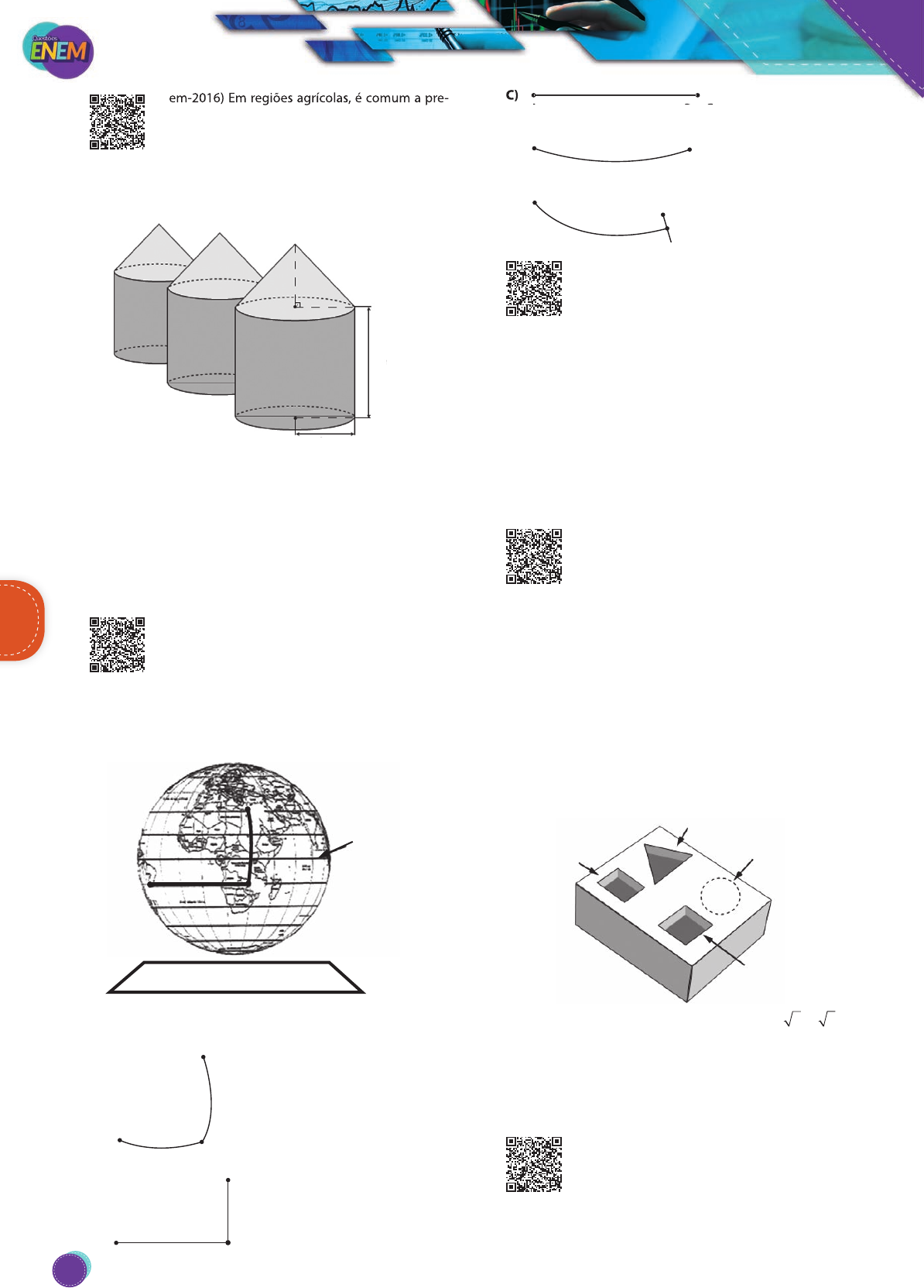 393. (Enem-2016) Em regiões agrícolas, é comum a pre- sença de silos para armazenamento e secagem da produção de grãos, no formato de um cilindro reto, sobreposto por um cone, e dimensões indicadas na figura. O silo fica cheio e o transporte dos grãos é feito em ca- minhões de carga cuja capacidade é de 20 m3. Uma região possui um silo cheio e apenas um caminhão para transportar os grãos para a usina de beneficiamento. 3 m 3 m 12 m Utilize 3 como aproximação para π. O número mínimo de via- gens que o caminhão precisará fazer para transportar todo o volume de grãos armazenados no silo é A) 6 B) 16 C) 17 D) 18 E) 21 394. (Enem-2016) A figura representa o globo terrestre e nela estão marcados os pontos A, B e C. Os pontos A e B estão localizados sobre um mesmo paralelo, e os pontos B e C, sobre um mesmo meridiano. É traçado um caminho do ponto A até C, pela superfície do globo, pas- sando por B, de forma que o trecho de A até B se dê sobre o paralelo que passa por A e B e, o trecho de B até C se dê sobre o meridiano que passa por B e C. Considere que o plano α é paralelo à linha do Equador na figura Linha do Equador α A B C A projeção ortogonal, no plano α, do caminho traçado no globo pode ser representada por A) A B C B) A B C C) A B ≡ C D) A B ≡ C E) A C B 395. (Enem-2016) É comum os artistas plásticos se apro- priarem de entes matemáticos para produzirem, por exemplo, formas e imagens por meio de manipula- ções. Um artista plástico, em uma de suas obras, pretende retratar os diversos polígonos obtidos pelas intersec- ções de um plano com uma pirâmide regular de base quadrada. Segundo a classificação dos polígonos, quais deles são possíveis de serem obtidos pelo artista plástico? A) Quadrados, apenas. B) Triângulos e quadrados, apenas. C) Triângulos, quadrados e trapézios, apenas. D) Triângulos, quadrados, trapézios e quadriláteros irregula- res, apenas. E) Triângulos, quadrados, trapézios, quadriláteros irregulares e pentágonos, apenas. 396. (Enem-2016) Um marceneiro está construindo um material didático que corresponde ao encaixe de peças de madeira com 10 cm de altura e formas geométricas variadas, num bloco de madeira em que cada peça se posicione na perfuração com seu formato correspondente, conforme ilustra a figura. O bloco de madeira já possui três perfurações prontas de bases distintas: uma quadrada (Q), de lado 4 cm, uma retangular (R), com base 3 cm e altura 4 cm, e uma em forma de um triângulo equilátero (T), de lado 6,8 cm. Falta realizar uma perfuração de base circular (C). O marceneiro não quer que as outras peças caibam na perfuração circular e nem que a peça de base circular caiba nas demais perfurações e, para isso, escolherá o diâmetro do círculo que atenda a tais condições. Procurou em suas ferra- mentas uma serra copo (broca com formato circular) para perfurar a base em madeira, encontrando cinco exemplares, com diferentes medidas de diâmetros, como segue: (I) 3,8 cm; (II) 4,7 cm; (III) 5,6 cm; (IV) 7,2 cm e (V) 9,4 cm. R T C Q Considere 1,4 e 1,7 como aproximações para 2 e 3 , res- pectivamente. Para que seja atingido o seu objetivo, qual dos exemplares de serra copo o marceneiro deverá escolher? A) I. B) II. C) III. D) IV. E) V. 397. (Enem-2016) Um petroleiro possui reservatório em formato de um paralelepípedo retangular com as dimensões dadas por 60 m × 10 m de base e 10 m de altura. Com o objetivo de minimizar o impacto am- biental de um eventual vazamento, esse reservatório é MatemáticaMatemática (Enem-2016) Em regiões agrícolas, é comum a pre- C) A B C MatemáticaMatemática 230 PG18EA445SD00_QE_2018_MIOLO.indb 230 26/02/2018 16:44:45