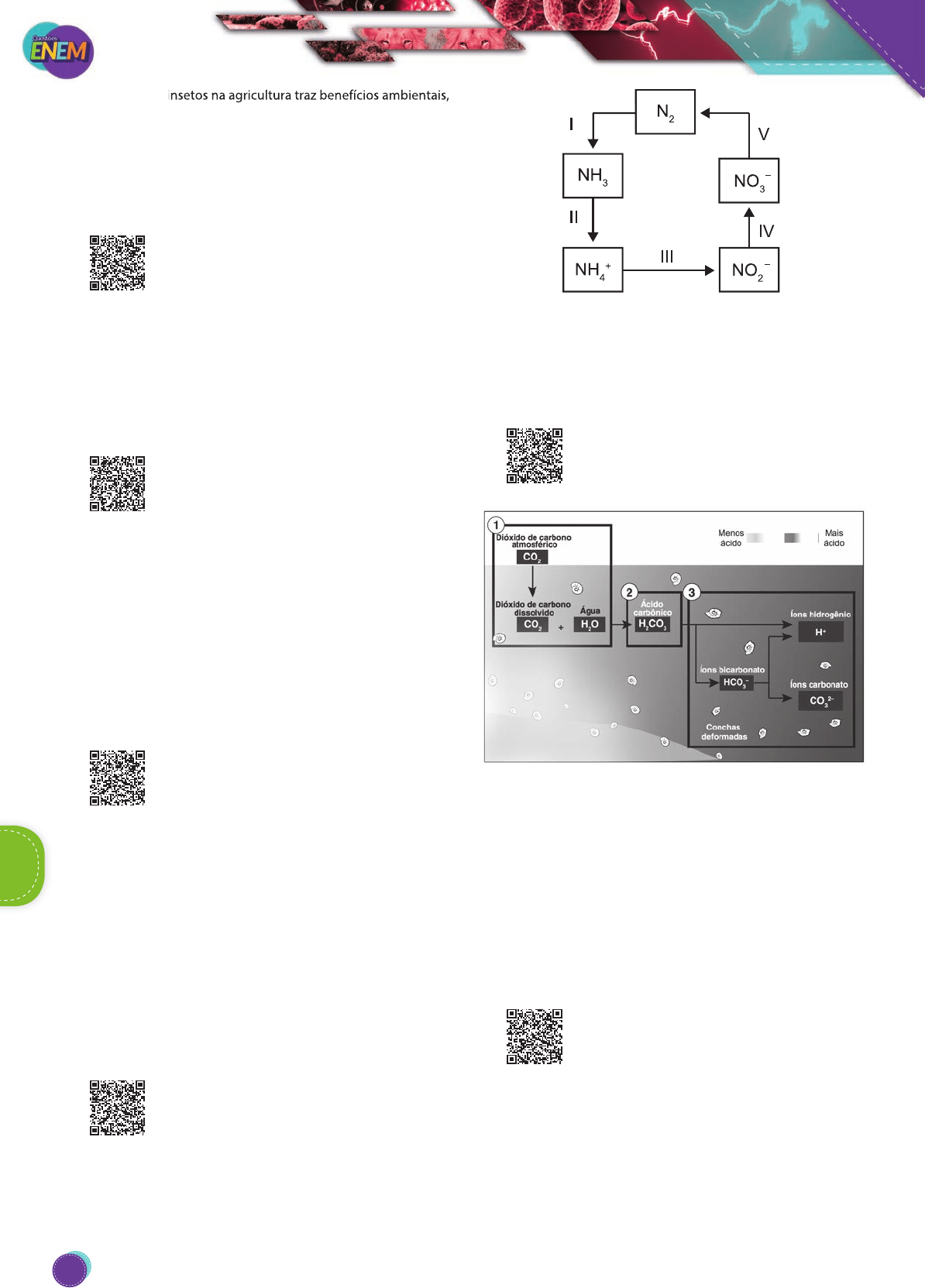 O uso desses insetos na agricultura traz benefícios ambientais, pois diminui o(a) A) tempo de produção agrícola. B) diversidade de insetos-praga. C) aplicação de inseticidas tóxicos. D) emprego de fertilizantes agrícolas. E) necessidade de combate a ervas daninhas. 88. (Enem-2015) A indústria têxtil utiliza grande quanti- dade de corantes no processo de tingimento dos tecidos. O escurecimento das águas dos rios causado pelo despejo desses corantes pode desencadear uma série de problemas no ecossistema aquático. Considerando esse escurecimento das águas, o impacto negativo inicial que ocorre é o(a) A) eutrofização. B) proliferação de algas. C) inibição da fotossíntese. D) fotodegradação da matéria orgânica. E) aumento da quantidade de gases dissolvidos. 89. (Enem-2015) O nitrogênio é essencial para a vida e o maior reservatório global desse elemento, na forma de N2, é a atmosfera. Os principais responsáveis por sua incorporação na matéria orgânica são micro-or- ganismos fixadores de N2, que ocorrem de forma livre ou sim- biontes com plantas. (ADUAN, R. E. et al. Os grandes ciclos biogeoquímicos do planeta. Planaltina: Embrapa, 2004. Adaptado.) Animais garantem suas necessidades metabólicas desse ele- mento pela A) absorção do gás nitrogênio pela respiração. B) ingestão de moléculas de carboidratos vegetais. C) incorporação de nitritos dissolvidos na água consumida. D) transferência da matéria orgânica pelas cadeias. E) protocooperação com micro-organismos fixadores de nitrogênio. 90. (Enem-2014) O potencial brasileiro para transformar lixo em energia permanece subutilizado – apenas pequena parte dos resíduos brasileiros é utilizada para gerar energia. Contudo, bons exemplos são os aterros sanitários, que utilizam a principal fonte de energia ali produzida. Alguns aterros vendem créditos de carbono com base no Mecanismo de Desenvolvimento Limpo (MDL), do Protocolo de Kyoto. Essa fonte de energia subutilizada, citada no texto, é o A) etanol, obtido a partir da decomposição da matéria orgâ- nica por bactérias. B) gás natural, formado pela ação de fungos decompositores da matéria orgânica. C) óleo de xisto, obtido pela decomposição da matéria orgâ- nica pelas bactérias anaeróbias. D) gás metano, obtido pela atividade de bactérias anaeróbias na decomposição da matéria orgânica. E) gás liquefeito de petróleo, obtido pela decomposição de vegetais presentes nos restos de comida. 91. (Enem-2014) A aplicação excessiva de fertilizantes nitrogenados na agricultura pode acarretar alterações no solo e na água pelo acúmulo de compostos nitro- genados, principalmente a forma mais oxidada, favo- recendo a proliferação de algas e plantas aquáticas e alterando o ciclo do nitrogênio, representado no esquema. A espécie nitro- genada mais oxidada tem sua quantidade controlada por ação de micro-organismos que promovem a reação de redução dessa espécie, no processo denominado desnitrificação. O processo citado está representado na etapa A) I. B) II. C) III. D) IV. E) V. 92. (Enem-2014) Parte do gás carbônico da atmosfera é absorvida pela água do mar. O esquema representa reações que ocorrem naturalmente, em equilíbrio, no sistema ambiental marinho. O excesso de dióxido de carbono na atmosfera pode afetar os recifes de corais. (Disponível em: . Acesso em: 20 maio 2014. Adaptado.) O resultado desse processo nos corais é o(a) A) seu branqueamento, levando à sua morte e extinção. B) excesso de fixação de cálcio, provocando calcificação indesejável. C) menor incorporação de carbono, afetando seu metabolis- mo energético. D) estímulo da atividade enzimática, evitando a descalcifica- ção dos esqueletos. E) dano à estrutura dos esqueletos calcários, diminuindo o tamanho das populações. 93. (Enem-2014) Os parasitoides (misto de parasitas e predadores) são insetos diminutos que têm hábitos muito peculiares: suas larvas podem se desenvolver dentro do corpo de outros organismos, como mostra a figura. A forma adulta se alimenta de pólen e açúcares. Em geral, cada parasitoide ataca hospedeiros de determinada espécie e, por isso, esses organismos vêm sendo amplamente usados para os controle biológico de pragas agrícolas. BiologiaBiologia O uso desses insetos na agricultura traz benefícios ambientais, BiologiaBiologia 326 PG18EA445SD00_QE_2018_MIOLO.indb 326 26/02/2018 16:46:47