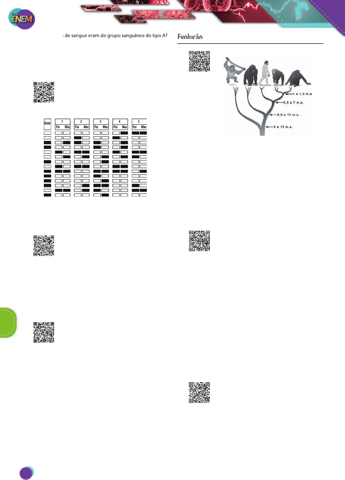 Quantos litros de sangue eram do grupo sanguíneo do tipo A? A) 15 B) 25 C) 30 D) 33 E) 55 28. (Enem-2013) Cinco casais alegavam ser os pais de um bebê. A confirmação da paternidade foi obtida pelo exame de DNA. O resultado do teste está esquematiza- do na figura, em que cada casal apresenta um padrão com duas bandas de DNA (faixas, uma para o suposto pai e outra para a suposta mãe), comparadas à do bebê. Que casal pode ser considerado como pais biológicos do bebê? A) 1 B) 2 C) 3 D) 4 E) 5 29. (Enem-2013) Para a identificação de um rapaz vítima de acidente, fragmentos de tecidos foram retirados e submetidos à extração de DNA nuclear, para com- paração com o DNA disponível dos possíveis fami- liares (pai, avô materno, avó materna, filho e filha). Como o teste com o DNA nuclear não foi conclusivo, os peritos optaram por usar também DNA mitocondrial, para dirimir dúvidas. Para identificar o corpo, os peritos devem verificar se há homo- logia entre o DNA mitocondrial do rapaz e o DNA mitocondrial do(a) A) pai. B) filho. C) filha. D) avó materna. E) avô materno. 30. (Enem-2011) Em 1999, a geneticista Emma Whitelaw desenvolveu um experimento no qual ratas prenhes foram submetidas a uma dieta rica em vitamina B12, ácido fólico e soja. Os filhotes dessas ratas, apesar de possuírem o gene para obesidade, não expressaram essa doença na fase adulta. A autora concluiu que a alimentação da mãe, durante a gestação, silenciou o gene da obesidade. Dez anos depois, as geneticistas Eva Jablonka e Gal Raz listaram 100 casos comprovados de traços adquiridos e transmitidos entre gerações de organismos, sustentando, assim, a epigenética, que estuda as mudanças na atividade dos genes que não envolvem altera- ções na sequência do DNA. (A reabilitação do herege. Época, n. 610, 2010. Adaptado.) Alguns cânceres esporádicos representam exemplos de altera- ção epigenética, pois são ocasionados por A) aneuploidia do cromossomo sexual X. B) polipoidia dos cromossomos autossômicos. C) mutação em genes autossômicos com expressão dominante. D) substituição no gene da cadeia beta da hemoglobina. E) inativação dos genes por meio de modificações nas bases nitrogenadas. Evolução 31. (Enem-2017) A árvore filogenética representa uma hipótese evolutiva para a família Hominidae, na qual a sigla “m.a.” significa “milhões de anos atrás”. As ilustrações representam, da esquerda para a direita, o orangotango, o gorila, o ser humano, o chimpanzé e o bonobo. (Disponível em: . Acesso em: 6 dez. 2012. Adaptado.) Considerando a filogenia representada, a maior similaridade genética será encontrada entre os seres humanos e o: A) gorila e bonobo. B) gorila e chimpanzé. C) gorila e orangotango. D) chimpanzé e bonobo. E) bonobo e orangotango. 32. (Enem-2017) Atualmente, o medicamento de escolha para o tratamento da esquistossomose causada por todas as espécies do verme Schistosoma é o praqui- zentel (PQZ). Apesar de ser eficaz e seguro, seu uso em larga escala e tratamentos repetitivos em áreas endêmicas têm provocado a seleção de linhagens resistentes. (LAGE, R. C. G. Disponível em: . Acesso em: 17 dez. 2012. Adaptado.) Qual é o mecanismo de seleção dos vermes resistentes citados? A) Os vermes tornam-se resistentes ao entrarem em contato com o medicamento quando invadem muitos hospedeiros. B) Os vermes resistentes absorvem o medicamento, passan- do-o para seus descendentes, que também se tornam resistentes. C) Os vermes resistentes transmitem resistência ao medica- mento quando entram em contato com outros vermes dentro do hospedeiro. D) Os vermes resistentes tendem a sobreviver e produzir mais descendentes do que os vermes sobre os quais o medica- mento faz efeito. E) Os vermes resistentes ao medicamento tendem a eliminar os vermes que não são resistentes, fazendo com que ape- nas os mais fortes sobrevivam. 33. (Enem-2016) Apesar da grande diversidade biológica, a hipótese de que a vida na Terra tenha tido uma única origem comum é aceita pela comunidade científica. Uma evidência que apoia essa hipótese é a observação de processos biológicos comuns a todos os seres vivos atualmente existentes. Um exemplo de tal processo é o(a) A) desenvolvimento embrionário. B) reprodução sexuada. C) respiração aeróbica. D) excreção urinária. E) síntese proteica. BiologiaBiologia Quantos litros de sangue eram do grupo sanguíneo do tipo A? Evolução BiologiaBiologia 316 PG18EA445SD00_QE_2018_MIOLO.indb 316 26/02/2018 16:46:34