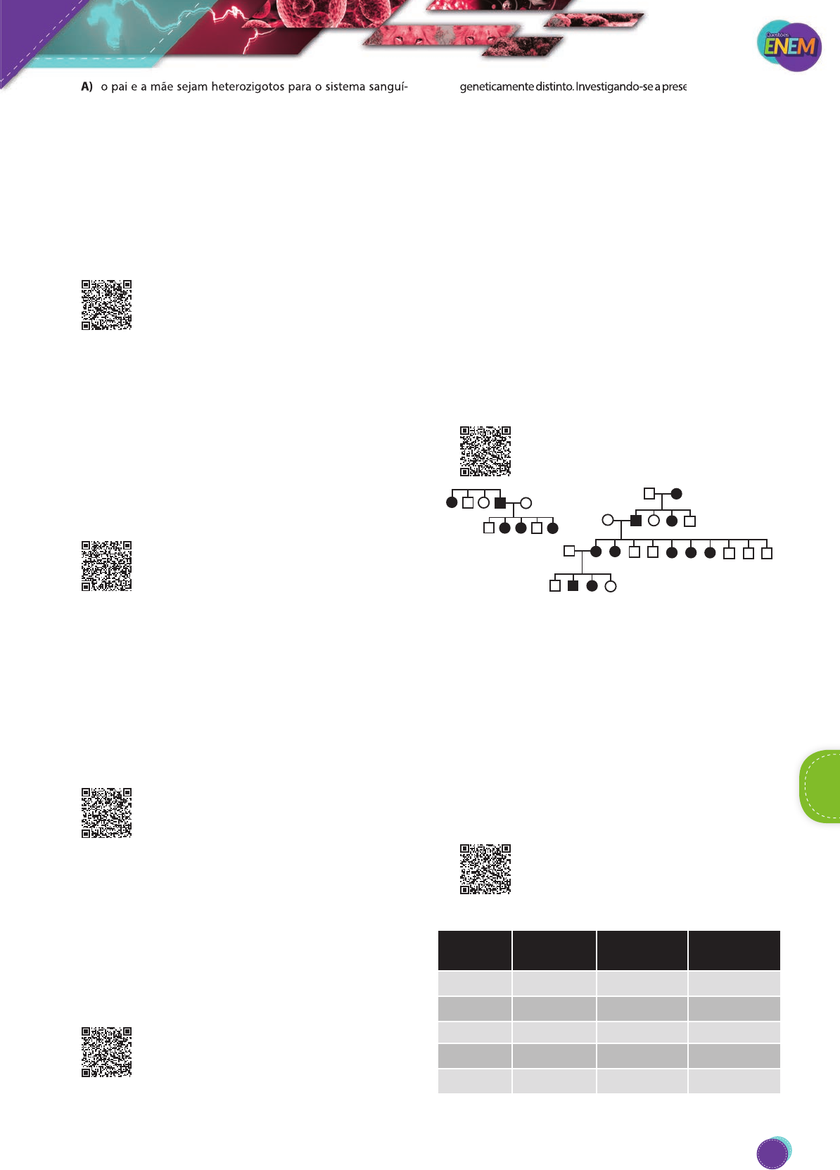 A) o pai e a mãe sejam heterozigotos para o sistema sanguí- neo ABO e para o fator Rh. B) o pai e a mãe sejam heterozigotos para o sistema sanguí- neo ABO e homozigotos para o fator Rh. C) o pai seja homozigoto para as duas características e a mãe heterozigota para as duas características. D) o pai seja homozigoto para as duas características e a mãe heterozigota para o sistema ABO e homozigota para o fa- tor Rh. E) o pai seja homozigoto para o sistema ABO e heterozi- goto para o fator Rh e a mãe homozigota para as duas características. 22. (Enem-2016) Em um hospital, acidentalmente, uma funcionária ficou exposta a alta quantidade de radia- ção liberada por um aparelho de raios X em funcio- namento. Posteriormente, ela engravidou e seu filho nasceu com grave anemia. Foi verificado que a criança apresen- tava a doença devido à exposição anterior da mãe à radiação. O que justifica, nesse caso, o aparecimento da anemia na criança? A) A célula-ovo sofreu uma alteração genética. B) As células somáticas da mãe sofreram uma mutação. C) A célula gamética materna que foi fecundada sofreu uma mutação. D) As hemácias da mãe que foram transmitidas à criança não eram normais. E) As células hematopoiéticas sofreram alteração do número de cromossomos. 23. (Enem-2015) A cariotipagem é um método que ana- lisa células de um indivíduo para determinar seu padrão cromossômico. Essa técnica consiste na montagem fotográfica, em sequência, dos pares de cromossomos e permite identificar um indivíduo normal (46, XX ou 46, XY) ou com alguma alteração cromossômica. A investi- gação do cariótipo de uma criança do sexo masculino com al- terações morfológicas e comprometimento cognitivo verificou que ela apresentava fórmula cariotípica 47, XY, +18. A alteração cromossômica da criança pode ser classificada como A) estrutural, do tipo deleção. B) numérica, do tipo euploidia. C) numérica, do tipo poliploidia. D) estrutural, do tipo duplicação. E) numérica, do tipo aneuploidia. 24. (Enem-2015) A fenilcetonúria é uma doença heredi- tária autossômica recessiva, associada à mutação do gene PAH, que limita a metabolização do aminoácido fenilalanina. Por isso, é obrigatório, por lei, que as embalagens de alimentos, como refrigerantes dietéticos, infor- mem a presença de fenilalanina em sua composição. Uma mulher portadora de mutação para o gene PAH tem três filhos normais, com um homem normal, cujo pai sofria de fenilceto- núria, devido à mesma mutação no gene PAH encontrada em um dos alelos da mulher. Qual a probabilidade de a quarta criança gerada por esses pais apresentar fenilcetonúria? A) 0% B) 12,5% C) 25% D) 50% E) 75% 25. (Enem-2015) Um importante princípio da Biologia, re- lacionado à transmissão de caracteres e à embriogênese humana, foi quebrado com a descoberta do microqui- merismo fetal. Microquimerismo é o nome dado ao fe- nômeno biológico referente a uma pequena população de células ou DNA presente em um indivíduo, mas derivada de um organismo geneticamente distinto. Investigando-se a presença do cromossomo Y, foi revelado que diversos tecidos de mulheres continham células masculinas. A análise do histórico médico revelou uma correlação extremamen- te curiosa: apenas as mulheres que antes tiveram filhos homens apresentaram microquimerismo masculino. Essa correlação levou à interpretação de que existe uma troca natural entre células do feto e maternas durante a gravidez. (MUOTRI, A. Você não é só você: carregamos células maternas na maioria de nossos órgãos. Disponível em: . Acesso em: 4 dez. 2012. Adaptado.) O princípio contestado com essa descoberta, relacionado ao desenvolvimento do corpo humano, é o de que A) o fenótipo das nossas células pode mudar por influência do ambiente. B) a dominância genética determina a expressão de alguns genes. C) as mutações genéticas introduzem variabilidade no genoma. D) as mitocôndrias e o seu DNA provêm do gameta materno. E) as nossas células corporais provêm de um único zigoto. 26. (Enem-2014) No heredograma, os símbolos preenchidos representam pessoas portadoras de um tipo raro de doença genética. Os homens são representados pelos quadrados e as mulheres, pelos círculos. Qual é o padrão de herança observado para essa doença? A) Dominantes autossômico, pois a doença aparece em am- bos os sexos. B) Recessivo ligado ao sexo, pois não ocorre a transmissão do pai para os filhos. C) Recessivo ligado ao Y, pois a doença é transmitida dos pais heterozigotos para os filhos. D) Dominante ligado ao sexo, pois todas as filhas de homens afetados também apresentam a doença. E) Condominante autossômico, pois a doença é herdada pe- los filhos de ambos os sexos, tanto do pai quanto da mãe. 27. (Enem-2014) Em um hospital havia cinco lotes de bolsas de sangue, rotulados com os códigos I, II, III, IV e V. Cada lote continha apenas um tipo sanguíneo não identificado. Uma funcionária do hospital resol- veu fazer a identificação utilizando dois tipos de soro, anti-A e anti-B. Os resultados obtidos estão descritos no quadro. Código dos lotes Volume de Sangue (L) Soro anti-A Soro anti-B I 22 Não aglutinou Aglutinou II 25 Aglutinou Não aglutinou III 30 Aglutinou Aglutinou IV 15 Não aglutinou Não aglutinou V 33 Não aglutinou Aglutinou A) o pai e a mãe sejam heterozigotos para o sistema sanguí- geneticamente distinto. Investigando-se a presença do cromossomo BiologiaBiologia BiologiaBiologia 315 PG18EA445SD00_QE_2018_MIOLO.indb 315 26/02/2018 16:46:33