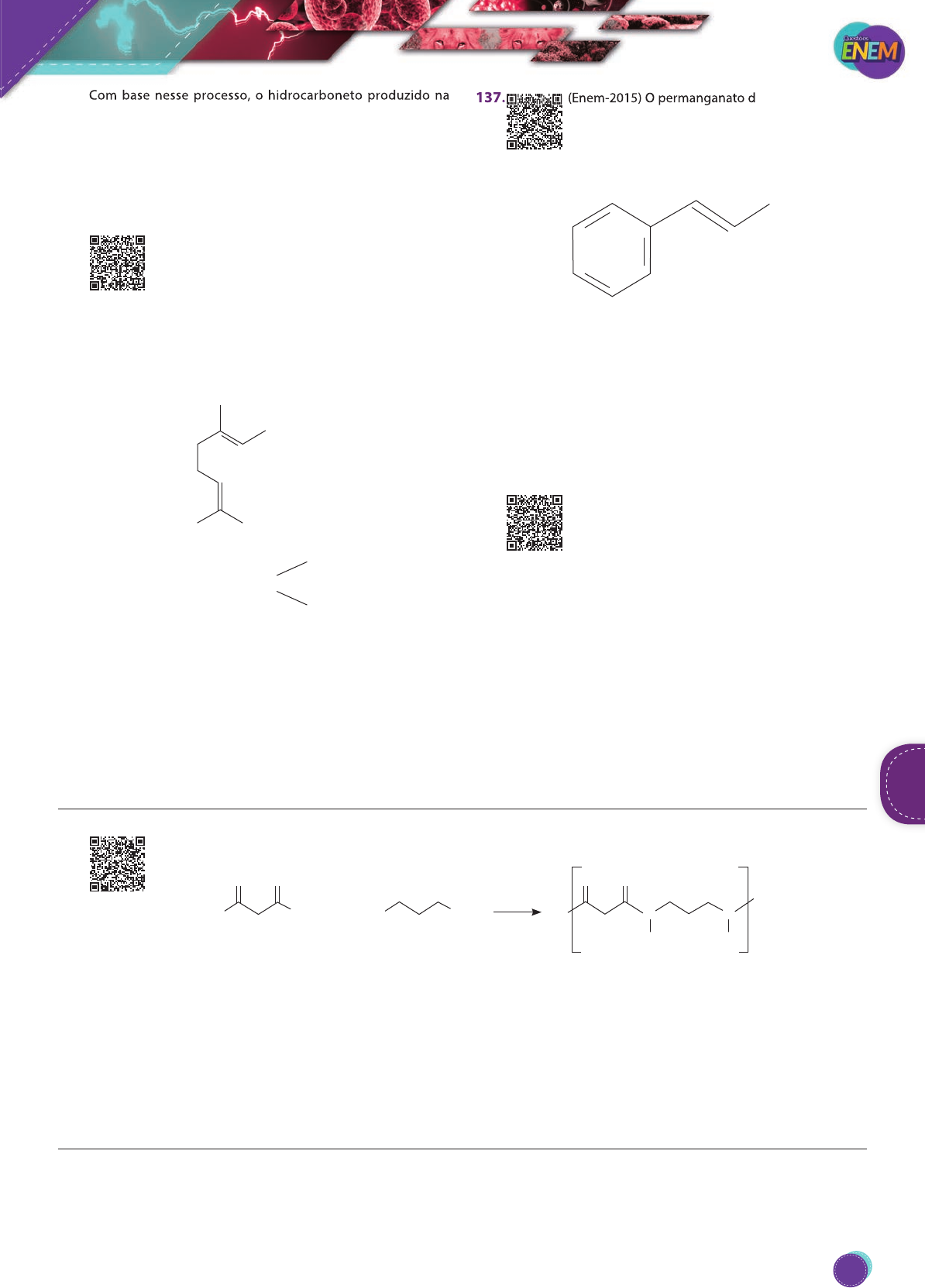Com base nesse processo, o hidrocarboneto produzido na eletrólise do ácido 3,3-dimetil-butanoico é o A) 2,2,7,7-tetrametil-octano. B) 3,3,4,4-tetrametil-hexano. C) 2,2,5,5-tetrametil-hexano. D) 3,3,6,6-tetrametil-octano. E) 2,2,4,4-tetrametil-hexano. 136. (Enem-2015) Uma forma de organização de um sis- tema biológico é a presença de sinais diversos utili- zados pelos indivíduos para se comunicarem. No caso das abelhas da espécie Apis mellifera, os sinais utili- zados podem ser feromônios. Para saírem e voltarem de suas colmeias, usam um feromônio que indica a trilha percorrida por elas (Composto A). Quando pressentem o perigo, expelem um feromônio de alarme (Composto B), que serve de sinal para um combate coletivo. O que diferencia cada um desses sinais utili- zados pelas abelhas são as estruturas e funções orgânicas dos feromônios. CH2OH Composto A Composto B CH3COO(CH2)CH CH3 CH3 (QUADROS, A. L. Os feromônios e o ensino de química. Química Nova na Escola, n. 7, maio 1998. Adaptado.) As funções orgânicas que caracterizam os feromônios de trilha e de alarme são, respectivamente, A) álcool e éster. B) aldeído e cetona. C) éter e hidrocarboneto. D) enol e ácido carboxílico. E) ácido carboxílico e amida. 137. (Enem-2015) O permanganato de potássio (KMnO4) é um agente oxidante forte muito empregado tanto em nível laboratorial quanto industrial. Na oxidação de alcenos de cadeia normal, como o 1-fenil-1-pro- peno, ilustrado na figura, o KMnO4 é utilizado para a produção de ácidos carboxílicos. 1-fenil-1-propeno Os produtos obtidos na oxidação do alceno representado, em solução aquosa de KMnO4, são A) ácido benzoico e ácido etanoico. B) ácido benzoico e ácido propanoico. C) ácido etanoico e ácido 2-feniletanoico. D) ácido 2-feniletanoico e ácido metanoico. E) ácido 2-feniletanoico e ácido propanoico. 138. (Enem-2015) Além de ser uma prática ilegal, a adul- teração de combustíveis é prejudicial ao meio am- biente, ao governo e, especialmente, ao consumidor final. Em geral, essa adulteração é feita utilizando compostos com propriedades físicas semelhantes às do com- bustível, mas de menor valor agregado. Considerando um combustível com 20% de adulterante, a mistura em que a adulteração seria identificada visualmente é A) etanol e água. B) etanol e acetona. C) gasolina e água. D) gasolina e benzeno. E) gasolina e querosene. 139. (Enem-2015) O Nylon® é um polímero (uma poliamida) obtido pela reação do ácido adípico com a hexametilenodiamina, como indicado no esquema reacional. ácido hexanodioico (ácido adípico) O HO ( ) ( ) ( ) ( )OH H2N NH2 H 444 4N N n n H H2O OO O 1,6-diamino-hexano (hexametilenodiamina) Nylon 6,6 Na época da invenção desse composto, foi proposta uma nomenclatura comercial, baseada no número de átomos de carbono do diácido carboxílico, seguido do número de carbonos da diamina. De acordo com as informações do texto, o nome comercial de uma poliamida resultante da reação do ácido butanodioico com o 1,2-dia- mino-etano é A) Nylon 4,3. B) Nylon 6,2. C) Nylon 3,4. D) Nylon 4,2. E) Nylon 2,6. Com base nesse processo, o hidrocarboneto produzido na 137. (Enem-2015) O permanganato de potássio (KMnO QuímicaQuímica QuímicaQuímica 305 PG18EA445SD00_QE_2018_MIOLO.indb 305 26/02/2018 16:46:22