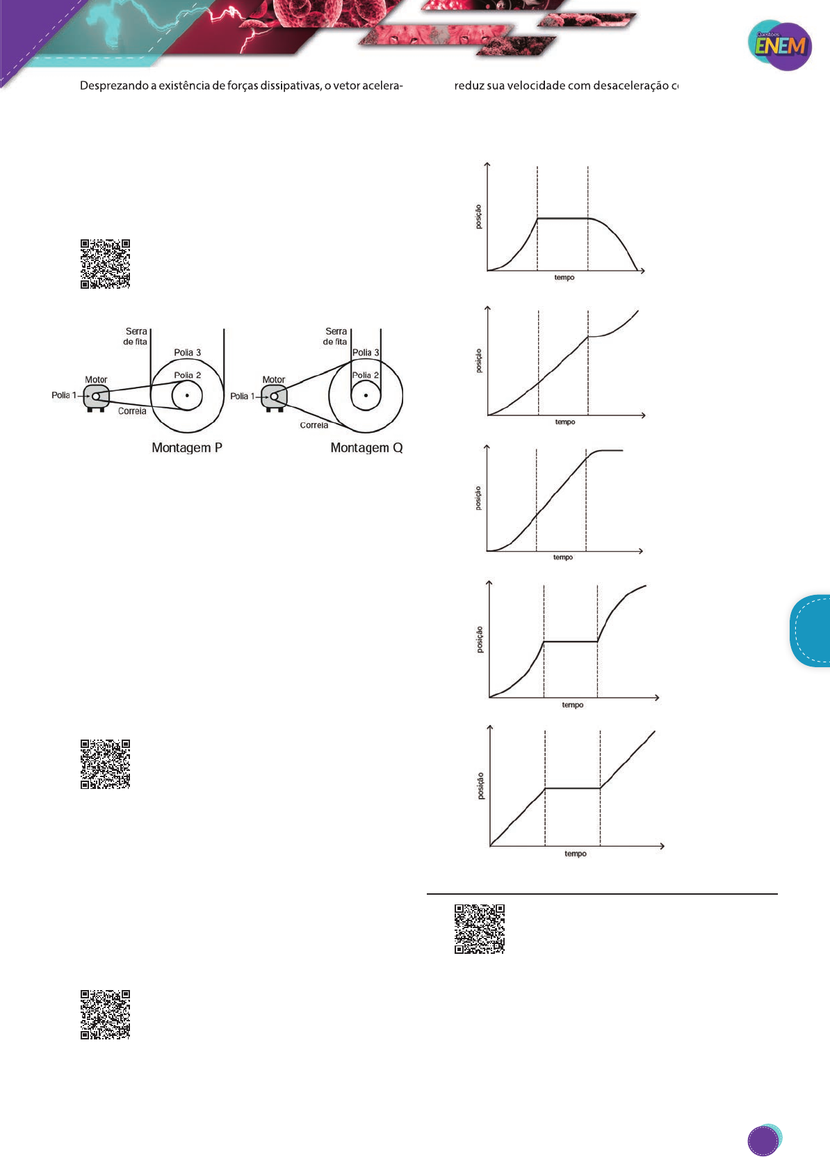 Desprezando a existência de forças dissipativas, o vetor acelera- ção tangencial do coelhinho, no terceiro quadrinho, é A) nulo. B) paralelo à sua velocidade linear e no mesmo sentido. C) paralelo à sua velocidade linear e no sentido oposto. D) perpendicular à sua velocidade linear e dirigido para o centro da Terra. E) perpendicular à sua velocidade linear e dirigido para fora da superfície da Terra. 7. (Enem-2013) Para serrar ossos e carnes congeladas, um açougueiro utiliza uma serra de fita que possui três polias e um motor. O equipamento pode ser montado de duas formas diferentes, P e Q. Por ques- tão de segurança, é necessário que a serra possua menor velo- cidade linear. Por qual montagem o açougueiro deve optar e qual a justifica- tiva desta opção? A) Q, pois as polias 1 e 3 giram com velocidades lineares iguais em pontos periféricos e a que tiver maior raio terá menor frequência. B) Q, pois as polias 1 e 3 giram com frequências iguais e a que tiver maior raio terá menor velocidade linear em um ponto periférico. C) P, pois as polias 2 e 3 giram com frequências diferentes e a que tiver maior raio terá menor velocidade linear em um ponto periférico. D) P, pois as polias 1 e 2 giram com diferentes velocidades li- neares em pontos periféricos e a que tiver menor raio terá maior frequência. E) Q, pois as polias 2 e 3 giram com diferentes velocidades li- neares em pontos periféricos e a que tiver maior raio terá menor frequência. 8. (Enem-2012) Uma empresa de transportes precisa efetuar a entrega de uma encomenda o mais breve possível. Para tanto, a equipe de logística analisa o trajeto desde a empresa até o local da entrega. Ela verifica que o trajeto apresenta dois trechos de distâncias dife- rentes e velocidades máximas permitidas diferentes. No primeiro trecho, a velocidade máxima permitida é de 80 km/h e a distância a ser percorrida é de 80 km. No segundo trecho, cujo compri- mento vale 60 km, a velocidade máxima permitida é 120 km/h. Supondo que as condições de trânsito sejam favoráveis para que o veículo da empresa ande continuamente na velocidade máxima permitida, qual será o tempo necessário, em horas, para a realização da entrega? A) 0,7 B) 1,4 C) 1,5 D) 2,0 E) 3,0 9. (Enem-2012) Para melhorar a mobilidade urbana na rede metroviária, é necessário minimizar o tempo entre estações. Para isso a administração do metrô de uma grande cidade adotou o seguinte procedimento entre duas estações: a locomotiva parte do repouso em aceleração constante por um terço do tempo de percurso, mantém a velocidade constante por outro terço e reduz sua velocidade com desaceleração constante no trecho final, até parar. Qual é o gráfico de posição (eixo vertical) em função do tempo (eixo horizontal) que representa o movi- mento desse trem? A) B) C) D) E) Dinâmica 10. (Enem-2017) Em uma colisão frontal entre dois auto- móveis, a força que o cinto de segurança exerce sobre o tórax e abdômen do motorista pode causar lesões graves nos órgãos internos. Pensando na segurança do seu produto, um fabricante de automóveis realizou testes em cinco modelos diferentes de cinto. Os testes simularam uma co- lisão de 0,30 segundo de duração, e os bonecos que representa- vam os ocupantes foram equipados com acelerômetros. Esse equipamento registra o módulo da desaceleração do boneco em função do tempo. Os parâmetros como massa dos bonecos, di- mensões dos cintos e velocidade imediatamente antes e após o impacto foram os mesmos para todos os testes. O resultado final obtido está no gráfico de aceleração por tempo. Desprezando a existência de forças dissipativas, o vetor acelera- reduz sua velocidade com desaceleração constante no trecho FísicaFísica FísicaFísica 249 PG18EA445SD00_QE_2018_MIOLO.indb 249 26/02/2018 16:45:05