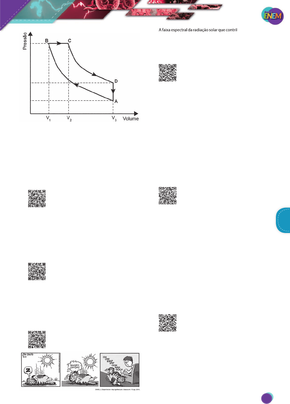 No ciclo Diesel, o calor é absorvido em: A) A → B e C → D, pois em ambos ocorre realização de trabalho. B) A → B e B → C, pois em ambos ocorre elevação da temperatura. C) C → D, pois representa uma expansão adiabática e o siste- ma realiza trabalho. D) A → B, pois representa uma compressão adiabática em que ocorre elevação da temperatura. E) B → C, pois representa expansão isobárica em que o siste- ma realiza trabalho e a temperatura se eleva. 45. (Enem-2017) O aproveitamento da luz solar como fonte de energia renovável tem aumentado signifi- cativamente nos últimos anos. Uma das aplicações é o aquecimento de água (ρágua = 1 kg/L) para uso residencial. Em um local, a intensidade da radiação solar efeti- vamente captada por um painel solar com área de 1 m2 é de 0,03 kW/m2. O valor do calor específico da água é igual 4,2 kJ/ (kg °C). Nessa situação, em quanto tempo é possível aquecer 1 litro de água de 20°C até 70°C? A) 490s B) 2 800s C) 6 300s D) 7 000s E) 800s 46. (Enem-2017) As especificações de um chuveiro elé- trico são: potência de 4 000 W, consumo máximo mensal de 21,6 kWh e vazão máxima de 3 L/min. Em um mês, durante os banhos, esse chuveiro foi usado com vazão máxima, consumindo o valor máximo de energia especificado. O calor específico da água é de 4 200 J/(kg °C) e sua densidade é igual a 1 kg/L. A variação da temperatura da água usada nesses banhos foi mais próxima de A) 16°C. B) 19°C. C) 37°C. D) 57°C. E) 60°C. 47. (Enem-2017) A faixa espectral da radiação solar que contribui fortemente para o efeito mostrado na tirinha é caracterizada como A) visível. B) amarela. C) vermelha. D) ultravioleta. E) infravermelha 48. (Enem-2016) Durante a primeira fase do projeto de uma usina de geração de energia elétrica, os enge- nheiros da equipe de avaliação de impactos am- bientais procuram saber se esse projeto está de acordo com as normas ambientais. A nova planta estará loca- lizada à beira de um rio, cuja temperatura média da água é de 25°C, e usará a sua água somente para refrigeração. O projeto pretende que a usina opere com 1,0 MW de potência elétrica e, em razão de restrições técnicas, o dobro dessa potência será dissipada por seu sistema de arrefecimento, na forma de calor. Para atender a resolução número 430, de 13 de maio de 2011, do Conselho Nacional do Meio Ambiente, com uma ampla margem de segurança, os engenheiros determinaram que a água só poderá ser devolvida ao rio com um aumento de tem- peratura de, no máximo, 3ºC em relação à temperatura da água do rio captada pelo sistema de arrefecimento. Considere o calor específico da água igual a 4 kJ/(kg°C). Para atender essa determinação, o valor mínimo do fluxo de água, em kg/s, para a refrigeração da usina deve ser mais próximo de A) 42. B) 84. C) 167. D) 250. E) 500. 49. (Enem-2016) Num experimento, um professor deixa duas bandejas de mesma massa, uma de plástico e outra de alumínio, sobre a mesa do laboratório. Após algumas horas, ele pede aos alunos que avaliem a temperatura das duas bandejas, usando para isso o tato. Seus alunos afirmam, categoricamente, que a bandeja de alumínio encontra-se numa temperatura mais baixa. Intrigado, ele propõe uma segunda atividade, em que coloca um cubo de gelo sobre cada uma das bandejas, que estão em equilíbrio térmico com o ambiente, e os questiona em qual delas a taxa de derretimento do gelo será maior. O aluno que responder corretamente ao questionamento do professor dirá que o derretimento ocorrerá A) mais rapidamente na bandeja de alumínio, pois ela tem uma maior condutividade térmica que a de plástico. B) mais rapidamente na bandeja de plástico, pois ela tem ini- cialmente uma temperatura mais alta que a de alumínio. C) mais rapidamente na bandeja de plástico, pois ela tem uma maior capacidade térmica que a de alumínio. D) mais rapidamente na bandeja de alumínio, pois ela tem um calor específico menor que a de plástico. E) com a mesma rapidez nas duas bandejas, pois apresenta- rão a mesma variação de temperatura. 50. (Enem-2016) Para a instalação de um aparelho de ar-condicionado, é sugerido que ele seja colocado na parte superior da parede do cômodo, pois a maioria dos fluidos (líquidos e gases), quando aquecidos, sofrem expansão, tendo sua densidade diminuída e sofrendo um deslocamento ascendente. Por sua vez, quando são resfria- dos, tornam-se mais densos e sofrem um deslocamento descendente. A sugestão apresentada no texto minimiza o consumo de energia, porque A) diminui a umidade do ar dentro do cômodo. B) aumenta a taxa de condução térmica para fora do cômodo. C) torna mais fácil o escoamento da água para fora do cômodo. A faixa espectral da radiação solar que contribui fortemente para FísicaFísica FísicaFísica 257 PG18EA445SD00_QE_2018_MIOLO.indb 257 26/02/2018 16:45:16