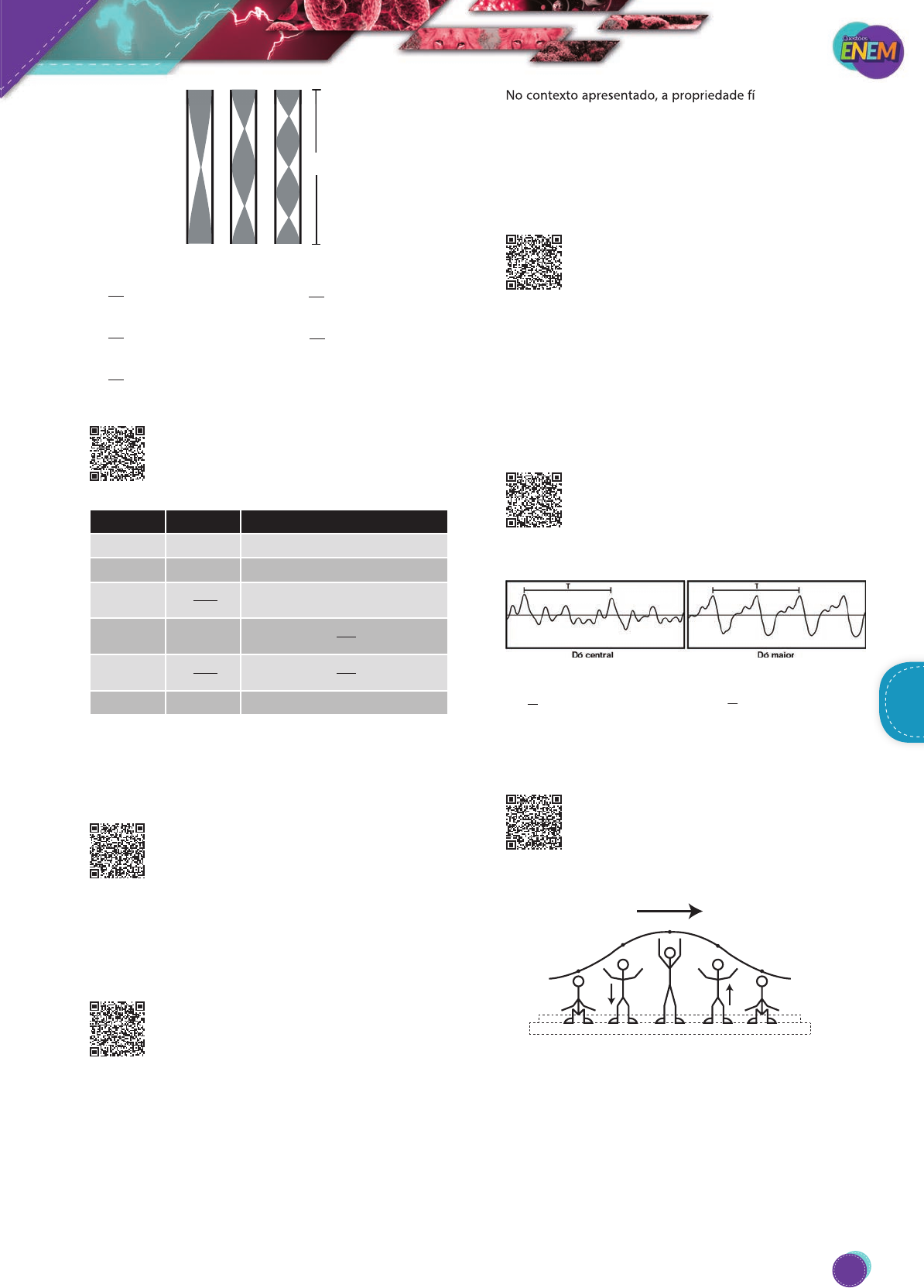 L A B C A) B) C) D) E) 79. (Enem-2015) Durante uma aula experimental de física, os estudantes construíram um sistema ressonante com pêndulos simples. As características de cada pêndulo são apresentadas no quadro. Inicialmente, os estudantes colocaram apenas o pêndulo A para oscilar Pêndulo Massa Comprimento do barbante A M L 1 M L 2 M 2 2L 3 2M L 2 4 M 2 L 2 5 2M L Quais pêndulos, além desse, passaram também a oscilar? A) 1, 2, 3, 4 e 5. B) 1, 2 e 3. C) 1 e 4. D) 1 e 5. E) 3 e 4. 80. (Enem-2014) Ao sintonizarmos uma estação de rádio ou um canal de TV em um aparelho, estamos alteran- do algumas características elétricas de seu circuito receptor. Das inúmeras ondas eletromagnéticas que chegam simultaneamente ao receptor, somente aquelas que oscilam com determinada frequência resultarão em máxima absorção de energia. O fenômeno descrito é a A) difração. B) refração. C) polarização. D) interferência. E) ressonância. 81. (Enem-2014) Quando adolescente, as nossas tardes, após as aulas, consistiam em tomar às mãos o violão e o dicionário de acordes de Almir Chediak e desafiar nosso amigo Hamilton a descobrir, apenas ouvindo o acorde, quais notas eram escolhidas. Sempre perdíamos a aposta, ele possui o ouvido absoluto. O ouvido absoluto é uma característica perceptual de poucos indivíduos capazes de identificar notas isoladas sem outras referências, isto é, sem precisar relacioná-las com outras notas de uma melodia. (LENT, R. O cérebro do meu professor de acórdão. Disponível em: . Acesso: 15 ago. 2012. Adaptado.) L 4 L 5 L 2 L 8 6L 8 No contexto apresentado, a propriedade física das ondas que permite essa distinção entre as notas é a: A) frequência. B) intensidade. C) forma de onda. D) amplitude de onda. E) velocidade de propagação 82. (Enem-2013) Em viagens de avião, é solicitado aos passageiros o desligamento de todos os aparelhos cujo funcionamento envolva a emissão ou a recepção de ondas eletromagnéticas. O procedimento é utili- zado para eliminar fontes de radiação que possam interferir nas comunicações via rádio dos pilotos com a torre de controle. A propriedade das ondas emitidas que justifica o procedimento adotado é o fato de A) terem fases opostas. B) serem ambas audíveis. C) terem intensidades inversas. D) serem de mesma amplitude. E) terem frequências próximas. 83. (Enem-2013) Em um piano, o Dó central e a próxima nota Dó (Dó maior) apresentam sons parecidos, mas não idênticos. É possível utilizar programas compu- tacionais para expressar o formato dessas ondas sonoras em cada uma das situações como apresentado nas fi- guras, em que estão indicados intervalos de tempo idênticos (T). A razão entre as frequências do Dó central e do Dó maior é de A) 1 2 B) 2 C) 1 D) 1 4 E) 4 84. (Enem-2013) Uma manifestação comum das torcidas em estádios de futebol é a ola mexicana. Os espec- tadores de uma linha, sem sair do lugar e sem se deslocarem lateralmente, ficam de pé e se sentam sincronizados com os da linha adjacente. O efeito coletivo se propaga pelos espectadores do estádio, formando uma onda progressiva, conforme ilustração. Calcula-se que a velocidade de propagação dessa “onda hu- mana” é 45 km/h, e que cada período de oscilação contém 16 pessoas, que se levantam e sentam organizadamente e distan- ciadas entre si por 80 cm. (Disponível em: . Acesso em: 7 dez. 2012. Adaptado.) Nessa ola mexicana, a frequência da onda, em hertz, é um valor mais próximo de: A) 0,3. B) 0,5. C) 1,0. D) 1,9. E) 3,7. No contexto apresentado, a propriedade física das ondas que FísicaFísica FísicaFísica 263 PG18EA445SD00_QE_2018_MIOLO.indb 263 26/02/2018 16:45:24