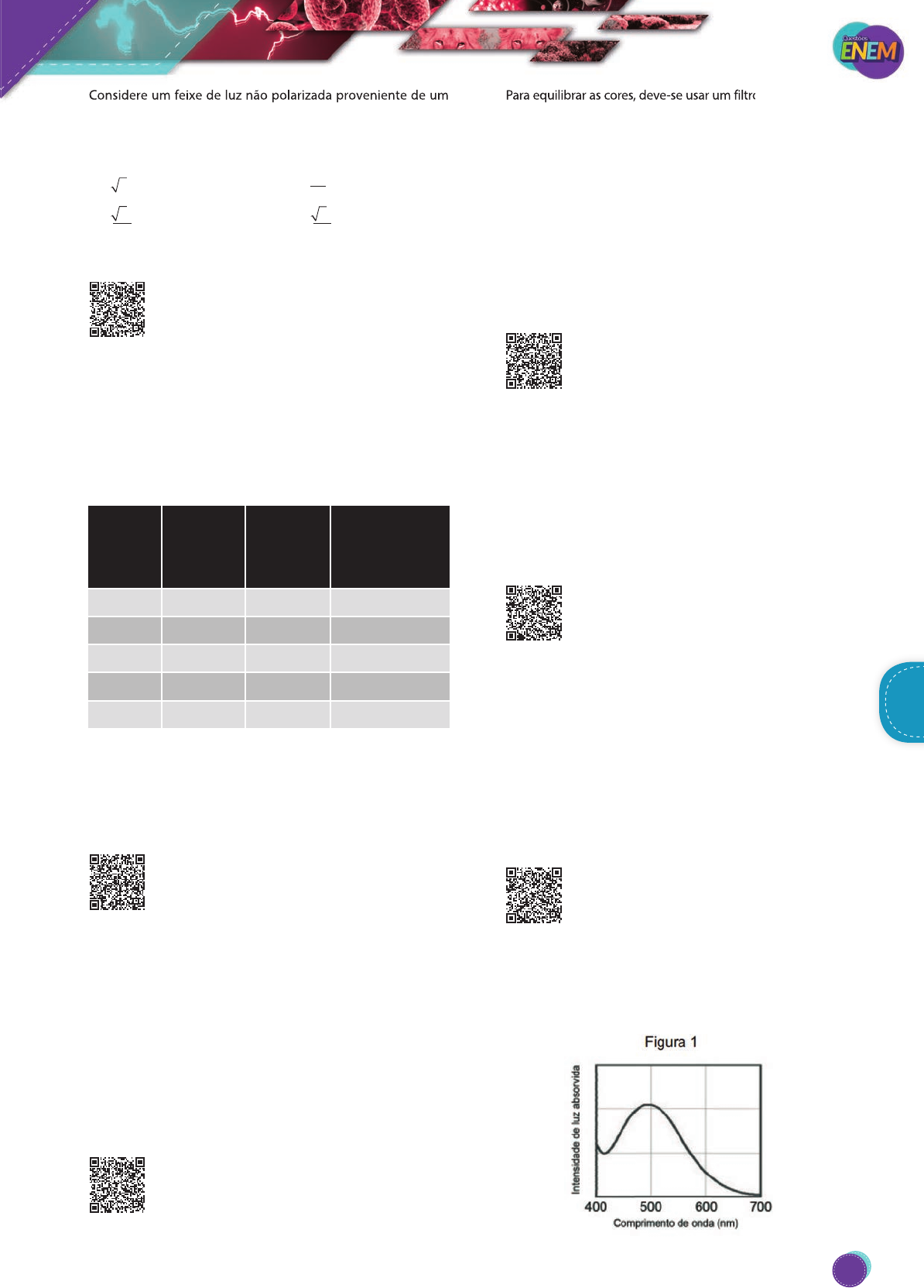 Considere um feixe de luz não polarizada proveniente de um meio com índice de refração igual a 1, que incide sobre uma lâmina e faz um ângulo de refração θr de 30°. Nessa situação, qual deve ser o índice de refração da lâmina para que o feixe refletido seja polarizado? A) 3 B) 3 3 C) 2 D) E) 3 2 98. (Enem-2014) As lentes fotocromáticas escurecem quando expostas à luz solar por causa de reações químicas reversíveis entre uma espécie incolor e outra colorida. Diversas reações podem ser utilizadas, e a escolha do melhor reagente para esse fim se baseia em três principais aspectos: (i) o quanto escurece a lente, (ii) o tempo de escurecimento quando exposta à luz solar; e (iii) o tempo de esmaecimento em ambiente sem forte luz solar. A transmitância indica a razão entre a quantidade de luz que atravessa o meio e a quantidade de luz que incide sobre ele. Durante um teste de controle para o desenvolvimento de novas lentes fotocromáticas, foram analisadas cinco amostras, que utilizam reagentes químicos diferentes. No quadro, são apre- sentados os resultados. Amostra Tempo de escure- cimento (segundo) Tempo de esmae- cimento (segundo) Transmitância média da lente quando exposta a luz solar (%) 1 20 50 80 2 40 30 90 3 20 30 50 4 50 50 50 5 40 20 95 Considerando os três aspectos, qual é a melhor amostra de lente fotocromáticas para se utilizar em óculos? A) 1 B) 2 C) 3 D) 4 E) 5 99. (Enem-2014) Uma proposta de dispositivo capaz de indicar a qualidade da gasolina vendidas em postos e, consequentemente, evitar fraudes, poderia utilizar o conceito de refração luminosa. Nesse sentido, a gasolina não adulterada, na temperatura ambiente, apresenta razão entre os senos dos raios incidente e refratado igual a 1,4. Desse modo, fazendo incidir o feixe de luz proveniente do ar com um ângulo fixo e maior que zero, qualquer modificação no ângulo do feixe refratado indicará a adulteração no combustível. Em uma fiscalização rotineira, o teste apresentou o valor de 1,9. Qual foi o comportamento do raio refratado? A) Mudou de sentido. B) Sofreu reflexão total. C) Atingiu o valor do ângulo limite. D) Direcionou-se para a superfície de separação. E) Aproximou-se da normal à superfície de separação. 100. (Enem-2014) É comum aos fotógrafos tirar fotos colori- das em ambientes iluminados por lâmpadas fluores- centes, que contém uma forte composição de luz verde. A consequência desse fato na fotografia é que todos os objetos claros, principalmente os brancos, aparecerão esverdeados. 1 2 Para equilibrar as cores, deve-se usar um filtro adequado para di- minuir a intensidade da luz verde que chega aos sensores da câmera fotográfica. Na escolha desse filtro, utiliza-se o conhecimento da composição das cores-luz primárias: vermelho, verde e azul; e das cores-luz secundárias: amarelo = vermelho + verde, ciano = verde + azul e magenta = vermelho + azul. (Disponível em: . Acesso em: 20 maio 2014. Adaptado.) Na situação descrita, qual deve ser o filtro utilizado para que a fotografia apresente as cores naturais dos objetos? A) Ciano. B) Verde. C) Amarelo. D) Magenta. E) Vermelho. 101. (Enem-2012) Nossa pele possui células que reagem à incidência de luz ultravioleta e produzem uma substância chamada melanina, responsável pela pigmentação da pele. Pensando em se bronzear, uma garota vestiu um biquíni, acendeu a luz de seu quarto e deitou-se exatamente abaixo da lâmpada incandescente. Após várias horas ela percebeu que não conseguiu resultado algum. O bronzeamento não ocorreu porque a luz emitida pela lâmpada incandescente é de A) baixa intensidade. B) baixa frequência. C) um espectro contínuo. D) amplitude inadequada. E) curto comprimento de onda. 102. (Enem-2012) Alguns povos indígenas ainda preser- vam suas tradições realizando a pesca com lanças, demonstrando uma notável habilidade. Para fisgar um peixe em um lago com águas tranquilas, o índio deve mirar abaixo da posição em que enxerga o peixe. Ele deve proceder dessa forma porque os raios de luz A) refletidos pelo peixe não descrevem uma trajetória retilí- nea no interior da água. B) emitidos pelos olhos do índio desviam sua trajetória quan- do passam do ar para a água. C) espalhados pelo peixe são refletidos pela superfície da água. D) emitidos pelos olhos do índio são espalhados pela super- fície da água. E) refletidos pelo peixe desviam sua trajetória quando pas- sam da água para o ar. 103. (Enem-2011) Para que uma substância seja colorida, ela deve absorver luz na região do visível. Quando uma amostra absorve luz visível, a cor que percebe- mos é a soma das cores restantes que são refletidas ou transmitidas pelo objeto. A Figura 1 mostra o espectro de absorção para uma substância e é possível observar que há um comprimento de onda em que a intensidade de absorção é máxima. Um observador pode prever a cor dessa substância pelo uso da roda de cores (Figura 2): o comprimento de onda correspondente à cor do objeto é encontrado no lado oposto ao comprimento de onda da absorção máxima. Considere um feixe de luz não polarizada proveniente de um Para equilibrar as cores, deve-se usar um filtro adequado para di- FísicaFísica FísicaFísica 267 PG18EA445SD00_QE_2018_MIOLO.indb 267 26/02/2018 16:45:30
