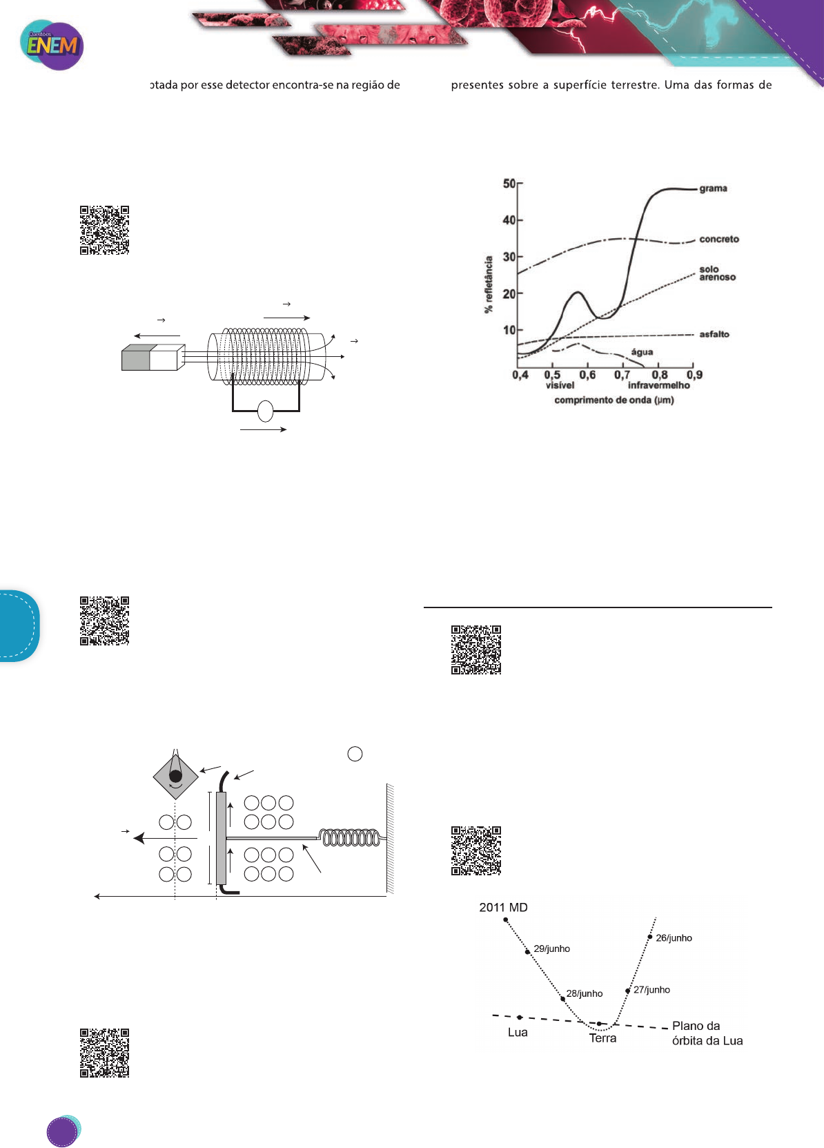 A radiação captada por esse detector encontra-se na região de frequência A) da luz visível. B) do ultravioleta. C) do infravermelho. D) das micro-ondas. E) das ondas longas de rádio. 138. (Enem-2014) O funcionamento dos geradores de usinas elétricas baseia-se no fenômeno da indução eletromagnética, descoberto por Michael Faraday no século XIX. Pode-se observar esse fenômeno ao se movimentar um ímã e uma espira em sentidos opostos com módulo da velocidade igual a v, induzindo uma corrente elétrica de intensidade i, como ilustrados na figura. NS A B i v v A fim de se obter uma corrente com o mesmo sentido da apresentada na figura, utilizando os mesmos materiais, outra possibilidade é mover a espira para a A) esquerda e o ímã para a direita com polaridade invertida. B) direita e o ímã para a esquerda com polaridade invertida. C) esquerda e o ímã para a esquerda com mesma polaridade. D) direita e manter o ímã em repouso com polaridade invertida. E) esquerda e manter o ímã em repouso com mesma polaridade. 139. (Enem-2013) Desenvolve-se um dispositivo para abrir automaticamente uma porta no qual um botão, quando acionado, faz com que uma corrente elétrica i = 6 A percorra uma barra condutora de comprimento L = 5 cm, cujo ponto médio está preso a uma mola de constante elástica k = 5 · 10–2 N/cm. O sistema mola-condutor está imerso em um campo magnético uniforme perpendicular ao plano. Quando acionado o botão, a barra sairá da posição de equilíbrio a uma velocidade média de 5 m/s e atingirá a catraca em 6 mi- lisegundos, abrindo a porta. x (cm) C 0 mola isolante fio catraca x x x x x x x x x x x x x x x x x x i L k x B v i A intensidade do campo magnético, para que o dispositivo funcione corretamente, é de A) 5 · 10–1T. B) 5 · 10–2T. C) 5 · 101T. D) 2 · 10–2T. E) 2 · 100T. 140. (Enem-2011) O processo de interpretação de ima- gens capturadas por sensores instalados a bordo de satélites que imageiam determinadas faixas ou bandas do espectro de radiação eletromagnética (REM) baseiam-se na interação dessa radiação com os objetos presentes sobre a superfície terrestre. Uma das formas de avaliar essa interação é por meio da quantidade de energia refletida pelos objetos. A relação entre a refletância de um dado objeto e o comprimento de onda da REM é conhecida como curva de comportamento espectral ou assinatura espec- tral do objeto, como mostrado na figura, para objetos comuns na superfície terrestre. (D’ARCO, E. Radiometria e comportamento espectral de alvos. INPE. Disponível em: . Acesso em: 3 maio 2009.) De acordo com as curvas de assinatura espectral apresentadas na figura, para que se obtenha a melhor discriminação dos alvos mostrados, convém selecionar a banda correspondente a que comprimento de onda em micrômetros (μm)? A) 0,4 a 0,5. B) 0,5 a 0,6. C) 0,6 a 0,7. D) 0,7 a 0,8. E) 0,8 a 0,9. Gravitação 141. (Enem-2017) Sabe-se que a posição em que o Sol nasce ou se põe no horizonte muda de acordo com a estação do ano. Olhando-se em direção ao poente, por exemplo, para um observador no Hemisfério Sul, o Sol se põe mais à direita no inverno do que no verão. O fenômeno descrito deve-se à combinação de dois fatores: a inclinação do eixo de rotação terrestre e a A) precessão do periélio terrestre. B) translação da Terra em torno do Sol. C) nutação do eixo de rotação da Terra. D) precessão do eixo de rotação da Terra. E) rotação da Terra em torno de seu próprio eixo. 142. (Enem-2016) No dia 27 de junho de 2011, o asteroide 2011 MD, com cerca de 10 m de diâmetro, passou a 12 mil quilômetros do planeta Terra, uma distância menor do que a órbita de um satélite. A trajetória do asteroide é apresentada na figura. A explicação física para a trajetória descrita é o fato de o asteroide FísicaFísica A radiação captada por esse detector encontra-se na região de presentes sobre a superfície terrestre. Uma das formas de FísicaFísica 274 PG18EA445SD00_QE_2018_MIOLO.indb 274 26/02/2018 16:45:40