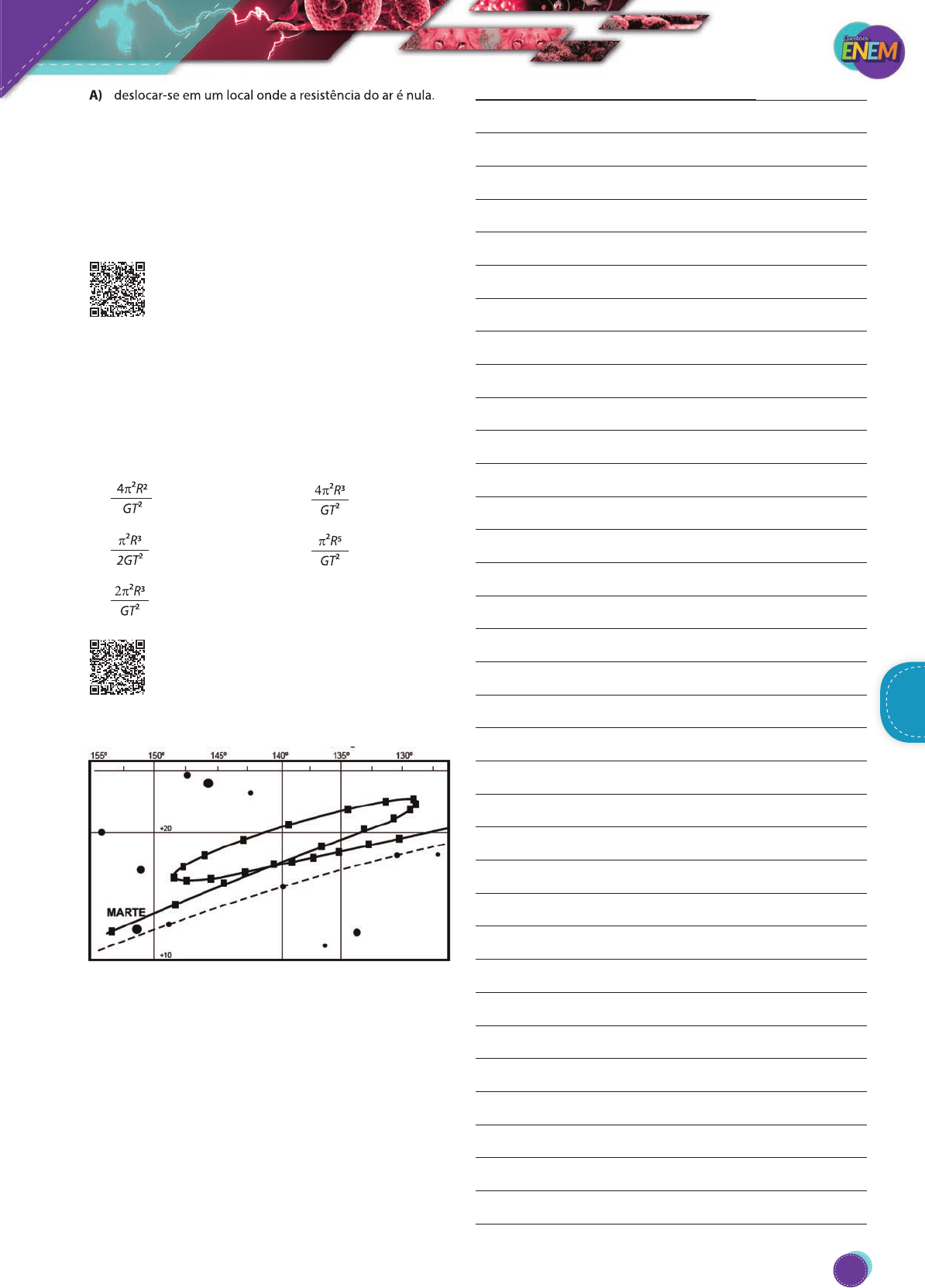 A) deslocar-se em um local onde a resistência do ar é nula. B) deslocar-se em um ambiente onde não há interação gravitacional. C) sofrer a ação de uma força resultante no mesmo sentido de sua velocidade. D) sofrer a ação de uma força gravitacional resultante no sen- tido contrário ao de sua velocidade. E) estar sob a ação de uma força resultante cuja direção é di- ferente da direção de sua velocidade. 143. (Enem-2015) Observações astronômicas indicam que no centro de nossa galáxia, a Via Láctea, provavel- mente exista um buraco negro cuja massa é igual a milhares de vezes a massa do Sol. Uma técnica sim- ples para estimar a massa desse buraco negro consiste em ob- servar algum objeto que orbite ao seu redor e medir o período de uma rotação completa, T, bem como o raio médio, R, da órbita do objeto, que supostamente se desloca, com boa aproximação, em movimento circular uniforme. Nessa situação, considere que a força resultante, devido ao movimento circular, é igual, em magnitude, à força gravitacional que o buraco negro exerce sobre o objeto. A partir do conhecimento do período de rotação, da distância média e da constante gravitacional, G, a massa do buraco negro é A) B) C) D) E) 144. (Enem-2012) A característica que permite identificar um planeta no céu é o seu movimento relativo às estrelas fixas. Se observarmos a posição de um pla- neta por vários dias, verificaremos que sua posição em relação às estrelas fixas se modifica regularmente. A figura destaca o movimento de Marte observado em intervalos de 10 dias, registrado da Terra. (Projecto Física. Lisboa: Fundação Calouste Gulbenkian, 1980. Adaptado.) Qual a causa da forma da trajetória do planeta Marte registrada na figura? A) A maior velocidade orbital da Terra faz com que, em certas épocas, ela ultrapasse Marte. B) A presença de outras estrelas faz com que sua trajetória seja desviada por meio da atração gravitacional. C) A órbita de Marte, em torno do Sol, possui uma forma elíp- tica mais acentuada que a dos demais planetas. D) A atração gravitacional entre a Terra e Marte faz com que este planeta apresente uma órbita irregular em torno do Sol. E) A proximidade de Marte com Júpiter, em algumas épocas do ano, faz com que a atração gravitacional de Júpiter in- terfira em seu movimento. A) deslocar-se em um local onde a resistência do ar é nula. FísicaFísica FísicaFísica 275 PG18EA445SD00_QE_2018_MIOLO.indb 275 26/02/2018 16:45:41