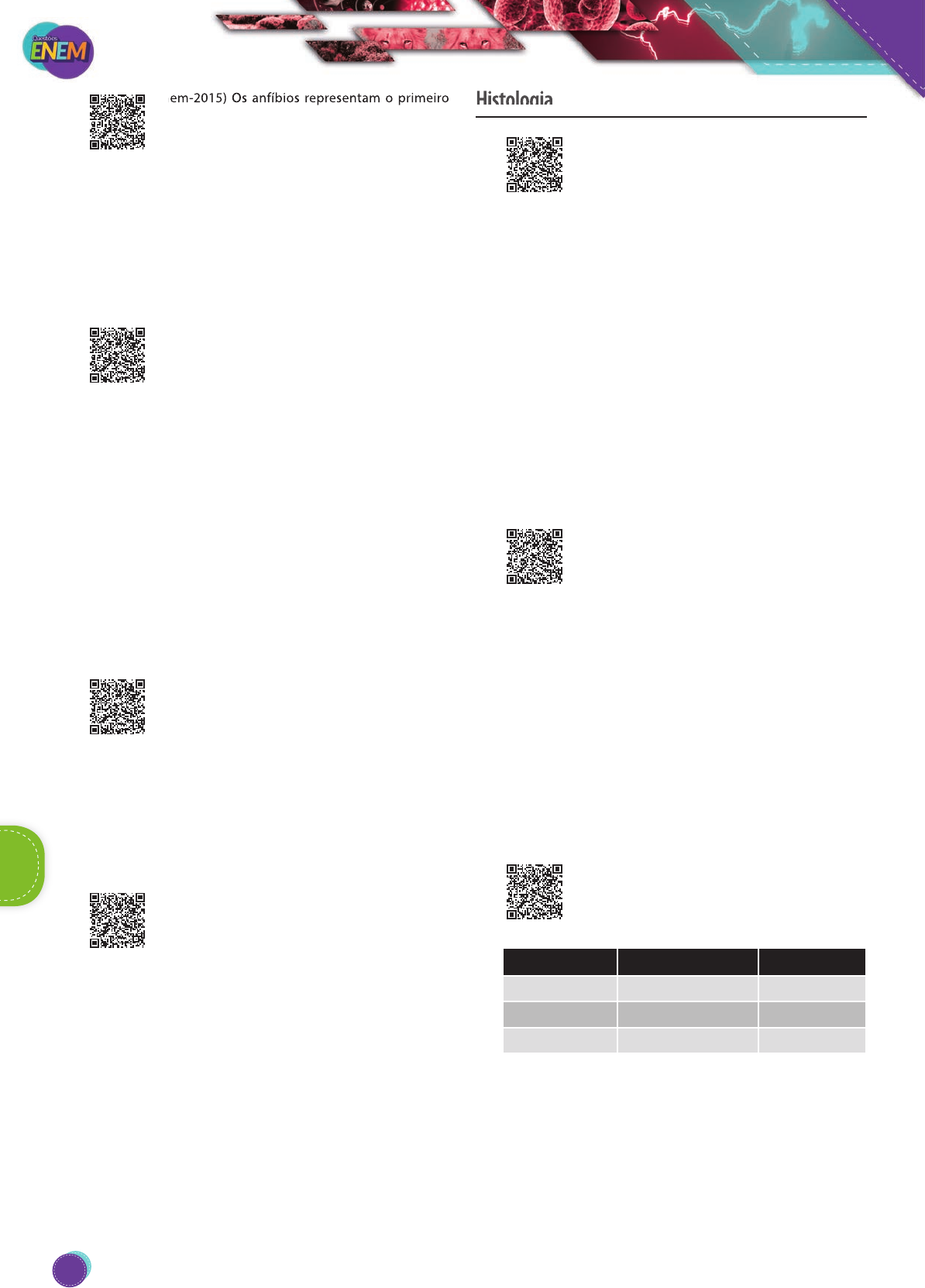 135. (Enem-2015) Os anfíbios representam o primeiro grupo de vertebrados que, evolutivamente, conquis- tou o ambiente terrestre. Apesar disso, a sobrevivên- cia do grupo ainda permanece restrita a ambientes úmidos ou aquáticos, devido à manutenção de algumas carac- terísticas fisiológicas relacionadas à água. Uma das características a que o texto se refere é a A) reprodução por viviparidade. B) respiração pulmonar nos adultos. C) regulação térmica por endotermia. D) cobertura corporal delgada e altamente permeável. E) locomoção por membros anteriores e posteriores desenvolvidos. 136. (Enem-2013) As serpentes que habitam regiões de seca podem ficar em jejum por um longo período de tempo devido à escassez de alimento. Assim, a so- brevivência desses predadores está relacionada ao aproveitamento máximo dos nutrientes obtidos com a presa capturada. De acordo com essa situação, essas serpentes apre- sentam alterações morfológicas e fisiológicas, como o aumento das vilosidades intestinais e a intensificação da irrigação san- guínea na porção interna dessas estruturas. A função do aumento das vilosidades intestinais para essas serpentes é maximizar o(a) A) comprimento do trato gastrointestinal para caber mais alimento. B) área de contato com o conteúdo intestinal para absorção dos nutrientes. C) liberação de calor via irrigação sanguínea para controle tér- mico do sistema digestório. D) secreção de enzimas digestivas para aumentar a degrada- ção proteica no estômago. E) processo de digestão para diminuir o tempo de permanên- cia do alimento no intestino. 137. (Enem-2013) Estudos de fluxo de energia em ecos- sistemas demonstram que a alta produtividade nos manguezais está diretamente relacionada às taxas de produção primária líquida e à rápida reciclagem dos nutrientes. Como exemplo de seres vivos encontrados nesse ambiente, temos: aves, caranguejos, insetos, peixes e algas. Dos grupos de seres vivos citados, os que contribuem direta- mente para a manutenção dessa produtividade no referido ecossistema são A) aves. B) algas. C) peixes. D) insetos. E) caranguejos. 138. (Enem-2012) Paleontólogos estudam fósseis e esque- letos de dinossauros para tentar explicar o desapa- recimento desses animais. Esses estudos permitem afirmar que esses animais foram extintos há cerca de 65 milhões de anos. Uma teoria aceita atualmente é a de que um asteroide colidiu com a Terra, formando uma densa nuvem de poeira na atmosfera. De acordo com essa teoria, a extinção ocorreu em função de modificações no planeta que A) desestabilizaram o relógio biológico dos animais, causan- do alterações no código genético. B) reduziram a penetração da luz solar até a superfície da Terra, interferindo no fluxo energético das teias tróficas. C) causaram uma série de intoxicações nos animais, provocan- do a bioacumulação de partículas de poeira nos organismos. D) resultaram na sedimentação das partículas de poeira le- vantada com o impacto do meteoro, provocando o desa- parecimento de rios e lagos. E) evitaram a precipitação de água até a superfície da Terra, causando uma grande seca que impediu a retroalimenta- ção do ciclo hidrológico. Histologia 139. (Enem-2015) A toxina botulínica (produzida pelo bacilo Clostridium botulinum) pode ser encontrada em alimentos malconservados, causando até a morte de consumidores. No entanto, essa toxina modificada em laboratório está sendo usada cada vez mais para melhorar a qualidade de vida das pessoas com problemas físicos e/ou estéticos, atenuando problemas como o blefaroespasmo, que provoca contrações involuntárias das pálpebras. (BACHUR, T. P. R. et al. Toxina botulínica: de veneno a tratamento. Revista Eletrônica Pesquisa Médica, n. 1, jan.-mar. 2009. Adaptado.) O alívio dos sintomas do blefaroespasmo é consequência da ação modificada sobre o tecido A) glandular, uma vez que ela impede a produção de secreção de substâncias na pele. B) muscular, uma vez que ela provoca a paralisia das fibras que formam esse tecido C) epitelial, uma vez que ela leva ao aumento da camada de queratina que protege a pele. D) conjuntivo, uma vez que ela aumenta a quantidade de substância intercelular no tecido. E) adiposo, uma vez que ela reduz a espessura da camada de células de gordura do tecido. 140. (Enem-2015) Hipoxia ou mal das alturas consiste na diminuição de oxigênio (O2) no sangue arterial do organismo. Por essa razão, muitos atletas apresentam mal-estar (dores de cabeça, tontura, falta de ar etc.) ao praticarem atividade física em altitudes elevadas. Nessas condições, ocorrerá uma diminuição na concentração de hemo- globina oxigenada (HbO2) em equilíbrio no sangue, conforme a relação: Hb(aq) + O2(aq) HbO2(aq) (Mal da montanha. Disponível em: . Acesso em: 11 fev. 2015. Adaptado.) A alteração da concentração de hemoglobina oxigenada no sangue ocorre por causa do(a) A) elevação da pressão arterial. B) aumento da temperatura corporal. C) redução da temperatura do ambiente. D) queda da pressão parcial de oxigênio. E) diminuição da quantidade de hemácias. 141. (Enem-2011) Um paciente deu entrada em um pron- to-socorro apresentando os seguintes sintomas: can- saço, dificuldade de respirar e sangramento nasal. O médico solicitou um hemograma ao paciente para definir um diagnóstico. Os resultados estão dispostos na tabela: Constituinte Número normal Paciente Glóbulos vermelhos 4,8 milhões/mm3 4 milhões/mm3 Glóbulos brancos (5 000 – 10 000)/mm3 9 000/mm3 Plaquetas (250 000 – 400 000)/mm3 200 000/mm3 (TORTORA, G. J. Corpo Humano: fundamentos de anatomia e fisiologia. Porto Alegre: Artmed, 2000. Adaptado.) Relacionando os sintomas apresentados pelo paciente com os resultados de seu hemograma, constata-se que A) o sangramento nasal é devido à baixa quantidade de pla- quetas, que são responsáveis pela coagulação sanguínea. B) o can