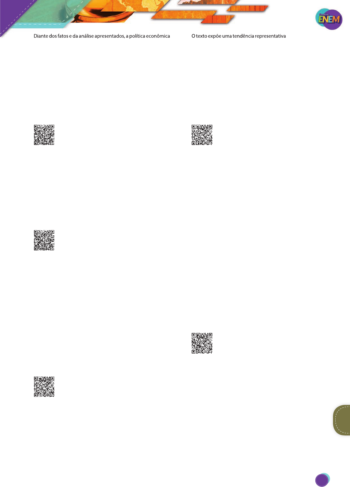 Diante dos fatos e da análise apresentados, a política econômica e a demanda popular correlacionada encontram-se, respecti- vamente, em A) controle da dívida interna e implementação das regras patronais. B) afrouxamento da economia de mercado e superação da lógica individualista. C) aplicação de plano desenvolvimentista e afirmação das conquistas neoliberais. D) defesa dos interesses corporativos do capital e manuten- ção de direitos sociais. E) mudança na estrutura do sistema produtivo e democrati- zação do acesso ao trabalho. 38. (Enem-2016) O mercado tende a gerir e regulamentar todas as atividades humanas. Até há pouco, certos campos – cultura, esporte, religião – ficavam fora do seu alcance. Agora, são absorvidos pela esfera do mercado. Os governos confiam cada vez mais nele (abandono dos setores de Estado, privatizações). (RAMONET, 1. Guerras do século XXI: novos temores e novas ameaças. Petrópolis: Vozes, 2003.) No texto é apresentada uma lógica que constitui uma caracte- rística central do seguinte sistema socioeconômico: A) Socialismo. B) Feudalismo. C) Capitalismo. D) Anarquismo. E) Comunitarismo. 39. (Enem-2015) Mediante o Código de Posturas de 1932, o poder público enumera e prevê, para os habitantes de Fortaleza, uma série de proibições condicionadas pela hora: após as 22 horas era vetada a emissão de sons em volume acentuado. O uso de buzinas, sirenes, vitrolas, motores ou qualquer objeto que produzisse barulho seria pu- nido com multa. No início dos anos 1940 o último bonde partia da Praça do Ferreira às 23 horas. (SILVA FILHO, A. L. M. Fortaleza: imagens da cidade. Fortaleza: Museu do Ceará; Secult, 2001. Adaptado.) Como Fortaleza, muitas capitais brasileiras experimentaram, na primeira metade do século XX, um novo tipo de vida urbana, marcado por condutas que evidenciam uma A) experiência temporal regida pelo tempo orgânico e pessoal. B) experiência que flexibilizava a obediência ao tempo do relógio. C) relação de códigos que estimulavam o trânsito de pessoas na cidade. D) normatização do tempo com vistas à disciplina dos corpos na cidade. E) cultura urbana capaz de conviver com diferentes experiências. 40. (Enem-2015) Diante de ameaças surgidas com a en- genharia genética de alimentos, vários grupos da sociedade civil conceberam o chamado “princípio da precaução”. O fundamento desse princípio é: quando uma tecnologia ou produto comporta alguma ameaça à saúde ou ao ambiente, ainda que não se possa avaliar a natureza precisa ou a magnitude do dano que venha a ser causado por eles, deve-se evitá-los ou deixá-los de quarentena para maiores estudos e avaliações antes de sua liberação. (SEVCENKO, N. A corrida para o século XXI: no loop da montanha-russa. São Paulo: Cia. das Letras, 2001. Adaptado.) O texto expõe uma tendência representativa do pensamento so- cial contemporâneo, na qual o desenvolvimento de mecanismos de acautelamento ou administração de riscos tem como objetivo A) priorizar os interesses econômicos em relação aos seres humanos e à natureza. B) negar a perspectiva científica e suas conquistas por causa de riscos ecológicos. C) instituir o diálogo público sobre mudanças tecnológicas e suas consequências. D) combater a introdução de tecnologias para travar o curso das mudanças sociais. E) romper o equilíbrio entre benefícios e riscos do avanço tec- nológico científico. 41. (Enem-2015) Texto I Em todo o país a lei de 13 de maio de 1888 libertou poucos negros em relação à população de cor. A maioria á havia conquistado a alforria antes de 1888, por meio de estratégias possíveis. No entanto, a importância histórica da lei de 1888 não pode ser mensurada apenas em termos nu- méricos. O impacto que a extinção da escravidão causou numa sociedade constituída a partir da legitimidade da propriedade sobre a pessoa não cabe em cifras. (ALBUQUERQUE, W. O jogo da dissimulação: Abolição e cidadania negra no Brasil. São Paulo: Cia. das Letras, 2009. Adaptado.) Texto II Nos anos imediatamente anteriores à Abolição, a população livre do Rio de Janeiro se tornou mais numerosa e diversificada. Os escravos, bem menos numerosos que antes, e com os afri- canos mais aculturados, certamente não se distinguiam muito facilmente dos libertos e dos pretos e pardos livres habitantes da cidade. Também já não é razoável presumir que uma pessoa de cor seja provavelmente cativa, pois os negros libertos e livres poderiam ser encontrados em toda parte. (CHALHOUB, S. Visões da liberdade: uma história das últimas décadas da escravidão na Corte. São Paulo: Cia. das Letras, 1990. Adaptado.) Sobre o fim da escravidão no Brasil, o elemento destacado no Texto I que complementa os argumentos apresentados no Texto II é o(a) A) variedade das estratégias de resistência dos cativos. B) controle jurídico exercido pelos proprietários. C) inovação social representada pela lei. D) ineficácia prática da libertação. E) significado político da Abolição. 42. (Enem-2015) Em sociedade de origens tão nitidamen- te personalistas como a nossa, é compreensível que os simples vínculos de pessoa a pessoa, independen- tes e até exclusivos de qualquer tendência para a cooperação autêntica entre os indivíduos, tenham sido quase sempre os mais decisivos. As agregações e relações pessoais, embora por vezes precárias, e, de outro lado, as lutas entre facções, entre famílias, entre regionalismos, faziam dela um todo incoerente e amorfo. O peculiar da vida brasileira parece ter sido, por essa época, uma acentuação singularmente enérgica do afetivo, do irracional, do passional e uma estagnação ou antes uma atrofia correspondente das qualidades ordenadoras, disci- plinadoras, racionalizadoras. (HOLANDA, S. B. Raízes do Brasil. São Paulo: Cia. das Letras, 1995.) Um traço formador da vida pública brasileira expressa-se, se- gundo a análise do hi