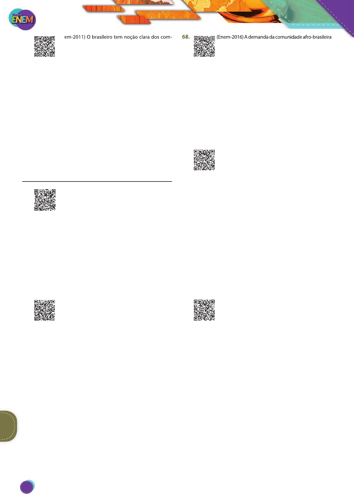 65. (Enem-2011) O brasileiro tem noção clara dos com- portamentos éticos e morais adequados, mas vive sob o espectro da corrupção, revela pesquisa. Se o país fosse resultado dos padrões morais que as pes- soas dizem aprovar, pareceria mais com a Escandinávia do que com Bruzundanga (corrompida nação fictícia de Lima Barreto). (FRAGA, P. Ninguém é inocente. Folha de S. Paulo, 4 out. 2009. Adaptado.) O distanciamento entre “reconhecer” e “cumprir” efetivamente o que é moral constitui uma ambiguidade inerente ao humano, porque as normas morais são A) decorrentes da vontade divina e, por esse motivo, utópicas. B) parâmetros idealizados, cujo cumprimento é destituído de obrigação. C) amplas e vão além da capacidade de o indivíduo conseguir cumpri-las integralmente. D) criadas pelo homem, que concede a si mesmo a lei à qual deve se submeter. E) cumpridas por aqueles que se dedicam inteiramente a ob- servar as normas jurídicas. Movimentos sociais 66. (Enem-2017) No Brasil, assim como em vários outros países, os modernos movimentos LGBT representam um desafio às formas de condenação e perseguição social contra desejos e comportamentos sexuais anticonvencionais associados à vergonha, moralidade, pecado, degeneração, doença. Falar do movimento LGBT implica, por- tanto, chamar a atenção para a sexualidade como fonte de es- tigmas, intolerância, opressão. (SIMÕES, J. Homossexualidade e movimento LGBT: estigma, diversidade e cidadania. In: BOTELHO, A.; SCHWARCZ, L. M. Cidadania, um projeto em construção. São Paulo: Claro Enigma, 2012. Adaptado.) O movimento social abordado justifica-se pela defesa do direito de A) organização sindical. B) participação partidária. C) manifestação religiosa. D) formação profissional. E) afirmação identitária. 67. (Enem-2016) A democracia deliberativa afirma que as partes do conflito político devem deliberar entre si e, por meio de argumentação razoável, tentar chegar a um acordo sobre as políticas que seja satisfatório para todos. A democracia ativista desconfia das exortações à deliberação por acreditar que, no mundo real da política, onde as desigualdades estruturais influenciam procedimentos e resultados, processos democráticos que parecem cumprir as normas de deliberação geralmente tendem a beneficiar os agentes mais poderosos. Ela recomenda, portanto, que aqueles que se preocupam com a pro- moção de mais justiça devem realizar principalmente a atividade de oposição crítica, em vez de tentar chegar a um acordo com quem sustenta estruturas de poder existentes ou delas se beneficia. (YOUNG, I. M. Desafios ativistas à democracia deliberativa. Revista Brasileira de Ciência Política, n. 13, jan.-abr. 2014.) As concepções de democracia deliberativa e de democracia ativista apresentadas no texto tratam como imprescindíveis, respectivamente, A) a decisão da maioria e a uniformização de direitos. B) a organização de eleições e o movimento anarquista. C) a obtenção do consenso e a mobilização das minorias. D) a fragmentação da participação e a desobediência civil. E) a imposição de resistência e o monitoramento da liberdade. 68. (Enem-2016) A demanda da comunidade afro-brasileira por reconhecimento, valorização e afirmação de direitos, no que diz respeito à educação, passou a ser particular- mente apoiada com a promulgação da Lei 10.639/2003, que alterou a Lei 9.394/1996, estabelecendo a obrigatoriedade do ensino de história e cultura afro-brasileiras e africanas. (Diretrizes Curriculares Nacionais para a Educação das Relações Etnicorraciais e para o Ensino de História e Cultura Afro- brasileira e Africana. Brasília: Ministério da Educação, 2005.) A alteração legal no Brasil contemporâneo descrita no texto é resultado no processo de A) aumento da renda nacional. B) mobilização do movimento negro. C) melhoria da infraestrutura escolar. D) ampliação das disciplinas obrigatórias. E) politização das universidades públicas. 69. (Enem-2016) O Movimento Negro Unificado (MNU) distingue-se do Teatro Experimental do Negro (TEN) por sua crítica ao discurso nacional hegemônico. Isto é, enquanto o TEN defende a plena integração sim- bólica dos negros na identidade nacional “híbrida”, o MNU condena qualquer tipo de assimilação, fazendo do combate à ideologia da democracia racial uma das suas principais bandeiras de luta, visto que, aos olhos desse movimento, a igualdade formal assegurada pela lei entre negros e brancos e a difusão do mito de que a sociedade brasileira não é racista teriam servido para sustentar, ideologicamente, a opressão racial. (COSTA, S. Dois Atlânticos: teoria social, antirracismo, cosmopolitismo. Belo Horizonte: UFMG, 2006. Adaptado.) No texto, são comparadas duas organizações do movimento negro brasileiro, criadas em diferentes contextos históricos: o TEN, em 1944, e o MNU, em 1978. Ao assumir uma postura divergente da do TEN, o MNU pretendia A) pressionar o governo brasileiro a decretar a igualdade racial. B) denunciar a permanência do racismo nas relações sociais. C) contestar a necessidade da igualdade entre negros e brancos. D) defender a assimilação do negro por meios não democráticos. E) divulgar a ideia da miscigenação como marca da nacionalidade. 70. (Enem-2015) A razão principal que leva o capitalismo como sistema a ser tão terrivelmente destrutivo da biosfera é que, na maioria dos casos, os produtores que lucram com a destruição não a registram como um custo de produção, mas sim, precisamente ao contrário, como uma redução no custo. Por exemplo, se um produtor joga lixo em um rio, poluindo suas águas, esse produtor considera que está economizando o custo de outros métodos mais segu- ros, porém mais caros de dispor do lixo. (WALLERSTEIN, I. Utopística ou as decisões históricas do século vinte e um. Petrópolis: Vozes, 2003.) A pressão dos movimentos socioambientais, 