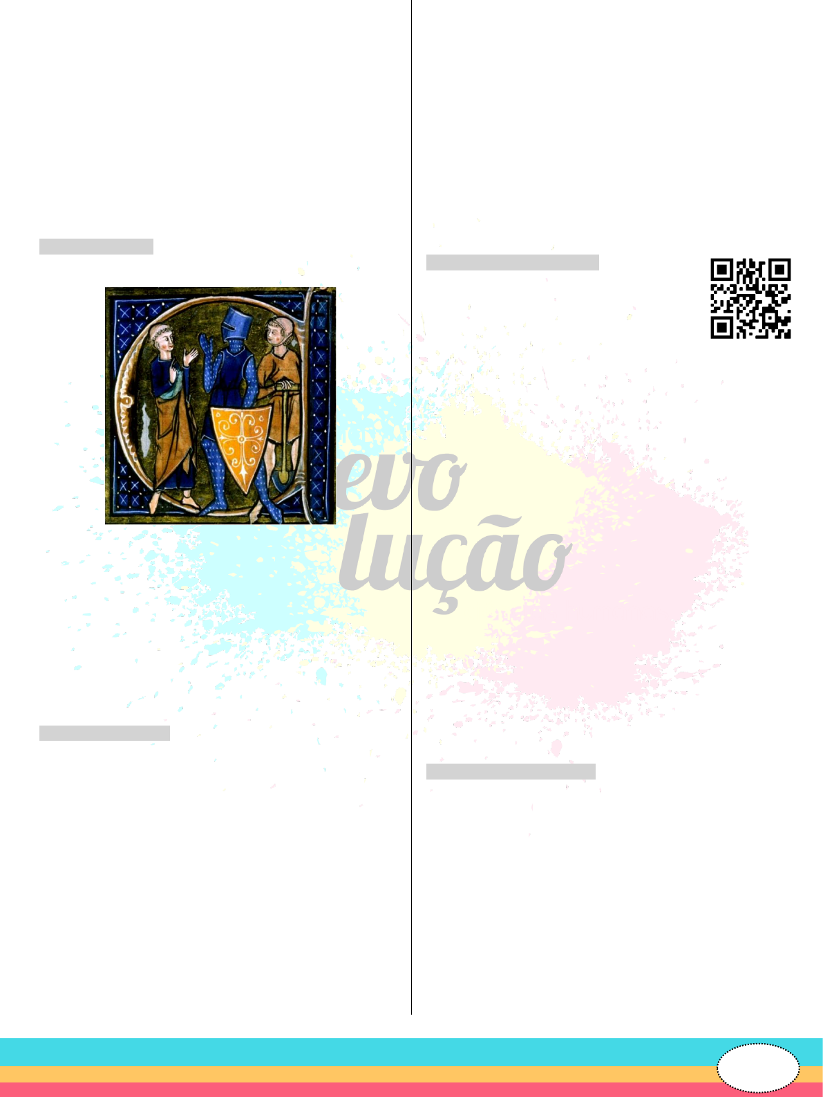 31 a) devido a sua relação com a religião católica e a unifica- ção entre germânicos e cristãos que passaram a conviver pacificamente no território em que hoje é a Europa. b) devido a sua liderança política na formação do Império, o que permitiu conter as invasões dos povos não latinos, também chamados de bárbaros, que permaneciam pagãos. c) devido a seu elo com as origens e os costumes germâni- cos, que deram origem à Europa e consolidaram o território europeu. d) porque Carlos Magno foi um rei que conciliou as deman- das de seus súditos e doou o patrimônio de São Pedro. e) devido a sua relação com a religião cristã, à medida que sua conversão e a subsequente expansão do Império pos- sibilitaram a unificação dos cristãos. 100. (UFPR/2020) Sobre a iluminura abaixo, é INCOR- RETO afirmar: Iluminura do século XIII (Disponível em: https://education. fran- cetv.fr). Acesso em: 10 de maio de 2019. a) Revela a supremacia da união entre guerreiros e traba- lhadores sobre os membros do clero. b) Representa a sociedade trifuncional tal qual foi conce- bida pelo bispo Adalberão de Laon, no século XI. c) Expressa uma concepção de sociedade no medievo. d) Representa uma configuração social baseada na coope- ração e no serviço para a harmonia social no medievo. e) Não expressa a sociedade medieval em sua configura- ção social variada. 101. (PUC SP/2020) Quando, no final do século XVIII, isto é, no início do romantismo, as formas da cultura medieval começaram a ser percebidas como valores le- gítimos, a primeira coisa que se descobriu foi a cavala- ria. O primeiro romantismo tendia a identificar Idade Média e cavalaria, com olhos apenas para as plumas tremulantes sobre os capacetes. E, por paradoxal que possa parecer, tinha certa razão. Estudos mais profun- dos nos ensinaram que a cavalaria é apenas uma fração da cultura daquela época e que o desenvolvimento po- lítico e social se deu majoritariamente fora dessa forma cultural. (Huizinga, Johan – O Outono da Idade Média – estudo sobre as for- mas de vida e de pensamento dos séculos XIV e XV na França e nos Países Baixos -São Paulo: COSAC NAIFY, 2010 - p. 85) A obra ao lado citada é considerada uma das melhores contribuições historiográficas referente ao tema Idade Média. Seu autor, o holandês Johan Huizinga, só a con- siderou completa em sua quinta edição, em 1940, após várias revisões. Nesta obra, Huizinga faz uma profunda análise do final da Idade Média e, como ilustra bem o trecho selecionado, a) compara o movimento romântico à valorização da ordem burguesa, que surgia durante o chamado Outono da Idade Média. b) aponta a Idade Média como uma época exclusivamente nobiliárquica, sem outros componentes culturais relevantes. c) entende a Idade Média como uma natural continuidade da Antiguidade, com predomínio da razão sobre o espiritu- alismo. d) Mostra como a visão romântica foi sendo substituída por uma percepção mais abrangente da sociedade medieval. 102. (PUCCamp SP/2020) Considere as afirmações a seguir sobre a sociedade medieval. I. A sociedade medieval era hierarqui- zada, com pouca mobilidade social e grande concentração de poder político e econômico nas mãos dos grandes proprietários de terras. II. A força de trabalho era exercida pelos servos da gleba, camponeses que tinham condição de semi-es- cravidão e eram propriedades do senhor feudal, sem di- reito a terra para plantar e sem os deveres dos cidadãos livres, como o pagamento de tributos e a posse de ca- valo, armadura e espada. III. Os camponeses dos feudos e os artesãos que habi- tavam as vilas, estes também chamados de vilões, vi- viam em condições miseráveis e submetidos a seus se- nhores, que eram encarregados de lhes assegurar pro- teção, alimentação, vestimenta e moradia. IV. A formação letrada era privilégio dos nobres e bas- tante influenciada pela Igreja, uma vez que boa parte da disponibilização e circulação de livros, quase sempre em latim, se dava a partir do trabalho de tutores oriun- dos do clero e monges copistas. Está correto o que consta APENAS em a) I, II e III. b) II e IV. c) I e IV. d) II e III. e) III e IV. 103. (Mackenzie SP/2020) “Na Antiguidade e na Idade Média, apesar do nível técnico inferior, o tempo de pro- dução diária, semanal ou anual era bem menor que no capitalismo. Como a religião tinha primazia sobre a eco- nomia, o tempo das festas e dos rituais religiosos era mais importante do que o tempo da produção, que fo- ram em boa parte abolidos na esteira da moderniza- ção.” (KURZ, R., in Folha de São Paulo, 3 jan. 1999, p. 5) Com base no texto acima, considere as assertivas abaixo. I. O trabalho na sociedade feudal era estruturado na ser- vidão, que mantinha os indivíduos presos à terra, tendo que pagar uma série de obrigações em taxas e serviços. Apesar disso, o servo era preso à terra e não podia ser