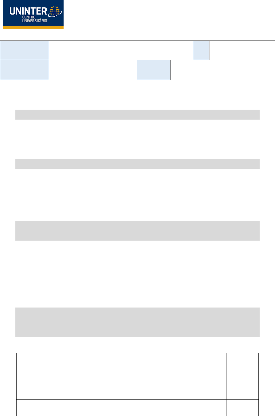 RELATÓRIO DE CURSOS, OFICINAS E EVENTOS Nome completo Gladir Linemann RU 4365126 Curso superior Processos Gerenciais Cidade/UF Lajeado/RS QUESTÕES INICIAIS A(s) atividade(s) realizada(s) cumprem a carga horária mínima de 60 horas? ☒ Sim ☐ Não O(s) certificado(s) postado(s) contém as informações solicitadas no documento de orientação? ☒ Sim ☐ Não ☐ Em parte A(s) atividade(s) foi(ram) realizada(s) durante o período de matrícula no curso superior em que estou matriculado(a)? ☒ Sim ☐ Não ☐ Em parte ATIVIDADES Liste a seguir o título e carga horária de cada atividade realizada cujo certificado será postado. Caso seja necessário mais linhas, basta posicionar o cursor na lateral externa à planilha e clicar em “enter”. Título da atividade certificada Carga horária 1. CURSO DE EXTENSÃO | DIVERSIDADE SEXUAL E A ÉTICA PROFISSIONAL DO SERVIÇO SOCIAL - RESOLUÇÃO CFESS N 489 2006 30 2. CURSO DE EXTENSÃO | METODOLOGIA DE INTERVENÇÃO 30 RELATÓRIO DE CURSOS, OFICINAS E EVENTOS JUNTO A FAMÍLIAS EM SITUAÇÃO DE VULNERABILIDADE E RISCO SOCIAL 3. 4. 5. 6. 7. Total 60 RELAÇÃO COM ÁREA DE FORMAÇÃO Indique a seguir de que maneira a(s) atividade(s) realizada(s) pode contribuir para sua formação, considerando a área profissional do curso superior que você está realizando. Caso haja mais de uma atividade, indique o título da atividade na descrição. Máximo de 1.000 caracteres com espaço. Os cursos de extensão "Diversidade Sexual e a Ética Profissional do Serviço Social – Resolução CFESS Nº 489/2006" e "Metodologia de Intervenção junto a Famílias em Situação de Vulnerabilidade e Risco Social" foram fundamentais para minha formação acadêmica em Processos Gerenciais. Eles me proporcionaram uma visão mais ampla sobre inclusão e intervenções estratégicas em contextos de vulnerabilidade, reforçando a importância de práticas éticas e responsáveis na gestão de processos organizacionais e na promoção de um ambiente mais inclusivo. AVALIAÇÃO FECHADA Indique sua avaliação a respeito das atividades realizadas. Marque apenas uma opção. ☒ Ajudou muito para minha formação ☐ Ajudou em parte para minha formação ☐ Indiferente quanto à minha formação ☐ Não ajudou minha formação ☐ Atrapalhou minha formação RELATÓRIO DE CURSOS, OFICINAS E EVENTOS De 1 a 10, qual seria a nota que você daria para a(s) atividade(s) realizada(s), considerando a contribuição para sua formação profissional? ☐ 0 ☐ 1 ☐ 2 ☐ 3 ☐ 4 ☐ 5 ☐ 6 ☐ 7 ☐ 8 ☐ 9 ☒ 10 AVALIAÇÃO ABERTA Descreva com suas palavras quais foram os pontos fortes e fracos das atividades que realizou, no que diz respeito à contribuição para sua formação (custos, qualidade dos palestrantes, qualidade do material de apoio, formato, participações, etc.). Caso tenha participado de mais de uma atividade, não esqueça de avaliar cada uma separadamente, indicando o título. Máximo de 1.000 caracteres com espaço. Inicialmente, senti certo desafio ao me adaptar ao formato dos cursos de extensão, mas, com o tempo, a metodologia de ensino se mostrou acessível e bem organizada. O curso "Diversidade Sexual e a Ética Profissional do Serviço Social – Resolução CFESS Nº 489/2006" destacou-se pela qualidade da vídeo aula e do material de apoio, abordando o tema de forma clara e ética. Já no curso "Metodologia de Intervenção junto a Famílias em Situação de Vulnerabilidade e Risco Social", o ponto forte foi a profundidade dos conteúdos, que contribuíram significativamente para minha compreensão de estratégias de apoio em situações críticas. Em ambos os cursos, os recursos disponibilizados, como vídeos e textos, foram úteis, embora o formato on-line tenha exigido maior disciplina e organização. Apesar disso, a flexibilidade foi um diferencial positivo. As atividades contribuíram para ampliar meu conhecimento e visão, fortalecendo minha formação em Processos Gerenciais. RELATÓRIO DE CURSOS, OFICINAS E EVENTOS