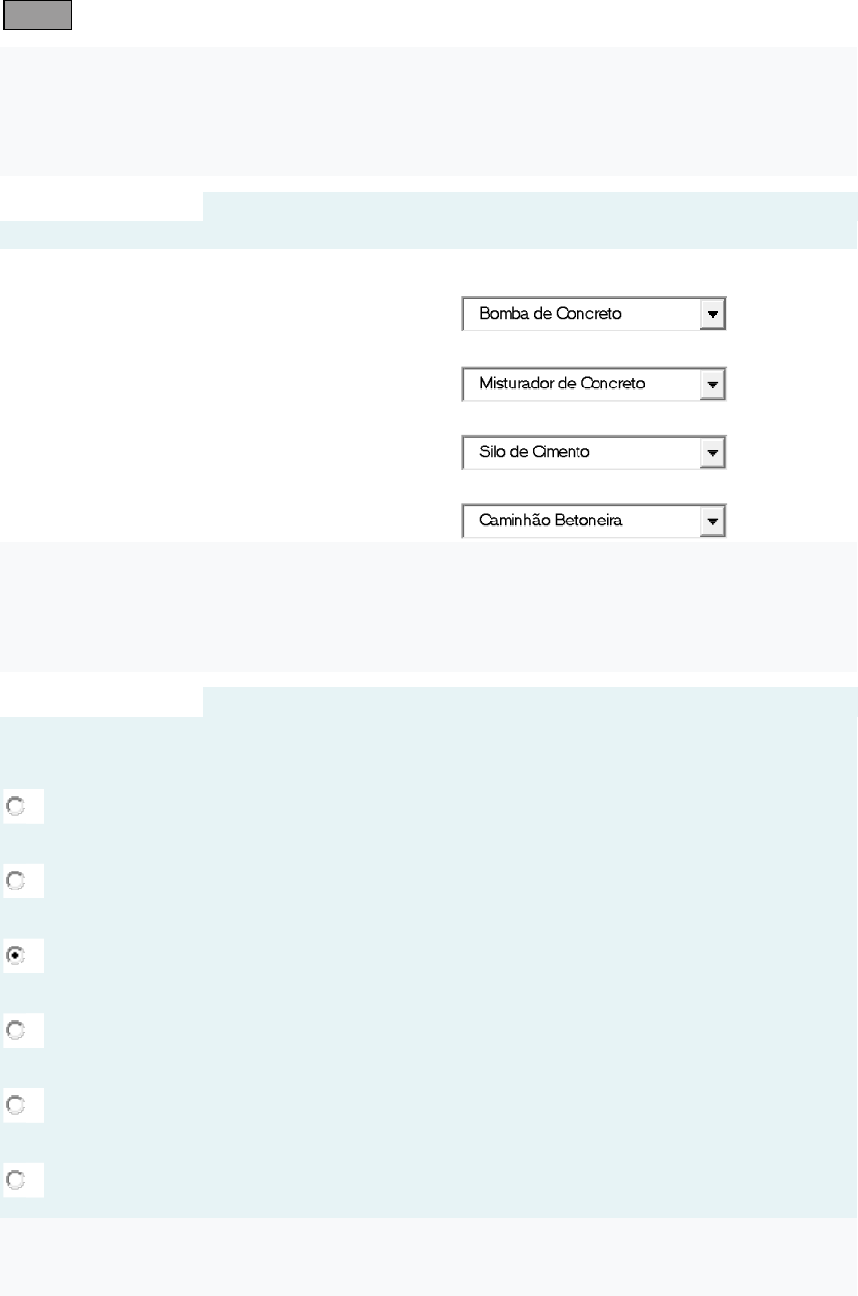 .6 Teste seus conhecimentos Voltar Questão 1 Ainda não respondida Vale 1,00 ponto(s). Marcar questão Texto da questão Relacione os equipamentos à sua função: Distribui concreto em locais de construção de difícil acesso. Resposta 1 Questão 1 Mantém o concreto em constante agitação durante o transporte. Resposta 2 Questão 1 Armazena cimento em forma de pó a granel. Resposta 3 Questão 1 Combina materiais para produzir uma mistura de concreto homogênea. Resposta 4 Questão 1 Questão 2 Ainda não respondida Vale 1,00 ponto(s). Marcar questão Texto da questão O que é o traço em concreto? Questão 2Escolha uma opção: O processo de secagem do concreto. A resistência do concreto. Uma sequência numérica representando os componentes do concreto. Uma mistura de concreto com aditivos. O número de sacos de cimento em uma mistura. Limpar minha escolha Questão 3 Ainda não respondida Vale 1,00 ponto(s). https://aprendamais.mec.gov.br/mod/quiz/view.php?id=93420 https://aprendamais.mec.gov.br/mod/quiz/attempt.php?attempt=8501761&cmid=93420 Marcar questão Texto da questão Preencha corretamente a lacuna: Os silos de Resposta Questão 3 são uma parte fundamental de uma planta de concreto usinado, pois fornecem armazenamento seguro e conveniente para o cimento antes de ser dosado e misturado com outros materiais para produzir o concreto. Questão 4 Ainda não respondida Vale 1,00 ponto(s). Marcar questão Texto da questão Complete o seguinte parágrafo com as palavras corretas: O consumo de (C) é definido como a quantidade de cimento necessária para se produzir um volume de 1 m3 (um metro cúbico) de Em branco 2 Questão 4 . Esta informação é fundamental para o cálculo das Em branco 3 Questão 4 de materiais que precisamos utilizar. Questão 5 Ainda não respondida Vale 1,00 ponto(s). Marcar questão Texto da questão Relacione as etapas do processo de dosagem de concreto com suas descrições. Determinar as proporções exatas de cada material a ser usado na mistura. Resposta 1 Questão 5 Especificar a resistência e outros requisitos do concreto. Resposta 2 Questão 5 Escolher o tipo de cimento, areia, brita e aditivos. Resposta 3 Questão 5 Calcular a quantidade de água necessária em relação ao cimento. Resposta 4 Questão 5 Questão 6 Ainda não respondida Vale 1,00 ponto(s). Marcar questão Texto da questão Em que tipo de planta de concreto usinado o cimento é geralmente dosado e adicionado aos agregados em sacos de 50 kg? Questão 6Escolha uma opção: Planta de Lote de Tambor Móvel Planta de Dosagem Seca Planta de Lote de Tambor Fixo Planta de Dosagem de Transbordo Planta de Concreto de Alta Tecnologia Limpar minha escolha Questão 7 Ainda não respondida Vale 1,00 ponto(s). Marcar questão Texto da questão Complete a seguinte frase: Os de concreto podem ter diferentes configurações, incluindo misturadores de Em branco 2 Questão 7 horizontal e misturadores de eixo Em branco 3 Questão 7 , cada um com suas vantagens e aplicações específicas. Questão 8 Ainda não respondida Vale 1,00 ponto(s). Marcar questão Texto da questão Qual é a principal vantagem de um misturador de eixo vertical (planetário) em comparação com um misturador de eixo horizontal? Questão 8Escolha uma opção: Menor custo de manutenção https://aprendamais.mec.gov.br/mod/quiz/attempt.php?attempt=8501761&cmid=93420 Melhor mobilidade Maior economia de energia Mistura mais homogênea Maior capacidade de produção Limpar minha escolha Questão 9 Ainda não respondida Vale 1,00 ponto(s). Marcar questão Texto da questão Relacione o tipo de planta de concreto usinado à sua descrição: Dosagem dos agregados ocorre previamente, mas o cimento é adicionado no caminhão betoneira. Resposta 1 Questão 9 Possui sistemas avançados de controle e monitoramento da produção. Resposta 2 Questão 9 Utilizada para projetos temporários ou em locais remotos. Resposta 3 Questão 9 Especializada na produção de concreto pré-misturado para preparo na obra. Resposta 4 Questão 9 Questão 10 Ainda não respondida Vale 1,00 ponto(s). Marcar questão Texto da questão Complete o seguinte parágrafo com as palavras corretas: O cálculo de um de concreto, também conhecido como Em branco 2 Questão 10 , é uma etapa crítica no processo de preparação do concreto, pois determina a Em branco 3 Questão 10 dos materiais (cimento, areia, brita, água, aditivos, etc.) que serão misturados para atingir as Em branco 4 Questão 10 https://aprendamais.mec.gov.br/mod/quiz/attempt.php?attempt=8501761&cmid=93420 desejadas do concreto, como resistência, durabilidade, Em branco 5 Questão 10 , entre outras. O profissional responsável por esse cálculo é geralmente um engenheiro civil ou um técnico especializado em concreto, com conhecimentos sólidos sobre as Em branco 6 Questão 10 dos materiais e o comportamento do concreto.
