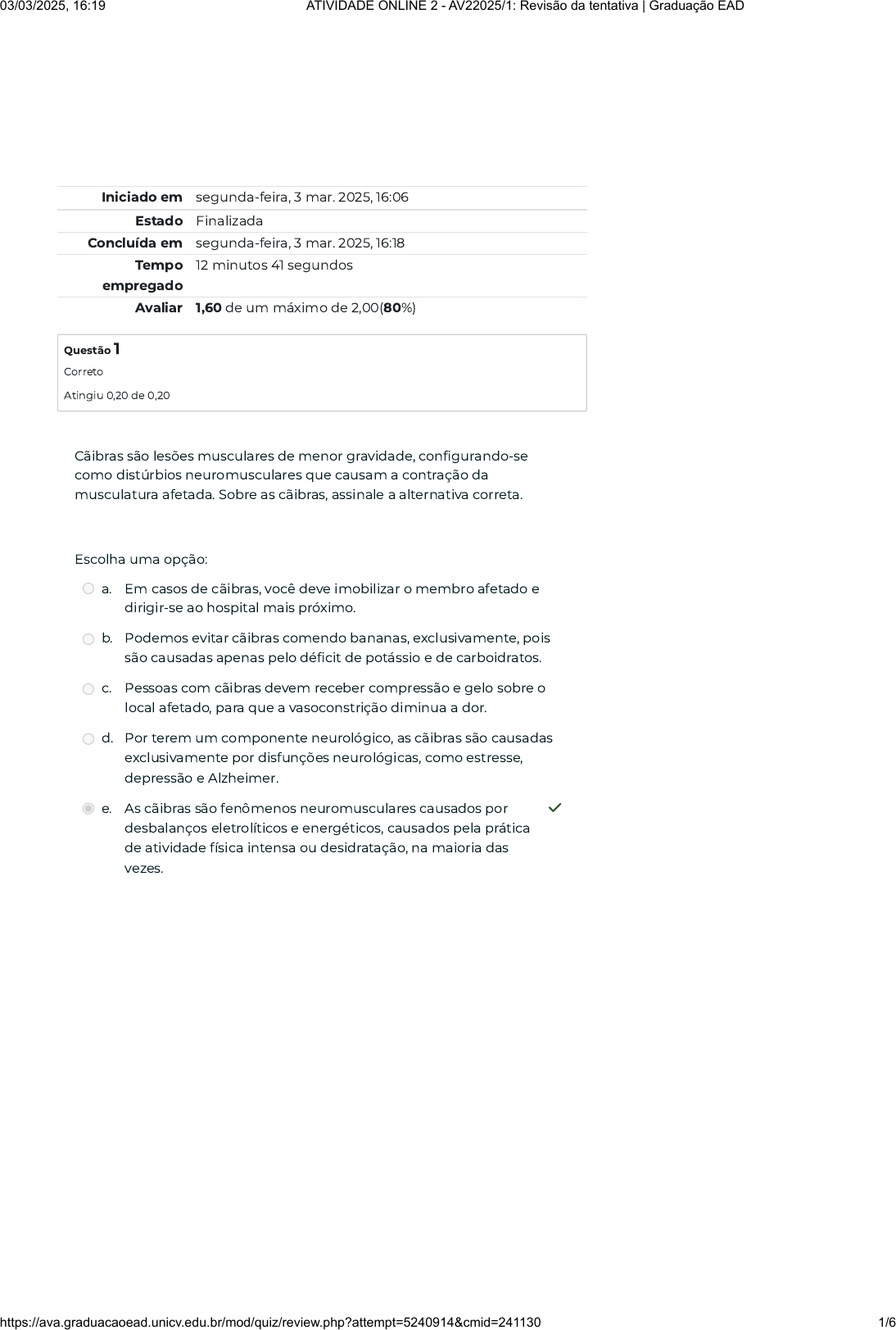 Iniciado em segunda-feira, 3 mar. 2025, 16:06 Estado Finalizada Concluída em segunda-feira, 3 mar. 2025, 16:18 Tempo empregado 12 minutos 41 segundos Avaliar 1,60 de um máximo de 2,00(80%) Questão 1 Correto Atingiu 0,20 de 0,20 Cãibras são lesões musculares de menor gravidade, configurando-se como distúrbios neuromusculares que causam a contração da musculatura afetada. Sobre as cãibras, assinale a alternativa correta. Escolha uma opção: a. Em casos de cãibras, você deve imobilizar o membro afetado e dirigir-se ao hospital mais próximo. b. Podemos evitar cãibras comendo bananas, exclusivamente, pois são causadas apenas pelo déficit de potássio e de carboidratos. c. Pessoas com cãibras devem receber compressão e gelo sobre o local afetado, para que a vasoconstrição diminua a dor. d. Por terem um componente neurológico, as cãibras são causadas exclusivamente por disfunções neurológicas, como estresse, depressão e Alzheimer. e. As cãibras são fenômenos neuromusculares causados por desbalanços eletrolíticos e energéticos, causados pela prática de atividade física intensa ou desidratação, na maioria das vezes. ✓ 03/03/2025, 16:19 ATIVIDADE ONLINE 2 - AV22025/1: Revisão da tentativa | Graduação EAD https://ava.graduacaoead.unicv.edu.br/mod/quiz/review.php?attempt=5240914&cmid=241130 1/6 Questão 2 Correto Atingiu 0,20 de 0,20 Questão 3 Correto Atingiu 0,20 de 0,20 Sabemos que os atos inseguros e as condições inseguras são fatores que, combinados ou não, desencadeiam os acidentes do trabalho. São, portanto, as causas diretas dos acidentes. Assim, podemos entender que prevenir acidentes de trabalho, em síntese, significa corrigir condições inseguras existentes nos locais de trabalho, não permitir que outras sejam criadas e evitar a prática de atos inseguros por parte das pessoas. Diante disso, analise as alternativas e assinale aquela que se refere a uma condição insegura. Escolha uma opção: a. A manicure improvisou o uso de uma tesoura de cutícula que estava quebrada e acabou ferindo a cliente. b. A responsável pela operação da autoclave para esterilizar os materiais estava em seu horário de intervalo, momento em que a faxineira do estabelecimento, que não tinha treinamento, resolveu abri-la, vindo a queimar-se. c. Uma esteticista trabalha operando equipamentos com sono e distraída pelo fato de não ter dormido bem na noite anterior. d. Uma esteticista de idade avançada teve uma parada cardíaca em função de um choque elétrico em um equipamento que estava com os cabos expostos. ✓ e. Um trabalhador estava correndo atrás de um colega de trabalho, como um ato de brincadeira, caiu quebrando o braço e fazendo um corte na cabeça. O mapa de risco pontua quais agentes de risco estão presentes em cada setor. Além disso, para cada setor e agente de risco, é preciso sinalizar, em uma escala gradativa, se é maior ou menor em relação ao outro. Por exemplo, no setor de esterilização de materiais, o risco físico é maior que o biológico. Uma forma de fazer essa sinalização é por meio de uma escala de cores. Assinale a alternativa que relaciona corretamente o tipo de risco com a cor que deve representá-lo em um mapa de riscos. Escolha uma opção: a. Risco mecânico: amarelo. b. Risco físico: vermelho. c. Risco ergonômico: verde. d. Risco químico: azul. e. Risco biológico: marrom. ✓ 03/03/2025, 16:19 ATIVIDADE ONLINE 2 - AV22025/1: Revisão da tentativa | Graduação EAD https://ava.graduacaoead.unicv.edu.br/mod/quiz/review.php?attempt=5240914&cmid=241130 2/6 Questão 4 Correto Atingiu 0,20 de 0,20 Questão 5 Correto Atingiu 0,20 de 0,20 Os acidentes de trabalho podem ser classificados de acordo com seu tipo e suas consequências. Um acidente pode ocorrer com o empregado no percurso da residência para o local de trabalho ou do trabalho para a residência. Este tipo acidente é chamado de: Assinale a alternativa correta. Escolha uma opção: a. doença ocupacional. b. acidente ambiental. c. acidente impessoal. d. acidente de trajeto. ✓ e. acidente típico. Os acidentes de trabalho com agulhas e material perfurocortante, em geral, são considerados extremamente perigosos por serem potencialmente capazes de transmitir doenças agudas ou crônicas e causar até mesmo a morte de profissionais da área da saúde. As principais doenças são o vírus da imunodeficiência humana (HIV), as hepatites B e C e o tétano. Dessa forma, todos os estabelecimentos de saúde devem ter disponíveis para uso os EPI’s e os equipamentos de proteção coletivos (EPCs), recomendados para cada atividade específica. Além disso, os funcionários devem ser capacitados para seu uso correto e a realização adequada dos procedimentos técnicos necessários para desempenhar suas atividades de forma segura a fim de diminuir os riscos ocupacionais provenientes do ambiente de trabalho. Com qual risco ocupacional esse tipo de acidente está envolvido? Assinale a alternativa correta. Escolha uma opção: a. Risco biológico. ✓ b. Risco mecânico. c. Risco físico. d. Risco químico. e. Risco ergonômico. 03/03/2025, 16:19 ATIVIDADE ONLINE 2 - AV22025/1: Revisão da tentativa | Graduação EAD https://ava.graduacaoead.unicv.edu.br/mod/quiz/review.php?attempt=5240914&cmid=241130 3/6 Questão 6 Correto Atingiu 0,20 de 0,20 Questão 7 Correto Atingiu 0,20 de 0,20 Há evidências de que infecções por rotavírus e Candida spp. possam ser transmitidas pelo meio ambiente, pois o primeiro sobrevive por mais de 12 dias, e o segundo, por mais de 1 semana. Além disso, algumas evidências sugerem que o SARS-CoV-2, vírus responsável pela COVID-19, consiga permanecer estável durante sete dias em superfícies de plástico, aço inoxidável, vidro, cerâmica, madeira, luvas de látex e máscaras cirúrgicas; entretanto, a sua capacidade infecciosa diminui drasticamente ao longo do tempo, de forma que o vírus encontrado nas superfícies de plástico e a