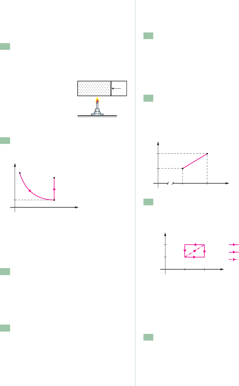 72 O trabalho realizado pelo gás nessa transformação, em joules, vale: a) 2,0 � 106 c) 1,5 � 106 e) 1,2 � 106 b) �1,5 � 106 d) �1,2 � 106 425 (Uneb-BA) Na montagem representada na fi- gura a chama faz o pistão deslocar-se para a direita, mantendo o gás a pressão e temperatura constantes. O volume e a pressão iniciais eram, respectivamente, de 5,00 litros e 5,00 N/cm2. O volume foi aumentado para 7,50 litros. A fração de energia da chama que o gás converteu em energia mecâ- nica é, em J, igual a: a) 375 b) 125 c) 37,5 d) 25,0 e) 12,5 426 (UNI-RIO) Um gás, inicialmente a 0 °C, sofre a transformação A → B → C representada no diagra- ma p � V da figura. c) não troca – a mesma d) troca – menor que a e) troca – maior que a 429 (UEMA) Sobre um sistema realiza-se um traba- lho de 3 000 J e, em resposta, ele fornece 500 cal de calor durante o mesmo intervalo de tempo. A variação de energia interna do sistema durante esse processo é: (Dado: 1 cal � 4,2 J.) a) �2 500 J c) �900 J e) �2 100 J b) �990 J d) �2 100 J 430 (UFES) A figura mostra a variação do volume de um gás ideal, à pressão constante de 4 N/m2, em função da temperatura. Sabe-se que, durante a trans- formação de estado de A a B, o gás recebeu uma quantidade de calor igual a 20 joules. A variação da energia interna do gás entre os estados A e B foi de: p (atm) V (�) 1,0 0 A C B V (m3) T (k) 1,0 2,0 A B 100 200 P (N/m2) V (m3) 100 200 A B 0,1 0,2 processo I processo II processo III ←� f a) a variação da energia interna na transformação isotérmica b) a pressão do gás, em atm, quando ele se encon- tra no estado C, considerando que, nesse estado, o gás está à temperatura de 273 °C 427 (UEL-PR) Fornecem-se 5,0 calorias de energia sob forma de calor a um sistema termodinâmico, enquanto se realiza sobre ele trabalho de 13 joules. Nessa transformação, a variação de energia interna do sistema é, em joules: (Dado: 1,0 cal � 4,2 J) a) �8 b) 8 c) 13 d) 21 e) 34 428 (UFSM-RS) Um gás ideal sofre uma expansão adiabática. Então, o gás ______ energia na forma de calor com a vizinhança, e a sua temperatura final é ______ inicial. Assinale a alternativa que completa, corretamente, as lacunas. a) não troca – menor que a b) não troca – maior que a a) 4 J b) 16 J c) 24 J d) 380 J e) 420 J 431 (UFCE) Um gás sofre uma série de transforma- ções com estado inicial A e estado final B, como mostra a figura. A energia interna do estado A é UA � 1 000 J e a do estado B é UB � 2 000 J. Calcule para cada uma das afirmações indicadas: a) a variação da energia interna b) o trabalho realizado (Diga também se foi feito pelo gás ou sobre o gás.) c) o calor trocado 432 (IME) Um cilindro contém oxigênio à pressão de 2 atmosferas e ocupa um volume de 3 litros à temperatura de 300 K. O gás, cujo comportamento é considerado ideal, executa um ciclo termodinâmico através dos seguintes processos: Processo 1 – 2: aquecimento à pressão constante até 500 K. Sabendo-se que transformação gasosa entre os estados A e B é isotérmica e en- tre B e C é iso- métrica, deter- mine: