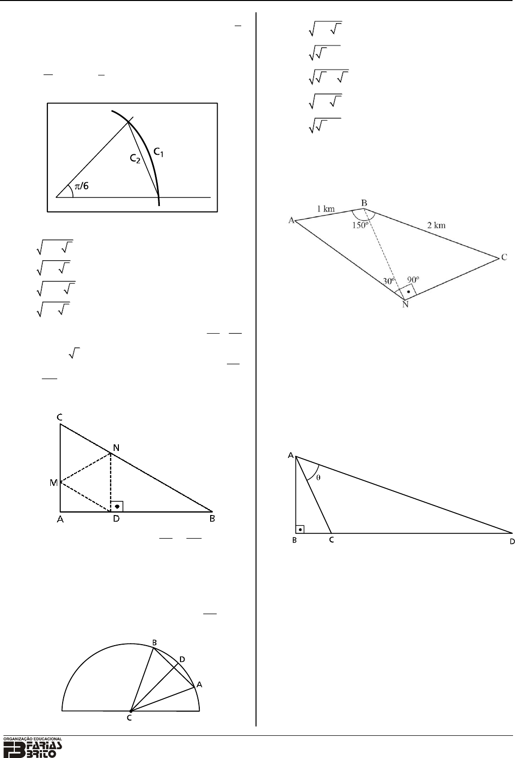MÓDULO DE ESTUDO – VESTIBULARES PAULISTAS 11 020.504 - 145566/19 4. Numa circunferência, c1 é o comprimento do arco de 6 radianos e c2 é o comprimento da secante determinada por este arco, como ilustrado na figura a seguir. Então, a razão 1 2 c c é igual a 6 multiplicado por: a) 2 b) 1 2 3 c) 2 3 d) 2 2 3 e) 3 3 5. O triângulo retângulo ABC, cujos catetos AC e AB medem 1 e 3, respectivamente, é dobrado de tal forma que o vértice C coincida com o ponto D do lado AB. Seja MN o segmento ao longo do qual ocorreu a dobra. Sabendo que NDB é reto, determine a) o comprimento dos segmentos CN e CM. b) a área do triângulo CMN. 6. Em uma semicircunferência de centro C e raio R, inscreve-se um triângulo equilátero ABC. Seja D o ponto onde a bissetriz do ângulo ACB intercepta a semicircunferência. O comprimento da corda AD é: a) R 2 3 d) R 3 1 b) R 3 3 e) R 3 2 c) R 2 1 7. Sejam A, B, C e N quatro pontos em um mesmo plano, conforme mostra a figura a seguir. a) Calcule o raio da circunferência que passa pelos pontos A, B e N. b) Calcule o comprimento do segmento NB. 8. Considere o triângulo retângulo ABD exibido na figura a seguir, em que AB = 2 cm, BC = 1 cm e CD = 5 cm. Então, o ângulo é igual a a) 15º b) 30º c) 45º d) 60º 9. Seja x um número real tal que sen x + cos x = 0,2. Logo, |sen x – cos x| é igual a a) 0,5 b) 0,8 c) 1,1 d) 1,4