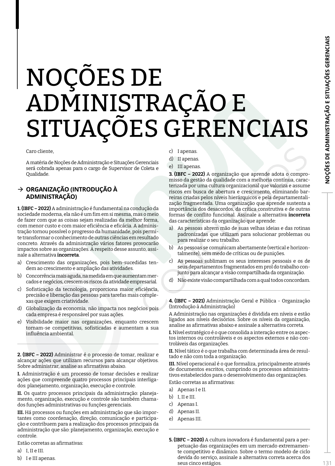 Ste ffa ny d a S ilv a A bid el - 1 64 .02 3.5 27 -2 1 N O ÇÕ ES D E A D M IN IS TR A ÇÃ O E S IT U A ÇÕ ES G ER EN CI A IS 131 NOÇÕES DE ADMINISTRAÇÃO E SITUAÇÕES GERENCIAIS Caro cliente, A matéria de Noções de Administração e Situações Gerenciais será cobrada apenas para o cargo de Supervisor de Coleta e Qualidade. Æ ORGANIZAÇÃO (INTRODUÇÃO À ADMINISTRAÇÃO) 1. (IBFC – 2022) A administração é fundamental na condução da sociedade moderna, ela não é um fim em si mesma, mas o meio de fazer com que as coisas sejam realizadas da melhor forma, com menor custo e com maior eficiência e eficácia. A adminis- tração tornou possível o progresso da humanidade, pois permi- te transformar o conhecimento de outras ciências em resultado concreto. Através da administração vários fatores provocarão impactos sobre as organizações. A respeito desse assunto, assi- nale a alternativa incorreta. a) Crescimento das organizações, pois bem-sucedidas ten- dem ao crescimento e ampliação das atividades. b) Concorrência mais aguda, na medida em que aumentam mer- cados e negócios, crescem os riscos da atividade empresarial. c) Sofisticação da tecnologia, proporciona maior eficiência, precisão e liberação das pessoas para tarefas mais comple- xas que exigem criatividade. d) Globalização da economia, não impacta nos negócios pois cada empresa é responsável por suas ações. e) Visibilidade maior nas organizações, enquanto crescem tornam-se competitivas, sofisticadas e aumentam a sua influência ambiental. 2. (IBFC – 2022) Administrar é o processo de tomar, realizar e alcançar ações que utilizam recursos para alcançar objetivos. Sobre administrar, analise as afirmativas abaixo. I. Administração é um processo de tomar decisões e realizar ações que compreende quatro processos principais interliga- dos: planejamento, organização, execução e controle. II. Os quatro processos principais da administração: planeja- mento, organização, execução e controle são também chama- dos funções administrativas ou funções gerenciais. III. Há processos ou funções em administração que são impor- tantes como coordenação, direção, comunicação e participa- ção e contribuem para a realização dos processos principais da administração que são: planejamento, organização, execução e controle. Estão corretas as afirmativas: a) I, II e III. b) I e III apenas. c) I apenas. d) II apenas. e) III apenas. 3. (IBFC – 2022) A organização que aprende adota o compro- misso da gestão da qualidade com a melhoria contínua, carac- terizada por uma cultura organizacional que valoriza e assume riscos em busca de abertura e crescimento, eliminando bar- reiras criadas pelos níveis hierárquicos e pela departamentali- zação fragmentada. Uma organização que aprende sustenta a importância dos desacordos, da crítica construtiva e de outras formas de conflito funcional. Assinale a alternativa incorreta das características da organização que aprende: a) As pessoas abrem mão de suas velhas ideias e das rotinas padronizadas que utilizam para solucionar problemas ou para realizar o seu trabalho. b) As pessoas se comunicam abertamente (vertical e horizon- talmente), sem medo de críticas ou de punições. c) As pessoas sublimam os seus interesses pessoais e os de seus departamentos fragmentados em prol do trabalho con- junto para alcançar a visão compartilhada da organização. d) Não existe visão compartilhada com a qual todos concordam. 4. (IBFC – 2021) Administração Geral e Pública - Organização (Introdução à Administração) A Administração nas organizações é dividida em níveis e estão ligados aos níveis decisórios. Sobre os níveis da organização, analise as afirmativas abaixo e assinale a alternativa correta. I. Nível estratégico é o que consolida a interação entre os aspec- tos internos ou controláveis e os aspectos externos e não con- troláveis das organizações. II. Nível tático é o que trabalha com determinada área de resul- tado e não com toda a organização. III. Nível operacional é o que formaliza, principalmente através de documentos escritos, cumprindo os processos administra- tivos estabelecidos para o desenvolvimento das organizações. Estão corretas as afirmativas: a) Apenas I e II. b) I, II e III. c) Apenas I. d) Apenas II. e) Apenas III. 5. (IBFC – 2020) A cultura inovadora é fundamental para a per- petuação das organizações em um mercado extremamen- te competitivo e dinâmico. Sobre o termo modelo de ciclo devida do serviço, assinale a alternativa correta acerca dos seus cinco estágios. O conteúdo deste livro eletrônico é licenciado para Steffany da Silva Abidel - 164.023.527-21, vedada, por quaisquer meios e a qualquer título, a sua reprodução, cópia, divulgação ou distribuição, sujeitando-se aos infratores à responsabilização civil e criminal.