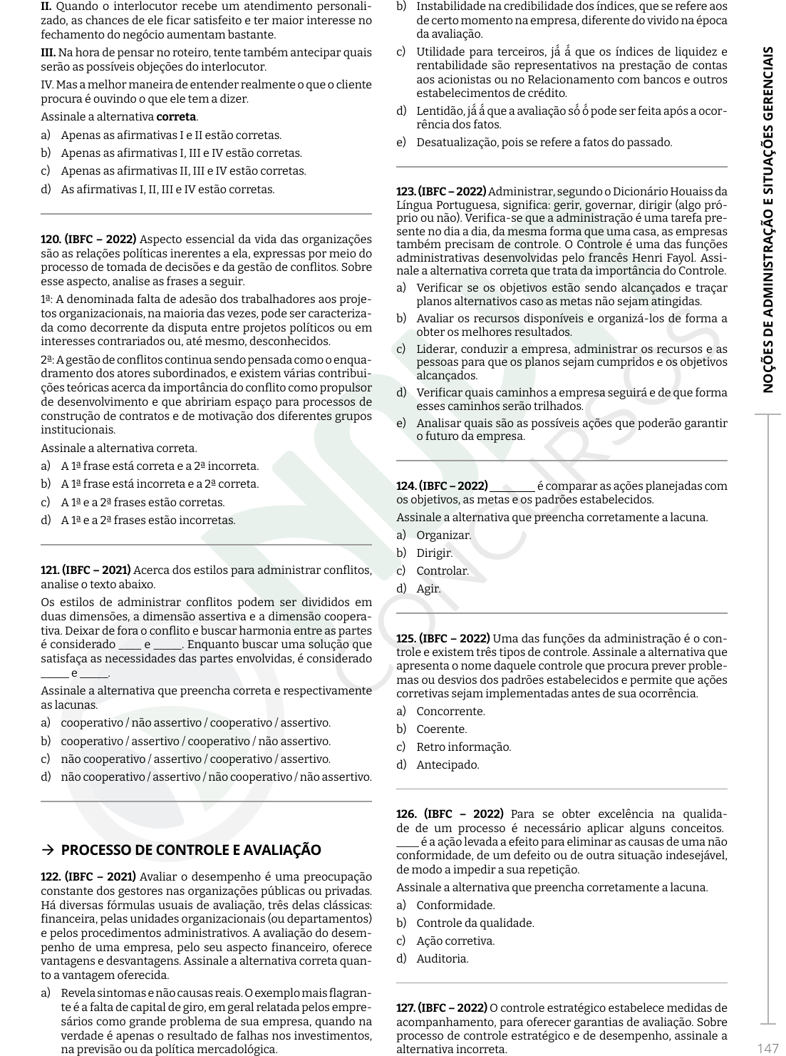Ste ffa ny d a S ilv a A bid el - 1 64 .02 3.5 27 -2 1 N O ÇÕ ES D E A D M IN IS TR A ÇÃ O E S IT U A ÇÕ ES G ER EN CI A IS 147 II. Quando o interlocutor recebe um atendimento personali- zado, as chances de ele ficar satisfeito e ter maior interesse no fechamento do negócio aumentam bastante. III. Na hora de pensar no roteiro, tente também antecipar quais serão as possíveis objeções do interlocutor. IV. Mas a melhor maneira de entender realmente o que o cliente procura é ouvindo o que ele tem a dizer. Assinale a alternativa correta. a) Apenas as afirmativas I e II estão corretas. b) Apenas as afirmativas I, III e IV estão corretas. c) Apenas as afirmativas II, III e IV estão corretas. d) As afirmativas I, II, III e IV estão corretas. 120. (IBFC – 2022) Aspecto essencial da vida das organizações são as relações políticas inerentes a ela, expressas por meio do processo de tomada de decisões e da gestão de conflitos. Sobre esse aspecto, analise as frases a seguir. 1ª: A denominada falta de adesão dos trabalhadores aos proje- tos organizacionais, na maioria das vezes, pode ser caracteriza- da como decorrente da disputa entre projetos políticos ou em interesses contrariados ou, até mesmo, desconhecidos. 2ª: A gestão de conflitos continua sendo pensada como o enqua- dramento dos atores subordinados, e existem várias contribui- ções teóricas acerca da importância do conflito como propulsor de desenvolvimento e que abririam espaço para processos de construção de contratos e de motivação dos diferentes grupos institucionais. Assinale a alternativa correta. a) A 1ª frase está correta e a 2ª incorreta. b) A 1ª frase está incorreta e a 2ª correta. c) A 1ª e a 2ª frases estão corretas. d) A 1ª e a 2ª frases estão incorretas. 121. (IBFC – 2021) Acerca dos estilos para administrar conflitos, analise o texto abaixo. Os estilos de administrar conflitos podem ser divididos em duas dimensões, a dimensão assertiva e a dimensão coopera- tiva. Deixar de fora o conflito e buscar harmonia entre as partes é considerado ____ e _____. Enquanto buscar uma solução que satisfaça as necessidades das partes envolvidas, é considerado _____ e _____. Assinale a alternativa que preencha correta e respectivamente as lacunas. a) cooperativo / não assertivo / cooperativo / assertivo. b) cooperativo / assertivo / cooperativo / não assertivo. c) não cooperativo / assertivo / cooperativo / assertivo. d) não cooperativo / assertivo / não cooperativo / não assertivo. Æ PROCESSO DE CONTROLE E AVALIAÇÃO 122. (IBFC – 2021) Avaliar o desempenho é uma preocupação constante dos gestores nas organizações públicas ou privadas. Há diversas fórmulas usuais de avaliação, três delas clássicas: financeira, pelas unidades organizacionais (ou departamentos) e pelos procedimentos administrativos. A avaliação do desem- penho de uma empresa, pelo seu aspecto financeiro, oferece vantagens e desvantagens. Assinale a alternativa correta quan- to a vantagem oferecida. a) Revela sintomas e não causas reais. O exemplo mais flagran- te é a falta de capital de giro, em geral relatada pelos empre- sários como grande problema de sua empresa, quando na verdade é apenas o resultado de falhas nos investimentos, na previsão ou da política mercadológica. b) Instabilidade na credibilidade dos índices, que se refere aos de certo momento na empresa, diferente do vivido na época da avaliação. c) Utilidade para terceiros, já́ á́ que os índices de liquidez e rentabilidade são representativos na prestação de contas aos acionistas ou no Relacionamento com bancos e outros estabelecimentos de crédito. d) Lentidão, já́ á́ que a avaliação só́ ó́ pode ser feita após a ocor- rência dos fatos. e) Desatualização, pois se refere a fatos do passado. 123. (IBFC – 2022) Administrar, segundo o Dicionário Houaiss da Língua Portuguesa, significa: gerir, governar, dirigir (algo pró- prio ou não). Verifica-se que a administração é uma tarefa pre- sente no dia a dia, da mesma forma que uma casa, as empresas também precisam de controle. O Controle é uma das funções administrativas desenvolvidas pelo francês Henri Fayol. Assi- nale a alternativa correta que trata da importância do Controle. a) Verificar se os objetivos estão sendo alcançados e traçar planos alternativos caso as metas não sejam atingidas. b) Avaliar os recursos disponíveis e organizá-los de forma a obter os melhores resultados. c) Liderar, conduzir a empresa, administrar os recursos e as pessoas para que os planos sejam cumpridos e os objetivos alcançados. d) Verificar quais caminhos a empresa seguirá e de que forma esses caminhos serão trilhados. e) Analisar quais são as possíveis ações que poderão garantir o futuro da empresa. 124. (IBFC – 2022) é comparar as ações planejadas com os objetivos, as metas e os padrões estabelecidos. Assinale a alternativa que preencha corretamente a lacuna. a) Organizar. b) Dirigir. c) Controlar. d) Agir. 125. (IBFC – 2022) Uma das funções da administração é o con- trole e existem três tipos de controle. Assinale a alternativa que apresenta o nome daquele controle que procura prever proble- mas ou desvios dos padrões estabelecidos e permite que ações corretivas sejam implementadas antes de sua ocorrência. a) Concorrente. b) Coerente. c) Retro informação. d) Antecipado. 126. (IBFC – 2022) Para se obter excelência na qualida- de de um processo é necessário aplicar alguns conceitos. ____ é a ação levada a efeito para eliminar as causas de uma não conformidade, de um defeito ou de outra situação indesejável, de modo a impedir a sua repetição. Assinale a alternativa que preencha corretamente a lacuna. a) Conformidade. b) Controle da qualidade. c) Ação corretiva. d) Auditoria. 127. (IBFC – 2022) O controle estratégico estabelece medidas de acompanhamento, para oferecer garantias de avaliação. Sobre processo