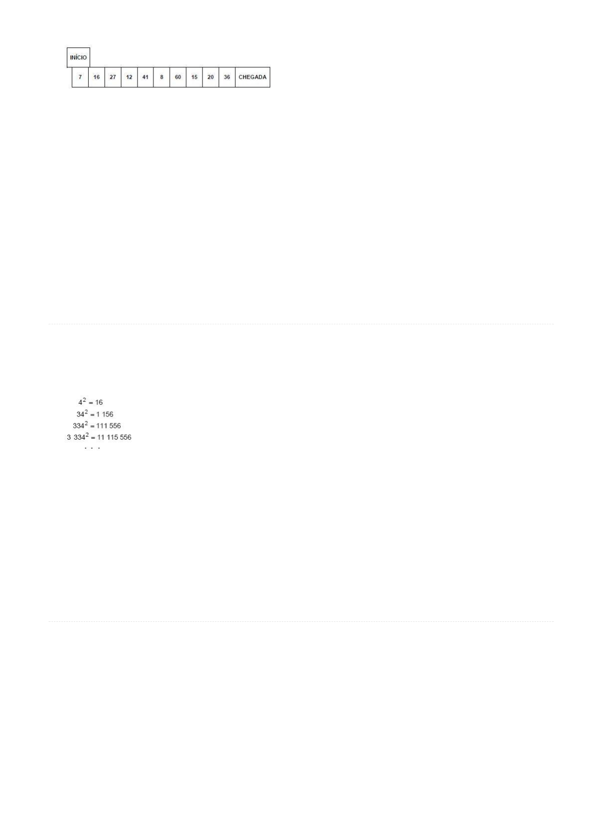 09/12/2017 Questões de Concursos e Perguntas de Concursos Públicos- Aprova Concursos https://www.aprovaconcursos.com.br/questoes-de-concurso/questoes/disciplina/Racioc%25C3%25ADnio+L%25C3%25B3gico/banca/FCC/filtro/2… 5/7 O tabuleiro a seguir é usado em um jogo que uma professora de Matemática costuma propor a seus alunos do 6º ano. A cada rodada, cada jogador, inicialmente colocado na casa onde está marcado o número 7, deve jogar um dado numerado de 1 a 6 e dividir o número da casa onde se encontra pela pontuação obtida no dado. O resto dessa divisão indicará a quantidade de casas que ele deverá avançar. Por exemplo, se na primeira rodada um jogador tirar 5, ele deverá avançar 2 casas, que é o resto da divisão de 7 por 5, chegando à casa onde está marcado o número 27. O jogador que primeiro atingir a casa onde está escrito CHEGADA é o vencedor. Se um jogador cair em uma determinada casa do tabuleiro, ele não poderá mais ganhar o jogo, pois não conseguirá mais avançar a partir daquela casa. Por esse motivo, essa casa é chamada de "buraco negro". Para que um jogador caia no "buraco negro", ele deverá, necessariamente, estar numa outra casa especí�ca do tabuleiro e, ao jogar o dado, obter pontuação igual a a) 2 b) 3 c) 4 d) 5 e) 6 687) Q104404 (/questoes-de-concurso/questao/104404) (/questoes-de-concurso/questao/104404#imprimir) Provas: FCC - 2009 - TCE-GO - Técnico de Controle Externo - Área Administrativa (/questoes-de-concurso/prova/fcc-2009-tce-go-tecnico-de-controle-externo-area-administrativa) Disciplina: Raciocínio Lógico (/questoes-de-concurso/disciplina/raciocinio-logico) - Assuntos: 2. Equivalências lógicas (/questoes-de-concurso/questoes/assunto/2.+Equival%C3%AAncias+l%C3%B3gicas) Alguns resultados curiosos podem ser observados em algumas operações matemáticas, como mostra o exemplo seguinte: O exemplo dado, permite que se conclua corretamente que a soma dos algarismos do número 333 333 334 é um número compreendido entre2 a) 100 e 125 b) 75 e 100 c) 50 e 75 d) 25 e 50 e) 0 e 25 688) Q80092 (/questoes-de-concurso/questao/80092) (/questoes-de-concurso/questao/80092#imprimir) Provas: FCC - 2009 - SEFAZ-SP - Agente Fiscal de Rendas - Prova 1 (/questoes-de-concurso/prova/fcc-2009-sefaz-sp-agente-fiscal-de-rendas-prova-1) Disciplina: Raciocínio Lógico (/questoes-de-concurso/disciplina/raciocinio-logico) - Assuntos: 4. Argumentação (/questoes-de-concurso/questoes/assunto/4.+Argumenta%C3%A7%C3%A3o) Considere as seguintes a�rmações: I. Se ocorrer uma crise econômica, então o dólar não subirá. II. Ou o dólar subirá, ou os salários serão reajustados, mas não ambos. III. Os salários serão reajustados se, e somente se, não ocorrer uma crise econômica. Sabendo que as três a�rmações são verdadeiras, é correto concluir que, necessariamente, a) o dólar não subirá, os salários não serão reajustados e não ocorrerá uma crise econômica. b) o dólar subirá, os salários não serão reajustados e ocorrerá uma crise econômica. c) o dólar não subirá, os salários serão reajustados e ocorrerá uma crise econômica. https://www.aprovaconcursos.com.br/questoes-de-concurso/prova/fcc-2009-sefaz-sp-agente-fiscal-de-rendas-prova-1 https://www.aprovaconcursos.com.br/questoes-de-concurso/disciplina/raciocinio-logico https://www.aprovaconcursos.com.br/questoes-de-concurso/questao/80092 https://www.aprovaconcursos.com.br/questoes-de-concurso/questoes/assunto/4.+Argumenta%C3%A7%C3%A3o https://www.aprovaconcursos.com.br/questoes-de-concurso/questao/104404#imprimir https://www.aprovaconcursos.com.br/questoes-de-concurso/questao/80092#imprimir https://www.aprovaconcursos.com.br/questoes-de-concurso/questoes/assunto/2.+Equival%C3%AAncias+l%C3%B3gicas https://www.aprovaconcursos.com.br/questoes-de-concurso/disciplina/raciocinio-logico https://www.aprovaconcursos.com.br/questoes-de-concurso/questao/104404 https://www.aprovaconcursos.com.br/questoes-de-concurso/prova/fcc-2009-tce-go-tecnico-de-controle-externo-area-administrativa