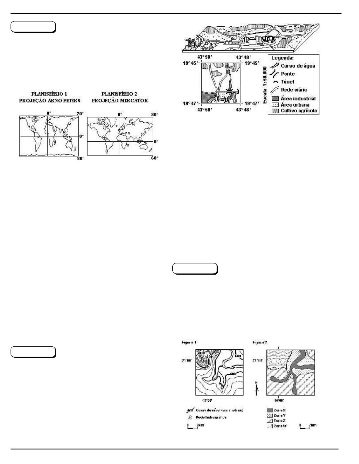 Questão 731 Observe os planisférios, construídos a partir de projeções diferentes. A partir da análise e da interpretação dos planisférios, todas as alternativas estão corretas, EXCETO onsiderando-se que a paisagem representada no bloco-diagrama e no mapa é a mesma, é INCORRETO afirmar que a) a interpretação do mapa permite constatar as variações topográficas da área retratada, em que se distinguem um relevo plano próximo ao rio e montanhoso ao norte. a) A representação correspondente ao Planisfério 1 expressa as reais proporções entre os diferentes continentes que compõem a superfície terrestre. b) A representação correspondente ao Planisfério 2 mostra deformações de áreas que são tanto maiores quanto mais elevadas as latitudes. c) A representação correspondente ao Planisfério 1 possibilita a percepção correta da configuração das massas continentais, principalmente nas regiões intertropicais. d) A representação correspondente ao Planisfério 2 é utilizada intensamente, na navegação aérea e marítima, pela viabilidade de se traçarem nela, com precisão, os rumos de uma rota. e) A cartografia das áreas situadas nas latitudes superiores a 80°N e S é inviável, nas duas representações, devido ao excesso de deformação decorrente do processo de projeção. Questão 732 Observe o bloco-diagrama e o mapa. b) a legenda que acompanha o mapa expressa, por meio de uma simbologia específica, os principais elementos da paisagem observados no bloco-diagrama. c) a paisagem retratada no bloco-diagrama foi simplificada no mapa, embora possam ser observadas, em ambos, as principais formas de aproveitamento do espaço. d) a presença de uma rede de coordenadas geográficas, formada por meridianos e paralelos, permite a localização segura da paisagem retratada no mapa. Questão 733 Analise o mapa topográfico da figura 1, em que estão representados os principais elementos do relevo de um trecho do território brasileiro. Analise, agora, a proposta de zoneamento ambiental da figura 2, para essa mesma área elaborada por uma equipe de especialistas em planejamento territorial: 195