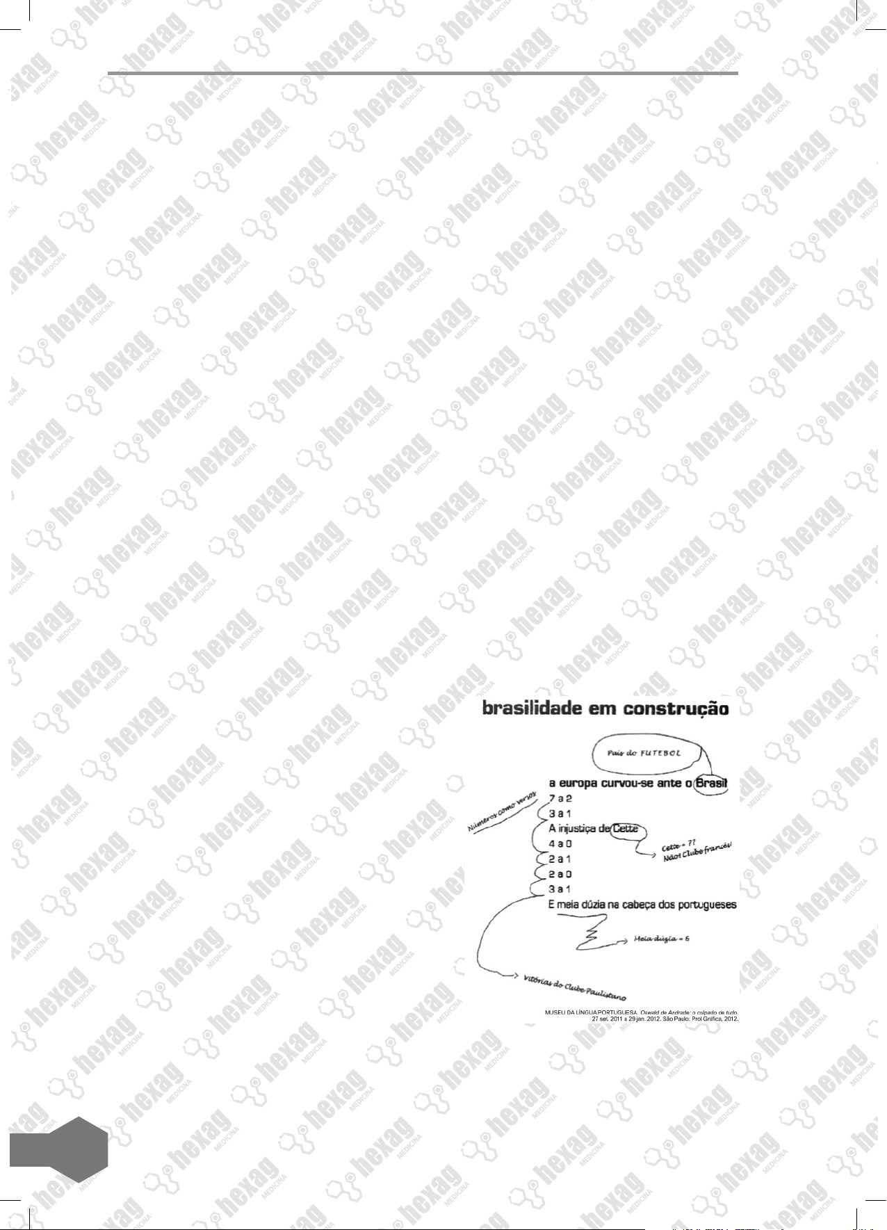 134 24. (Enem) Vei, a Sol Ora o pássaro careceu de fazer necessidade, fez e o herói ficou escorrendo sujeira de uru- bu. Já era de madrugadinha e o tempo es- tava inteiramente frio. Macunaíma acordou tremendo, todo lambuzado. Assim mesmo examinou bem a pedra mirim da ilhota para vê si não havia alguma cova com dinheiro enterrado. Não havia não. Nem a correnti- nha encantada de prata que indica pro es- colhido, tesouro de holandês. Havia só as formigas jaquitaguas ruivinhas. Então passou Caiuanogue, a estrela da ma- nhã. Macunaíma já meio enjoado de tanto viver pediu pra ela que o carregasse pro céu. Caiuanogue foi se chegando porém o herói fedia muito. – Vá tomar banho! – ela fez. E foi-se embora. Assim nasceu a expressão “Vá tomar banho” que os brasileiros empregam se referindo a certos imigrantes europeus. ANDRADE, M. Macunaíma: o herói sem nenhum caráter. Rio de Janeiro: Agir, 2008. O fragmento de texto faz parte do capítulo VII, intitulado “Vei, a Sol”, do livro Macu- naíma, de Mário de Andrade, pertencente à primeira fase do Modernismo brasileiro. Considerando a linguagem empregada pelo narrador, é possível identificar: a) resquícios do discurso naturalista usado pe- los escritores do século XIX. b) ausência de linearidade no tratamento do tempo, recurso comum ao texto narrativo da primeira fase modernista. c) referência à fauna como meio de denunciar o primitivismo e o atraso de algumas regiões do país. d) descrição preconceituosa dos tipos popula- res brasileiros, representados por Macunaí- ma e Caiuanogue. e) uso da linguagem coloquial e de temáticas do lendário brasileiro como meio de valori- zação da cultura popular nacional. 25. (Enem) Evocação do Recife A vida não me chegava pelos jornais nem pe- los livros Vinha da boca do povo na língua errada do povo Língua certa do povo Porque ele é que fala gostoso o português do Brasil Ao passo que nós O que fazemos É macaquear A sintaxe lusíada… BANDEIRA, M. Estrela da vida inteira. Rio de Janeiro: Nova Fronteira, 2007. Segundo o poema de Manuel Bandeira, as variações linguísticas originárias das classes populares devem ser: a) satirizadas, pois as várias formas de se falar o português no Brasil ferem a língua portu- guesa autêntica. b) questionadas, pois o povo brasileiro esquece a sintaxe da língua portuguesa. c) subestimadas, pois o português “gostoso” de Portugal deve ser a referência de correção linguística. d) reconhecidas, pois a formação cultural brasi- leira é garantida por meio da fala do povo. e) reelaboradas, pois o povo “macaqueia” a lín- gua portuguesa original. 26. (Enem) Cena O canivete voou E o negro comprado na cadeia Estatelou de costas E bateu coa cabeça na pedra ANDRADE, O. Pau-brasil. São Paulo: Globo, 2001. O Modernismo representou uma ruptura com os padrões formais e temáticos até então vi- gentes na literatura brasileira. Seguindo es- ses aspectos, o que caracteriza o poema Cena como modernista é o(a): a) construção linguística por meio de neologismo. b) estabelecimento de um campo semântico inusitado. c) configuração de um sentimentalismo conci- so e irônico. d) subversão de lugares-comuns tradicionais. e) uso da técnica de montagem de imagens jus- tapostas. 27. (Enem) O poema de Oswald de Andrade remonta à ideia de que a brasilidade está relacionada ao futebol. Quanto à questão da identidade nacional, as anotações em torno dos versos constituem: