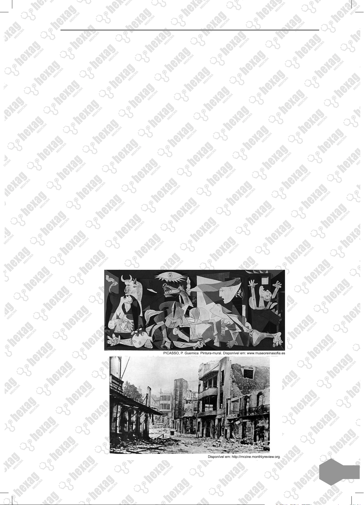 185 10. O objetivo de tomar Paris marchando em direção ao Oeste era, para Hitler, uma forma de consolidar sua liderança no continente. Com esse intuito, entre abril e junho de 1940, ele invadiu a Dinamar- ca, a Noruega, a Bélgica e a Holanda. As tropas francesas se posicionaram na Linha Maginot, uma linha de defesa com trincheiras, na tentativa de conter a invasão alemã. Para a Alemanha, o resultado dessa invasão foi a) a ocupação de todo o território francês, usando-o como base para a conquista da Suíça e da Espanha durante a segunda fase da guerra. b) a tomada do território francês, que foi então usado como base para a ocupação nazista da África do Norte, durante a guerra de trincheiras. c) a posse de apenas parte do território, devido à resistência armada do exército francês na Linha Maginot. d) a vitória parcial, já que, após o avanço inicial, teve de recuar, devido à resistência dos blindados do ge- neral De Gaulle, em 1940. e) a vitória militar, com ocupação de parte da França, enquanto outra parte ficou sob controle do governo colaboracionista francês. 11. A conquista pelos ingleses de grandes áreas da Índia deu o impulso inicial à produção e venda or- ganizada de ópio. A Companhia das Índias Orientais obteve o monopólio da compra do ópio india- no e depois vendeu licenças para mercadores selecionados, conhecidos como “mercadores nativos”. Depois de vender ópio na China, esses mercadores depositavam a prata que recebiam por ele com agentes da companhia em Cantão, em troca de cartas de crédito; a companhia, por sua vez, usava a prata para comprar chá, porcelana e outros artigos que seriam vendidos na Inglaterra. SPENCE, J. Em busca da China moderna. São Paulo: Cia. das Letras, 1996 (adaptado). A análise das trocas comerciais citadas permite interpretar as relações de poder que foram estabe- lecidas. A partir desse pressuposto, o processo sócio-histórico identificado no texto é a) a expansão político-econômica de países do Oriente, iniciada nas últimas décadas do século XX. b) a consolidação do cenário político entreguerras, na primeira metade do século XX. c) o colonialismo europeu, que marcou a expansão europeia no século XV. d) o imperialismo, cujo ápice ocorreu na segunda metade do século XIX. e) as libertações nacionais, ocorridas na segunda metade do século XX. 12. Em 1937, Guernica, na Espanha, foi bombardeada sob o comando da força aérea da Alemanha na- zista, que apoiou os franquistas durante a Guerra Civil Espanhola (1936-1939).